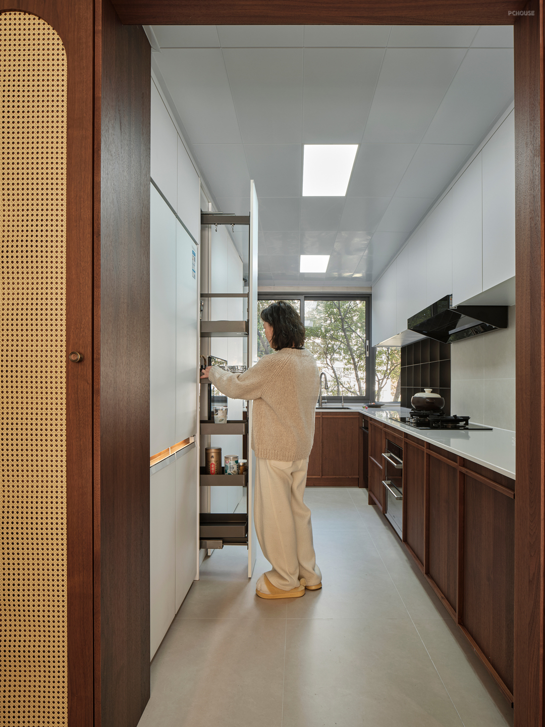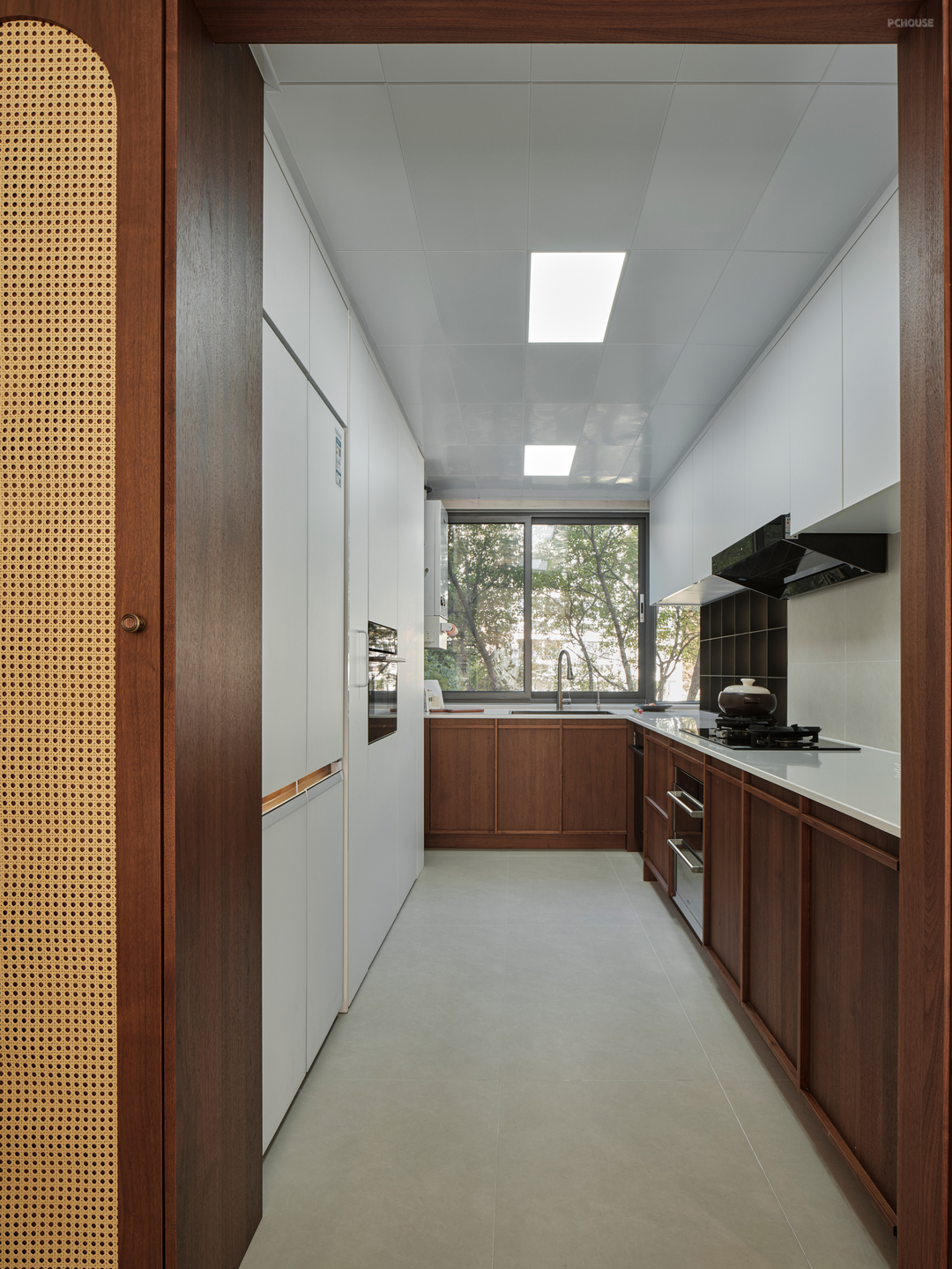 厨房整体布局呈流畅的U型,简约而规整,让每一寸空间都得到极致利用,操作动线一气呵成,从备菜、烹饪到收纳,行云流水,尽显便捷。