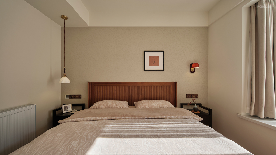 主卧以暖调米白基底铺陈,艺术漆赋予床头背景墙独特纹理,细腻而柔和,似是时光笔触留下的诗意痕迹,为空间铺陈出温暖且富有格调的底色。深棕色木质床头板,凭借天然的纹理与醇厚色泽,与背景墙的浅暖色调相互映衬,冷暖交织间,增添了空间的层次感与沉稳感。一侧复古壁灯,红棕灯罩与金属灯体散发着低调光泽,暖黄色灯光倾洒,与整体暖色调相呼应,营造出静谧浪漫氛围。另一侧的吊灯造型别致,白色灯罩宛如一朵优雅绽放的花朵,柔和的光线从灯罩中倾泻而出,与壁灯的暖光相互呼应,不仅在功能上为床侧提供照明,更在视觉上成为空间的一处亮点,丰富了整体的光影层次。