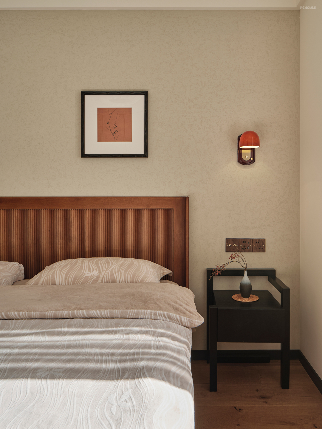 墙面的简约挂画,以一抹亮眼的橘红色块与简洁构图,成为视觉焦点,在暖调为主的空间里注入活泼与灵动,彰显主人的艺术品味。深黑色床头柜精致小巧,台上艺术花瓶插着几支小花,与周围暖色调形成对比,凸显自然意趣。