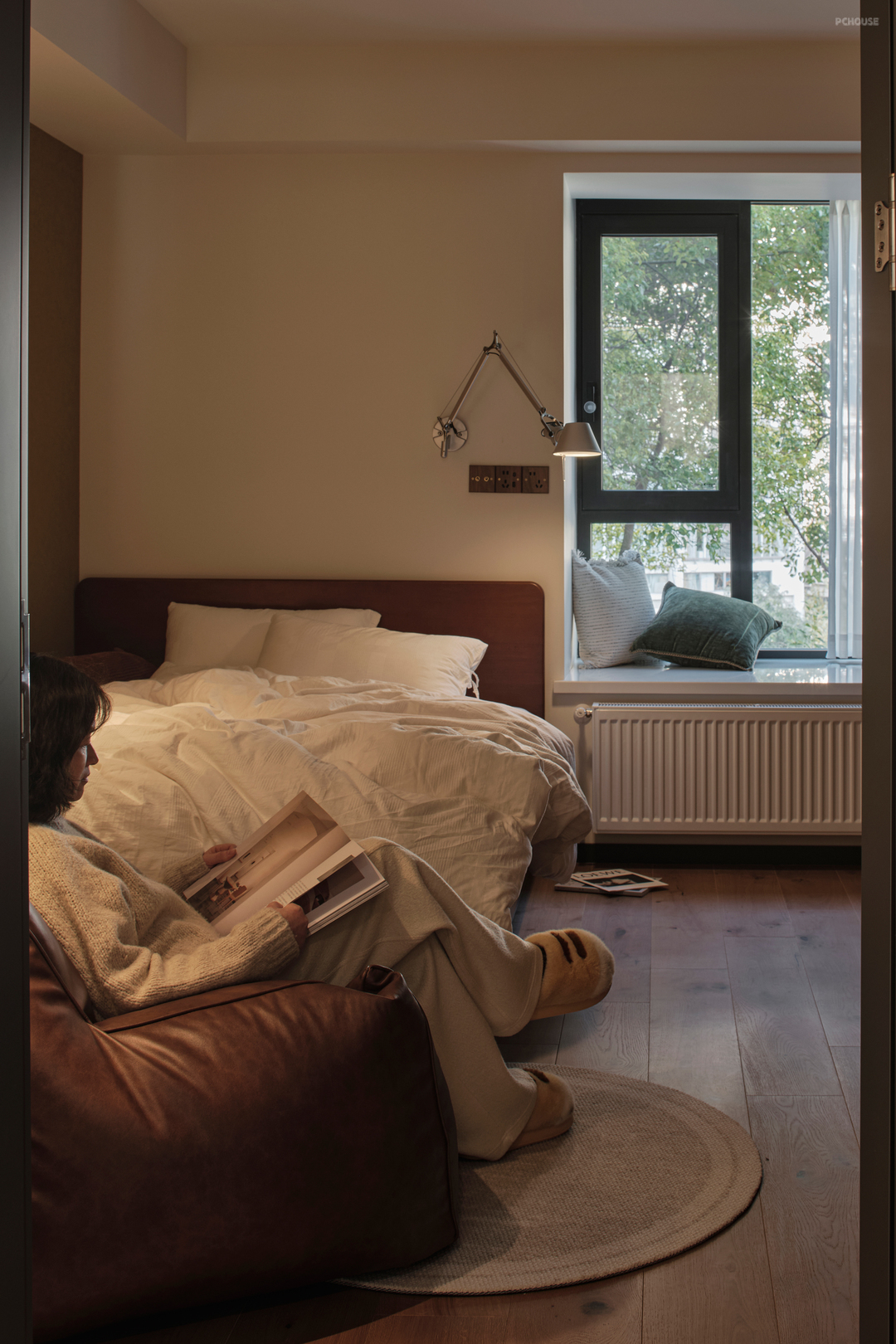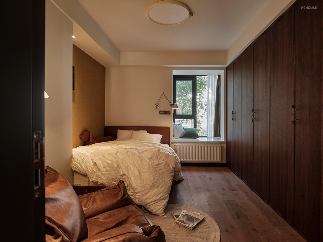 踏入这间次卧,温馨与舒适扑面而来,整体色调以暖咖与米白交织,营造出柔和而宁静的氛围。浅咖色艺术漆墙面宛如冬日暖阳,搭配洁白的床品,视觉上温暖又治愈。木质地板纹理自然,为空间注入质朴的生命力,行走其上,满是踏实与安心。棕色床头板与深木色衣柜相呼应,沉稳中带着雅致。在飘窗上放置柔软抱枕,摇身一变成为惬意角落。白日里,阳光透过窗户倾洒,绿植摇曳生姿,捧一本书、泡一杯茶,便能沉浸在悠闲时光中。金属壁灯造型时尚,暖光轻泻,为夜晚阅读或思考营造温馨氛围。