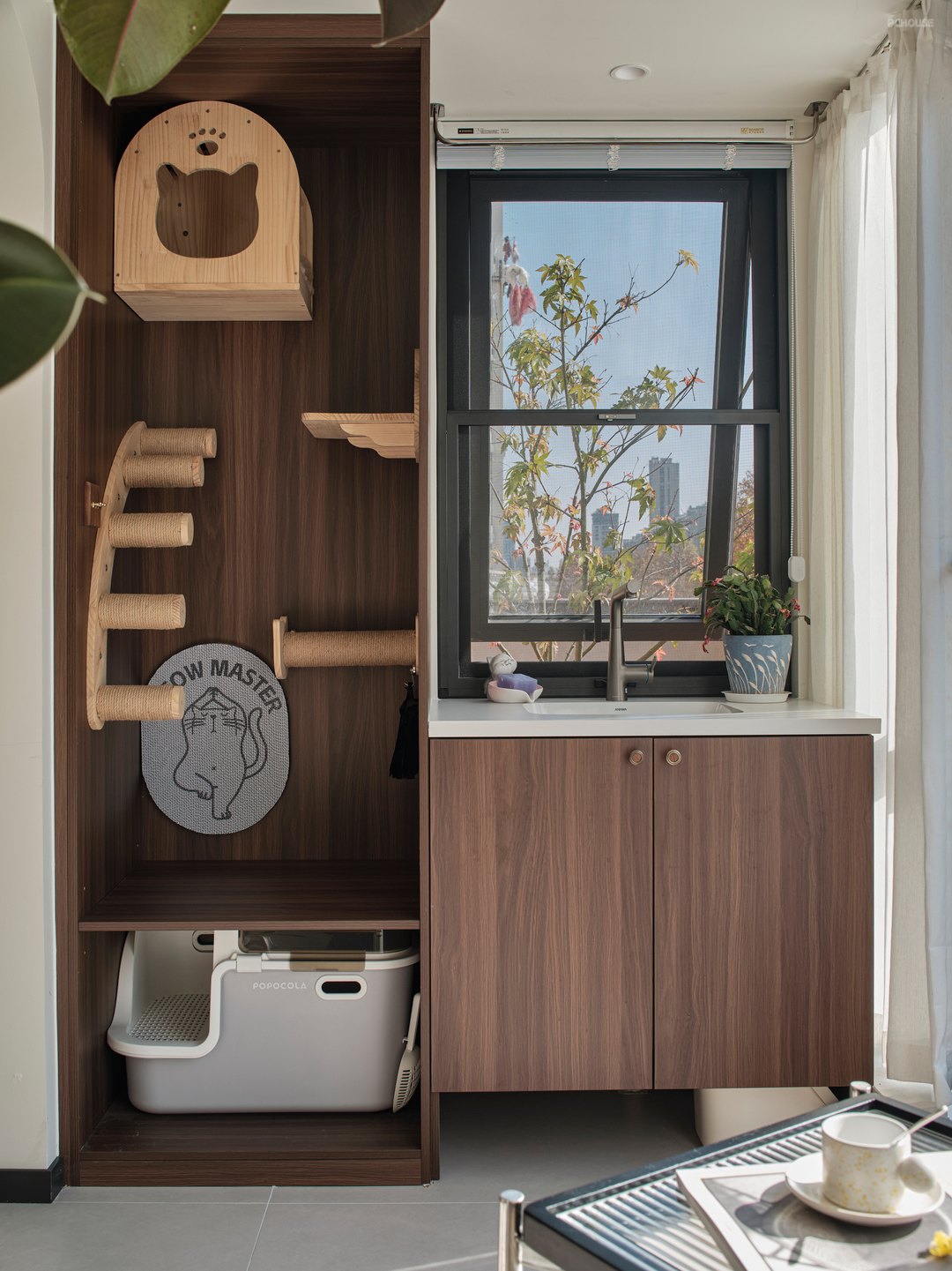 步入阳台一隅,深棕色的木质柜体,以其温润的色泽与细腻的纹理,构建起空间的主调。它犹如一位沉默而可靠的守护者,沉稳之中散发着柔和的温度。猫窝、爬架、磨爪柱一应俱全,尽显对喵星人的宠溺。窗边的洗手台,设计简约而不失功能性,流畅的线条与柜体风格相得益彰。阳光透过窗户,毫无保留地倾洒进来,柔和的光线与窗外的绿意交织,模糊了室内与室外的界限,营造出一种惬意而自然的氛围。