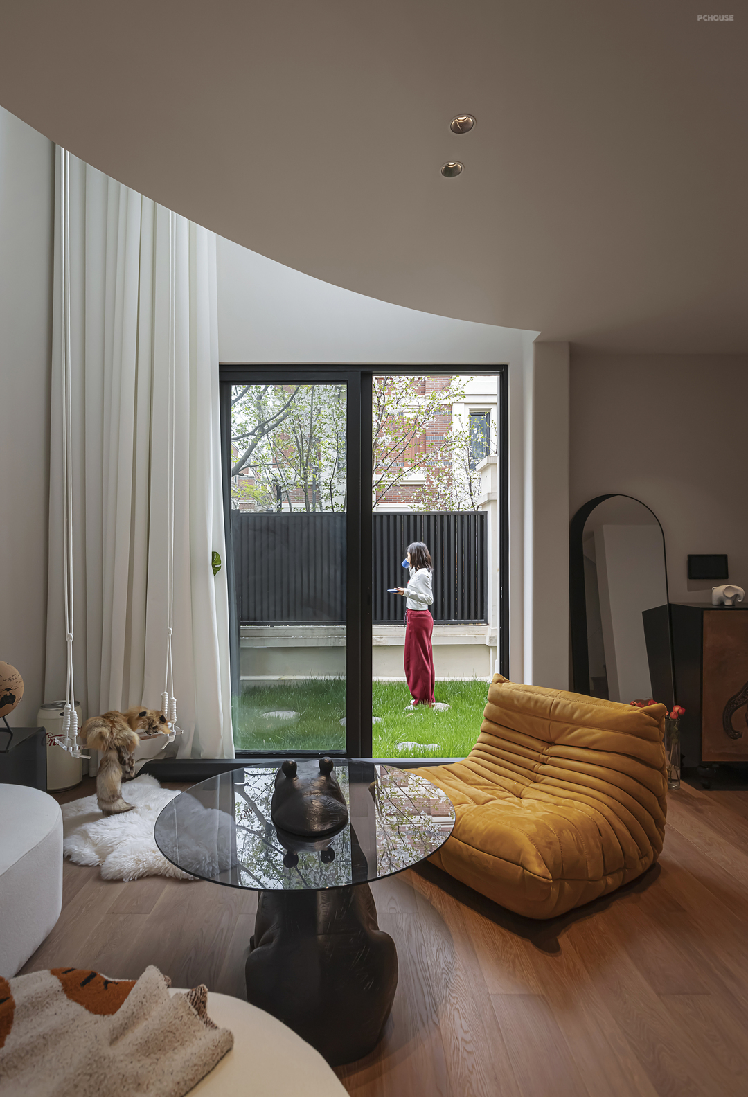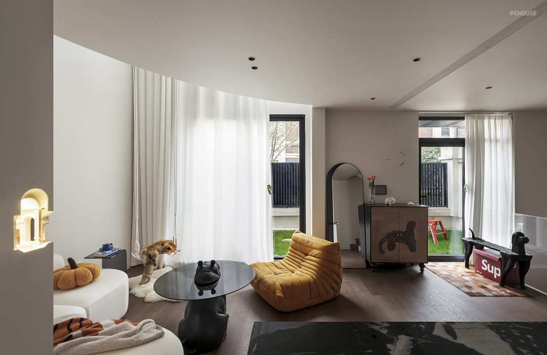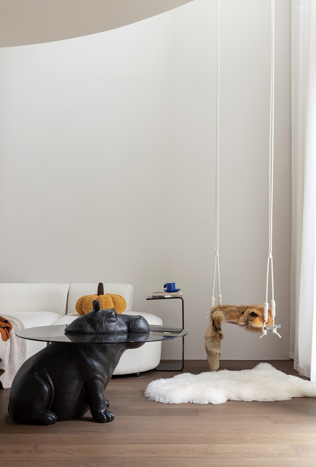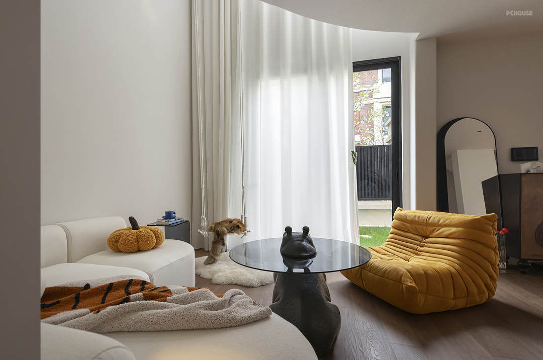 客厅陈列憨态可掬的河马茶几,玻璃与实木结合,提升整体质感。黑色纹理与白色秋千线条相辅相成,甚是和谐。