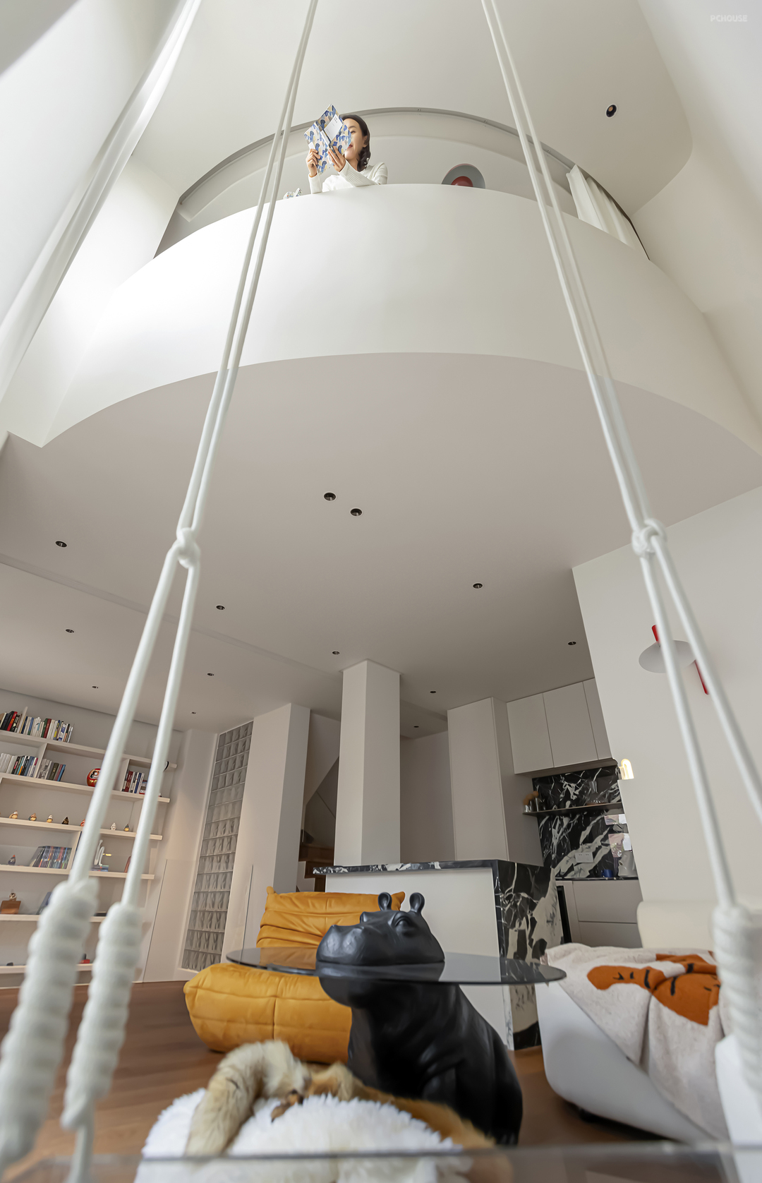 客厅之间最大的亮点,是在二楼和一楼之间的挑空,以秋千进行穿插,模糊格局边界,共享室内空间。
