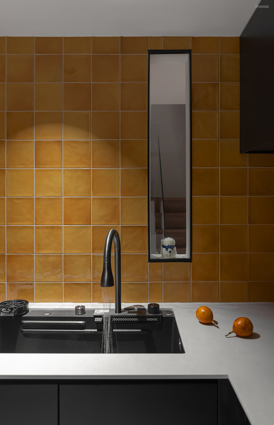 橙色瓷砖显得干净又明亮,,黑色水台与橱柜,让厨房更具时尚感和高级感。