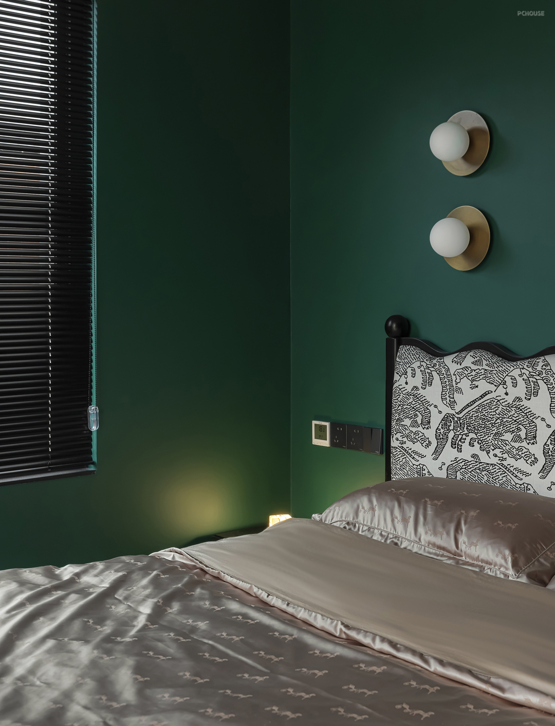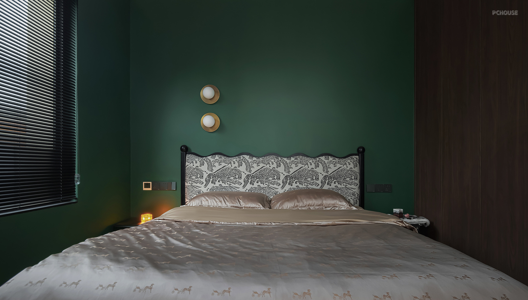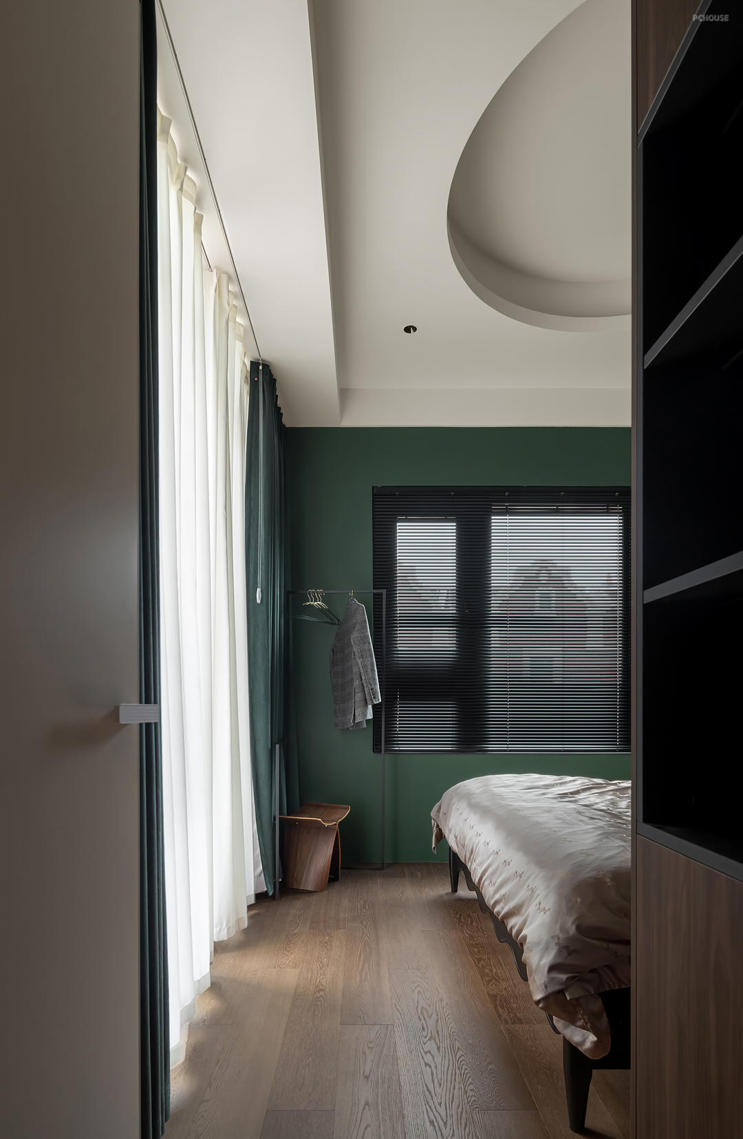 黑色百叶窗宛如光影魔术手,映衬卧室更加沉寂静谧,为空间增加一分硬朗的线条美。卧室椭圆顶增强现代情境,打造灵动空间。