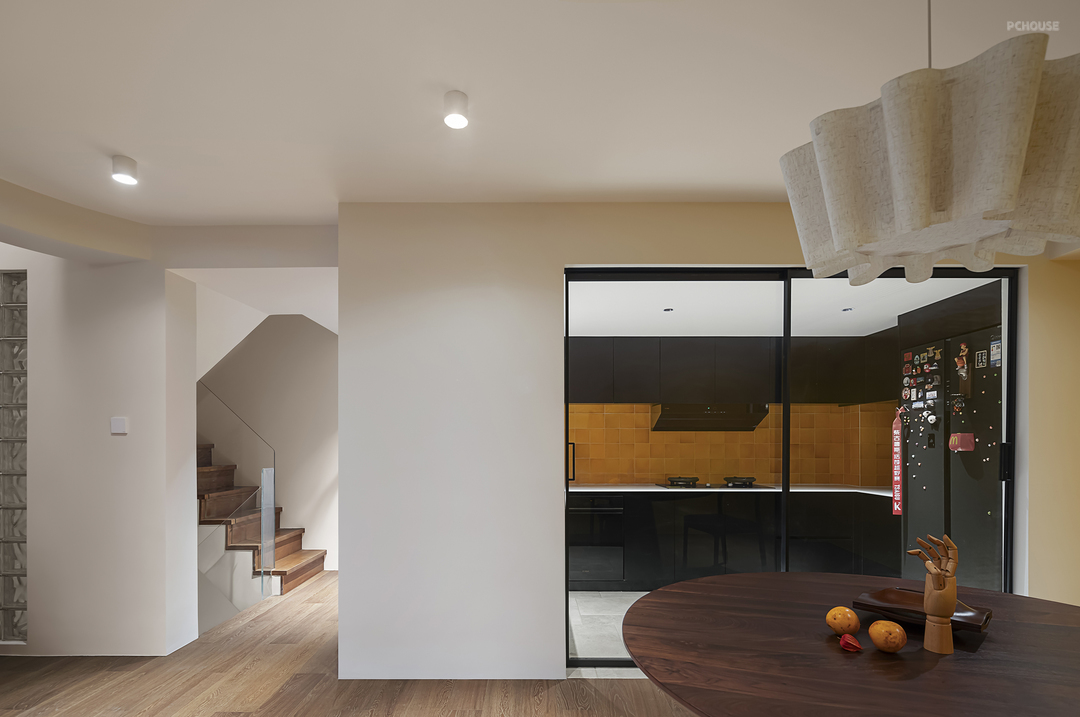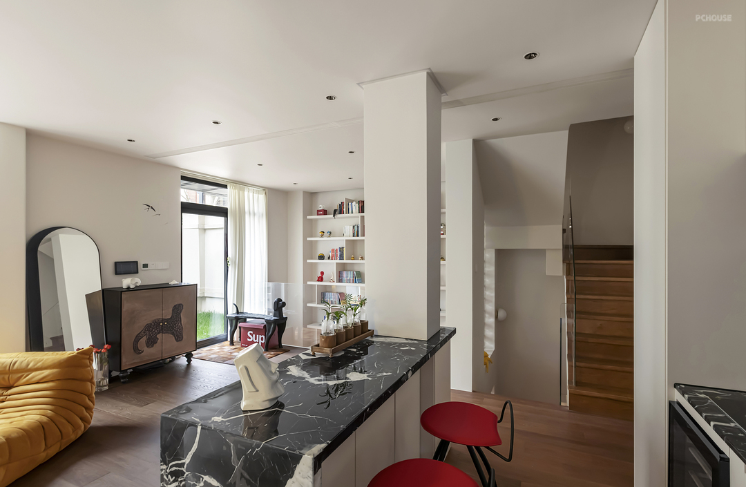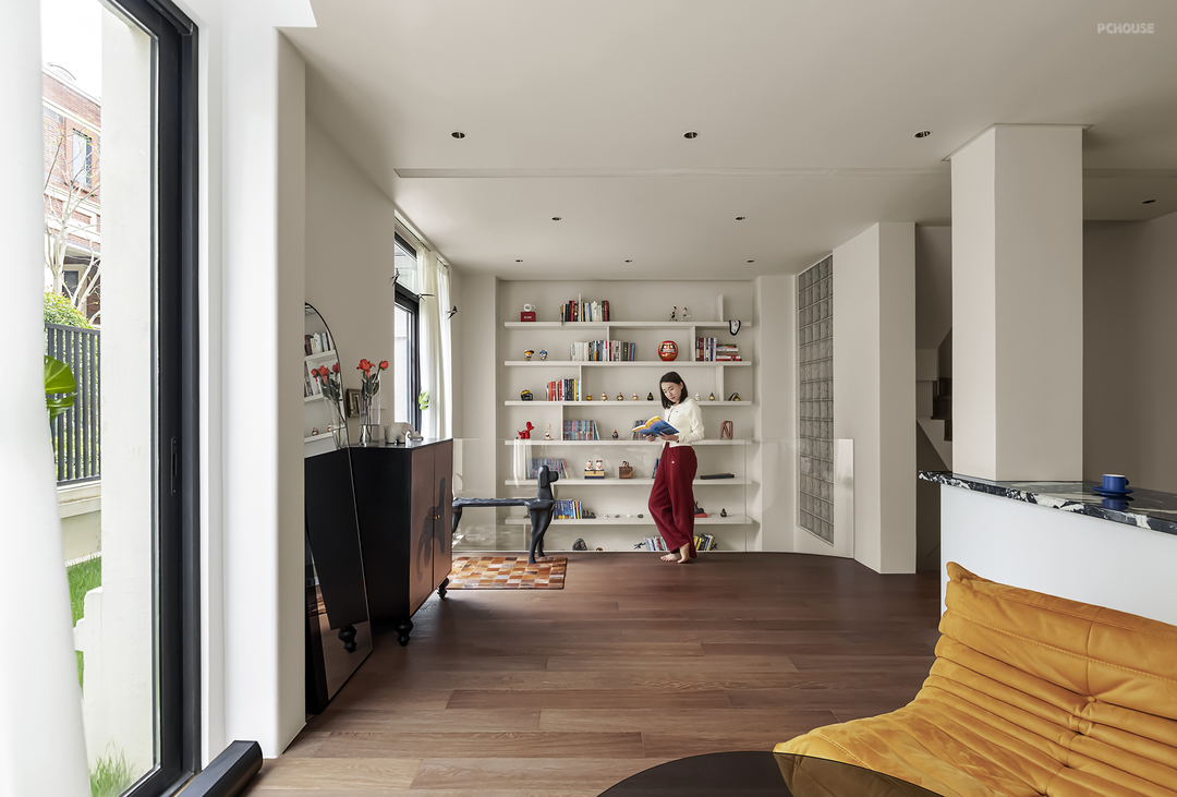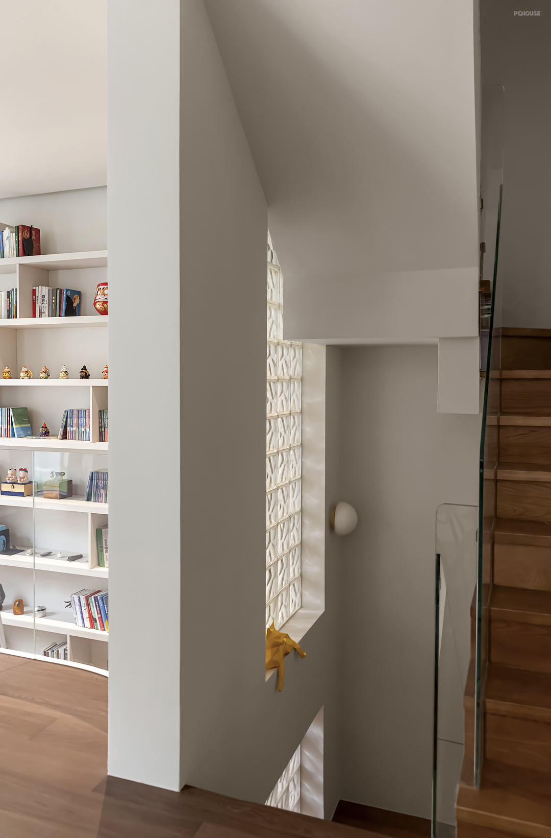 挑空书柜填补了一楼与负一楼的空白漏洞,留出了更多的收纳空间,玻璃砖墙面也会顺势折射光线从而减少负一楼的昏暗程度。
