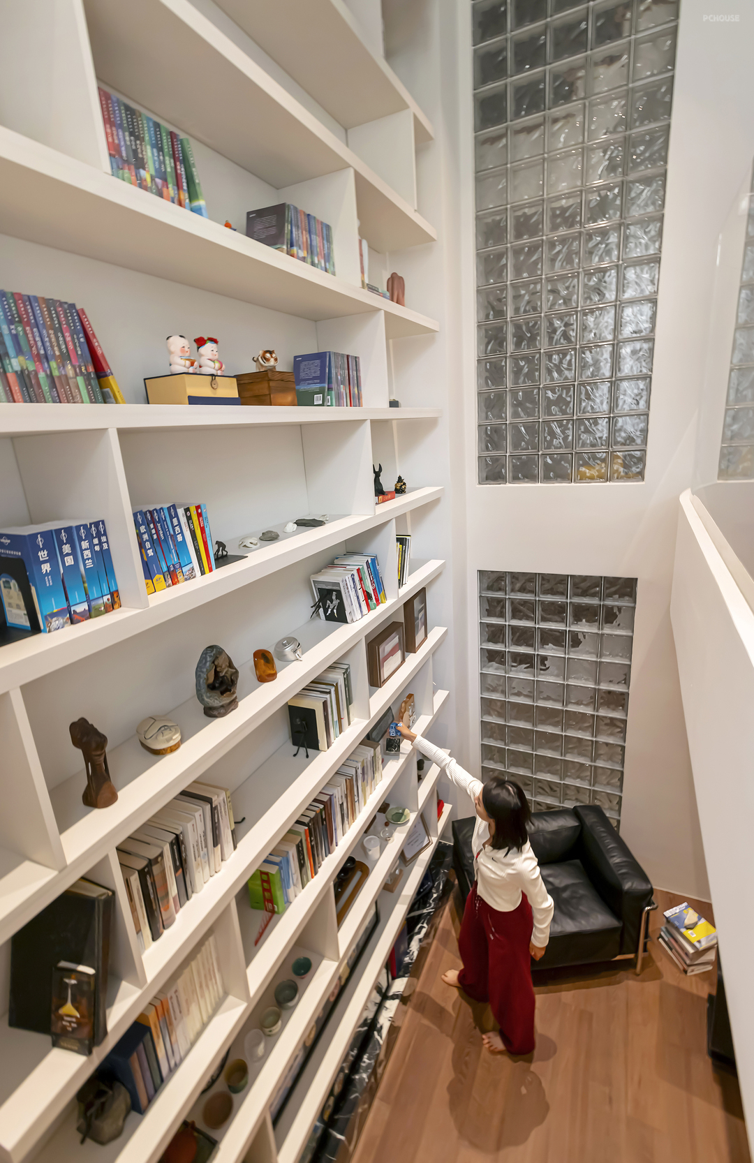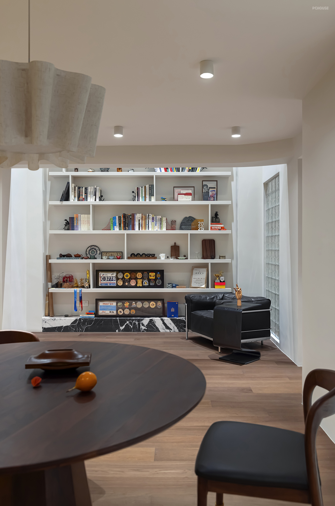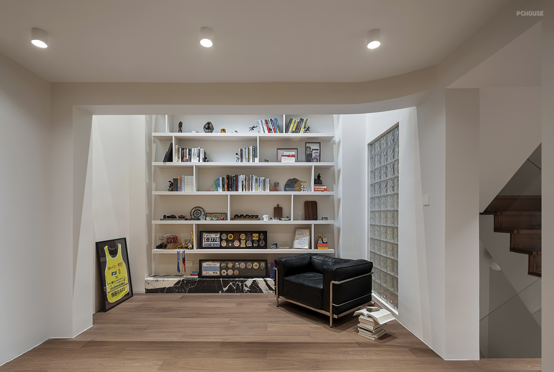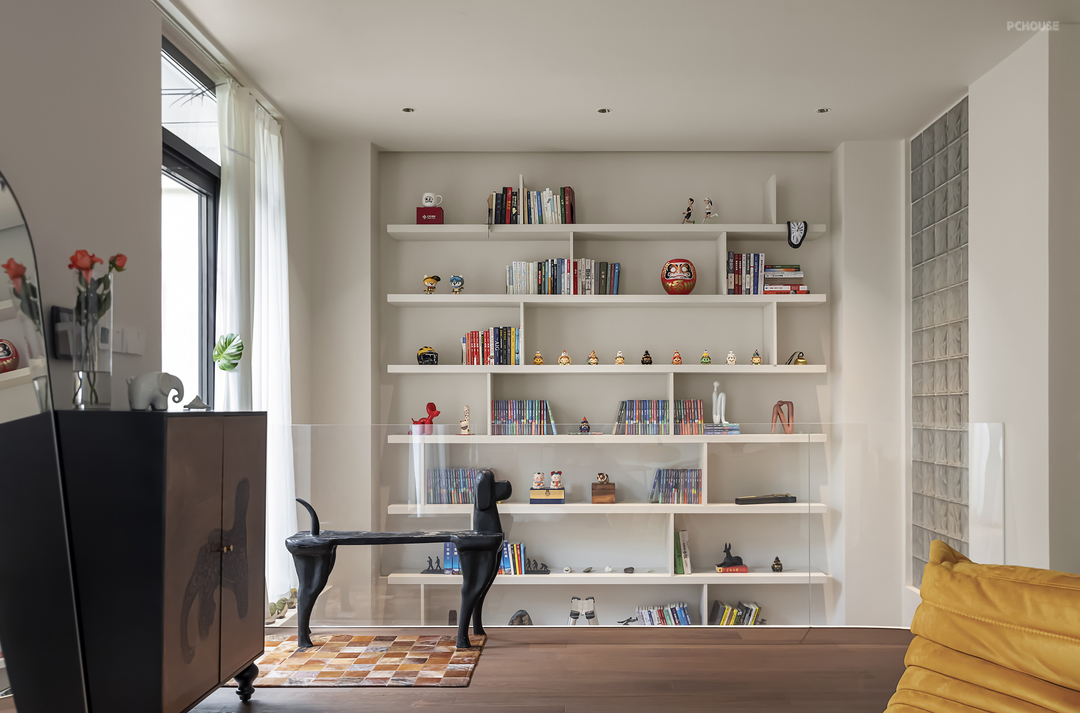以玻璃砖作为墙面采光带,为休闲区带来柔和而富有层次的光线,隐私感和空间感双重提升。书柜陈列乱中有序,保持视觉空缺,更有艺术品味。