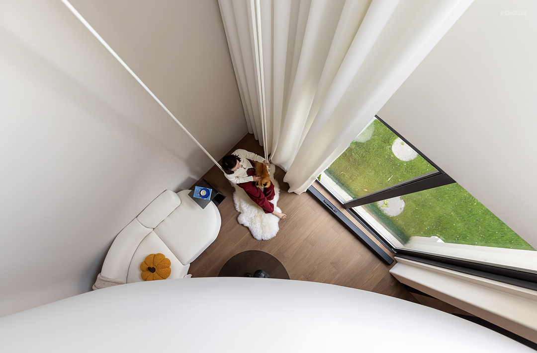 大面积的白色窗帘配合挑高的客厅,拓宽整个空间。光影在木质地板和墙面起舞,温馨又治愈。