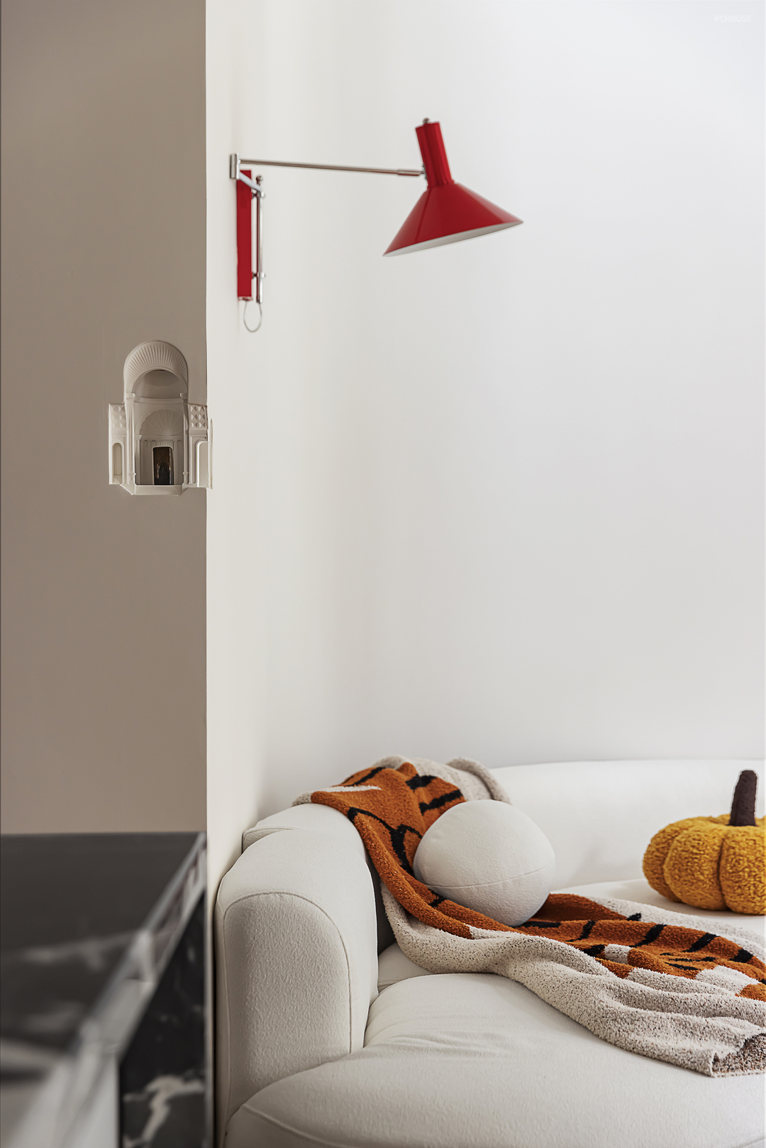 红色的全光谱壁灯平衡客厅的色调,更显自然活力。墙面别具匠心的凿开城堡形状,成为最治愈的角落。