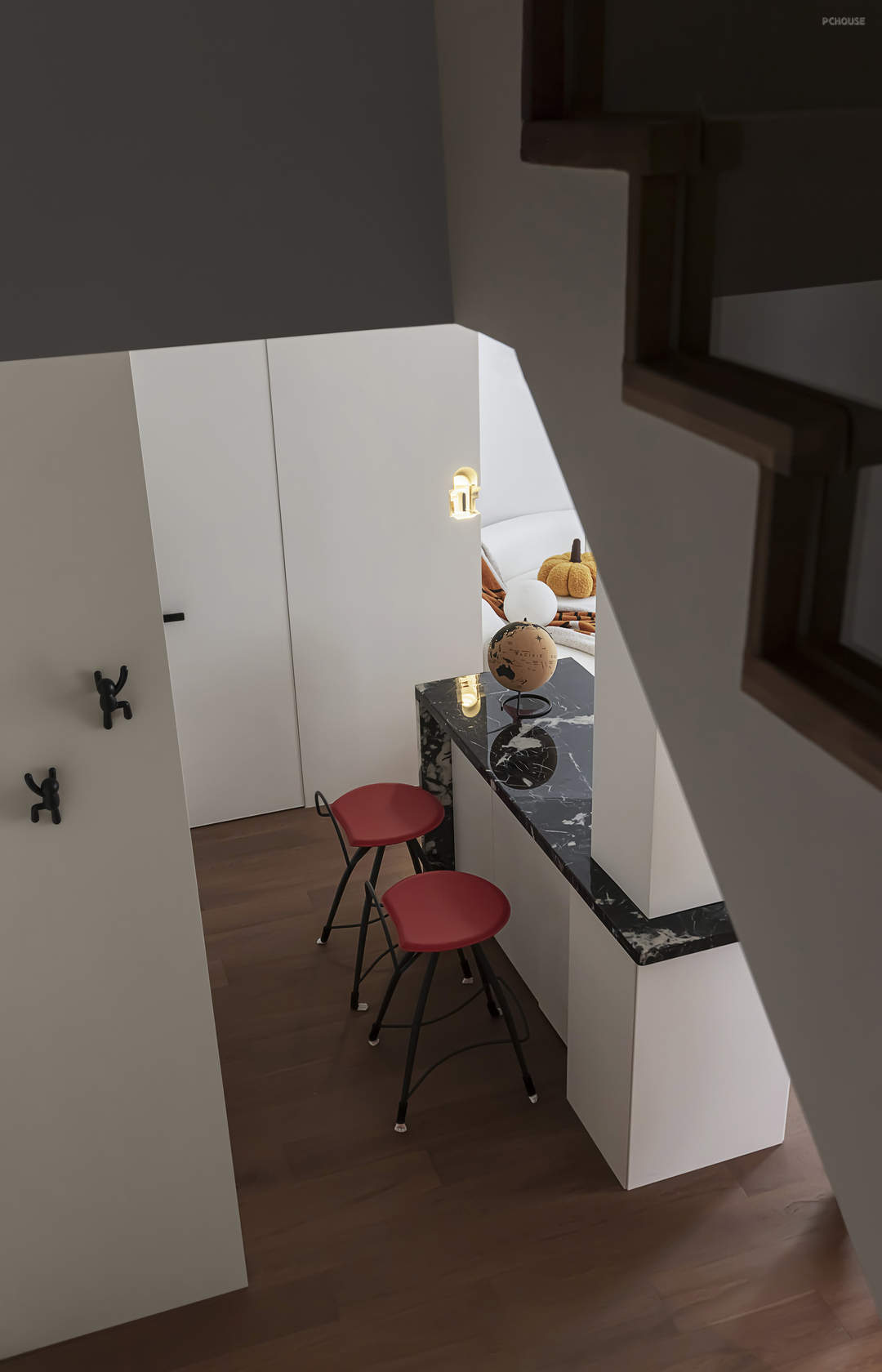 红色高脚椅突出色彩,成为点睛之笔。