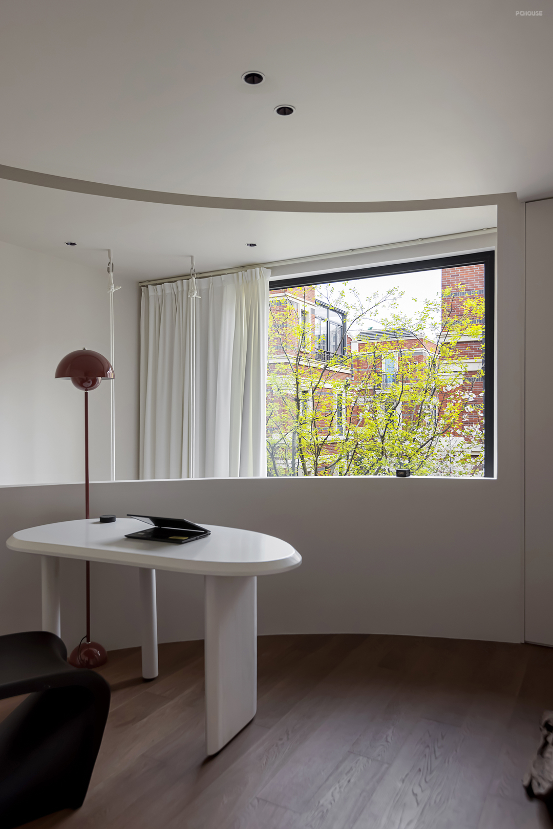 办公区采用开放弧度设计,与二楼窗户进行视觉延伸,将窗外风景引入室内,以天然屏障把风景搬进家里,窗外即画,自然就是最好的装饰品。