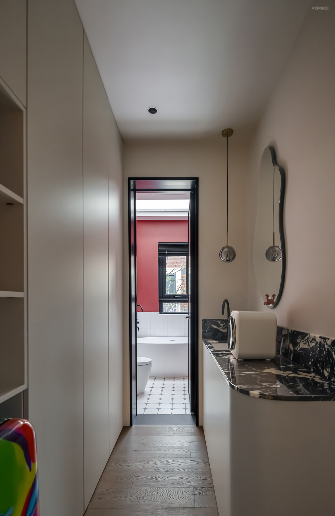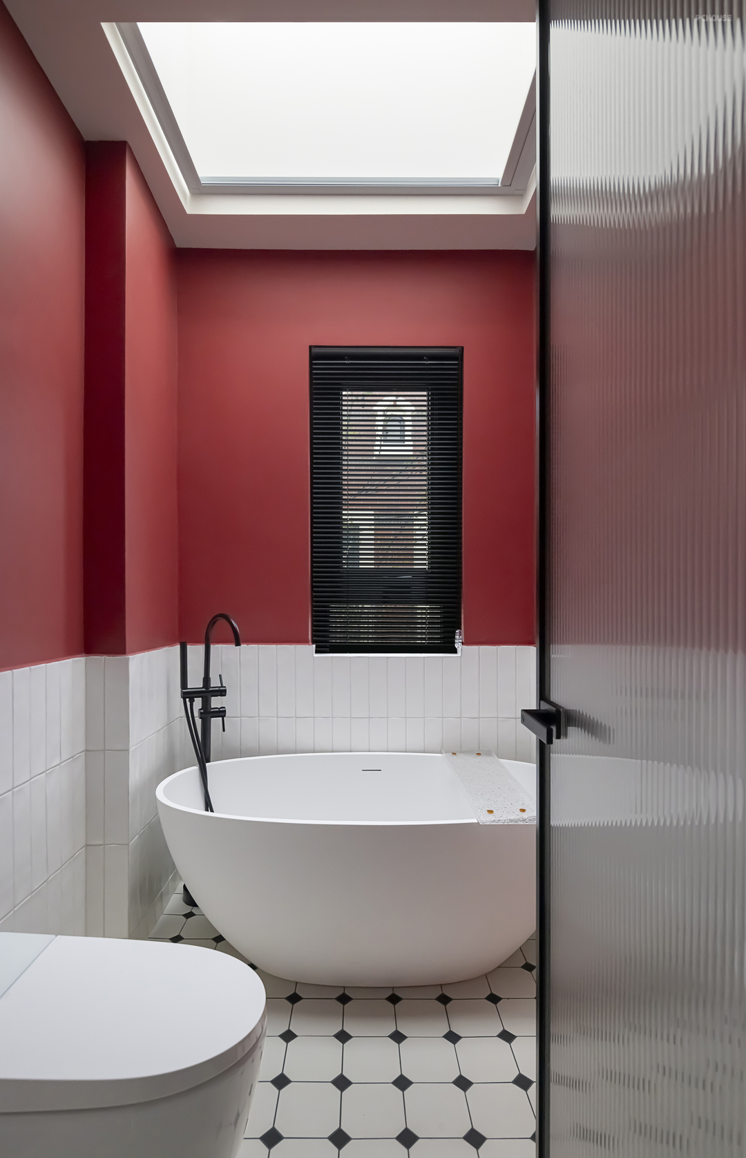 浴缸区上半为复古红墙面,下半墙润以米白色瓷砖点缀,中和浓郁的复古氛围,带来别样风情。顶部用软膜天花灯照亮,空间更为柔和舒适。