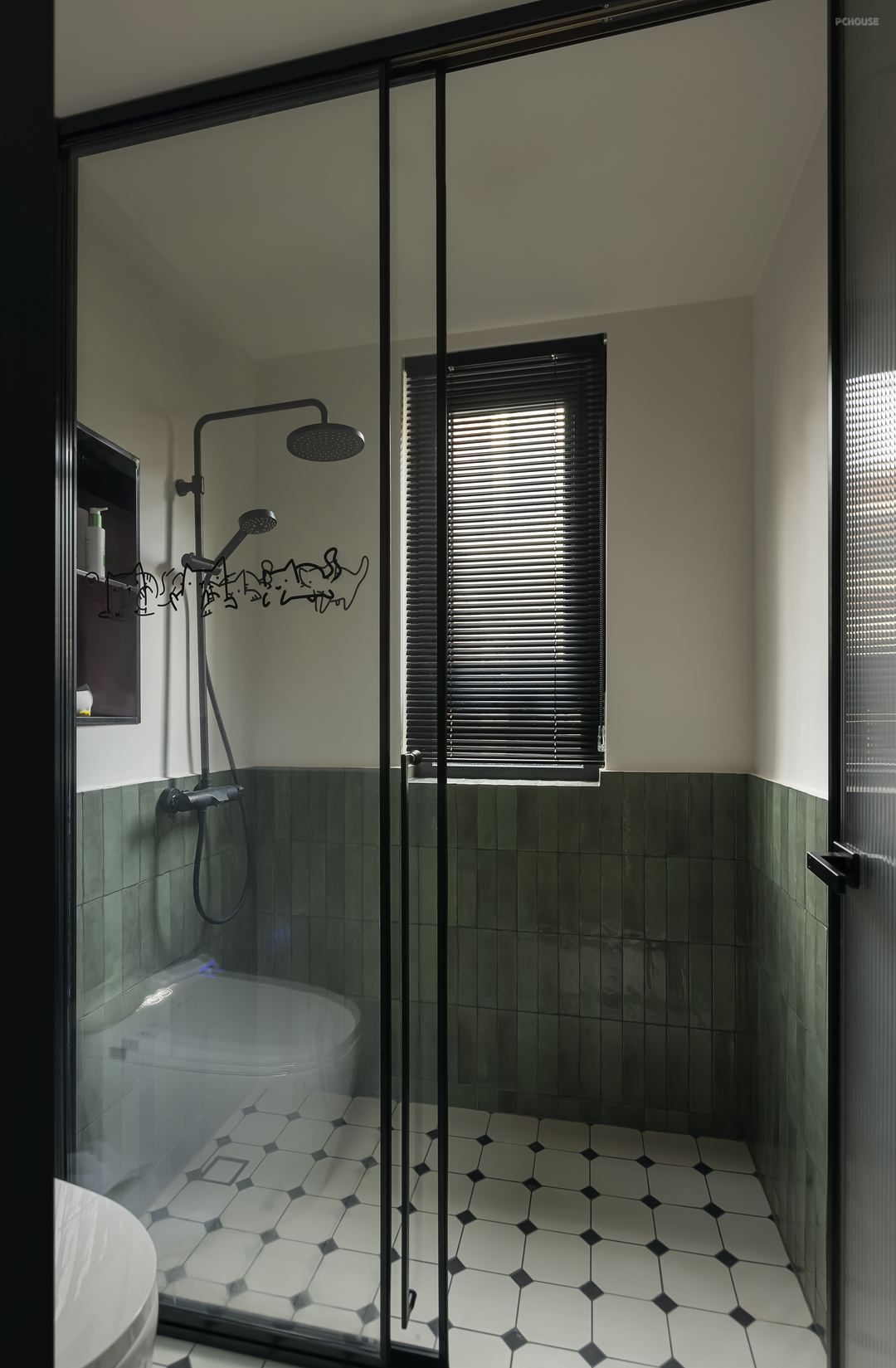 淋浴区采取上下半墙设计,墨绿加奶白有效调和了卫生间的轻复古韵味,营造简单的法式氛围感。地面以规则的点纹理花砖搭配,更加清爽。