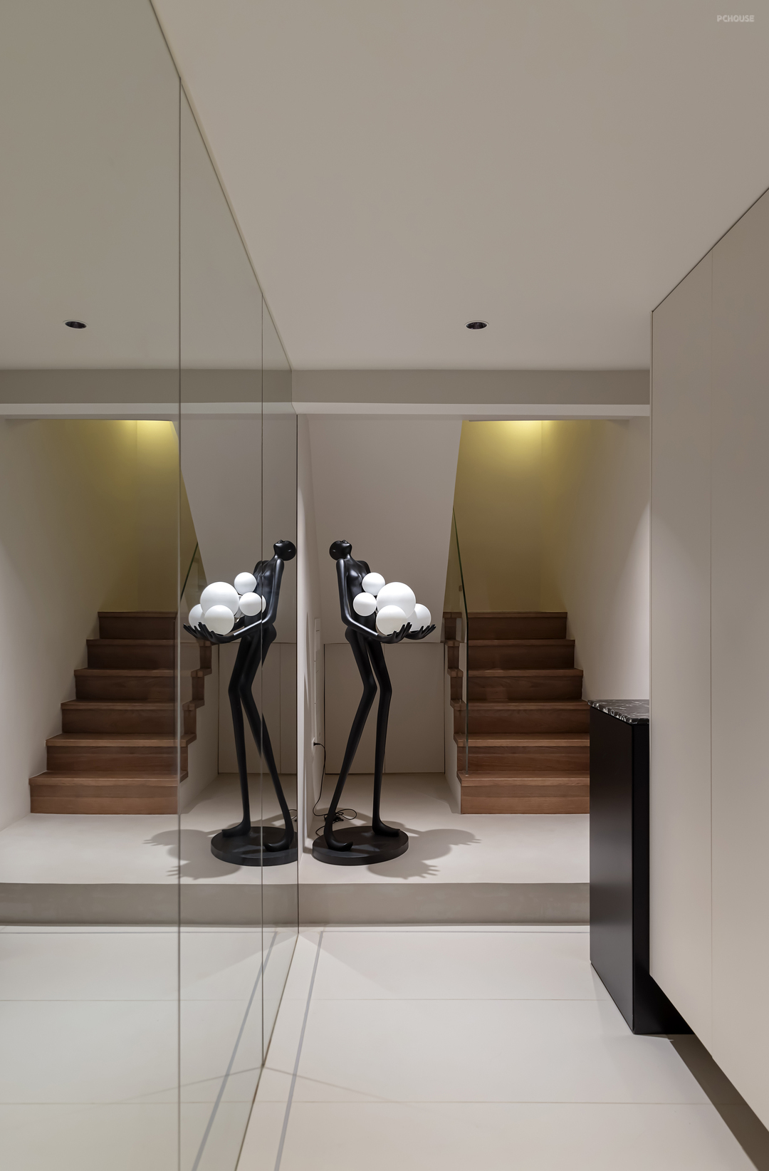 负二楼玄关设计之后,放置多功能衣柜作为收纳,既是通道也是储物空间,上下楼皆是风景。