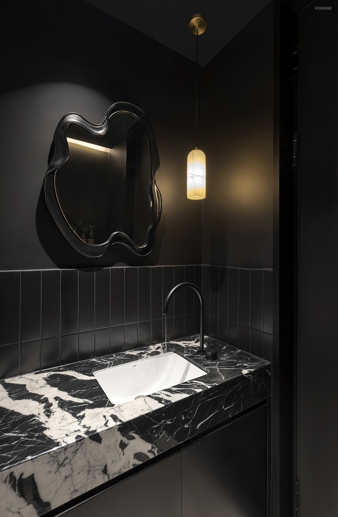 高级黑的洗手台如夜色的精灵,上层是天然黑宝格丽大理石,冷冽高贵,下层是哑黑抽屉柜,沉稳内敛。