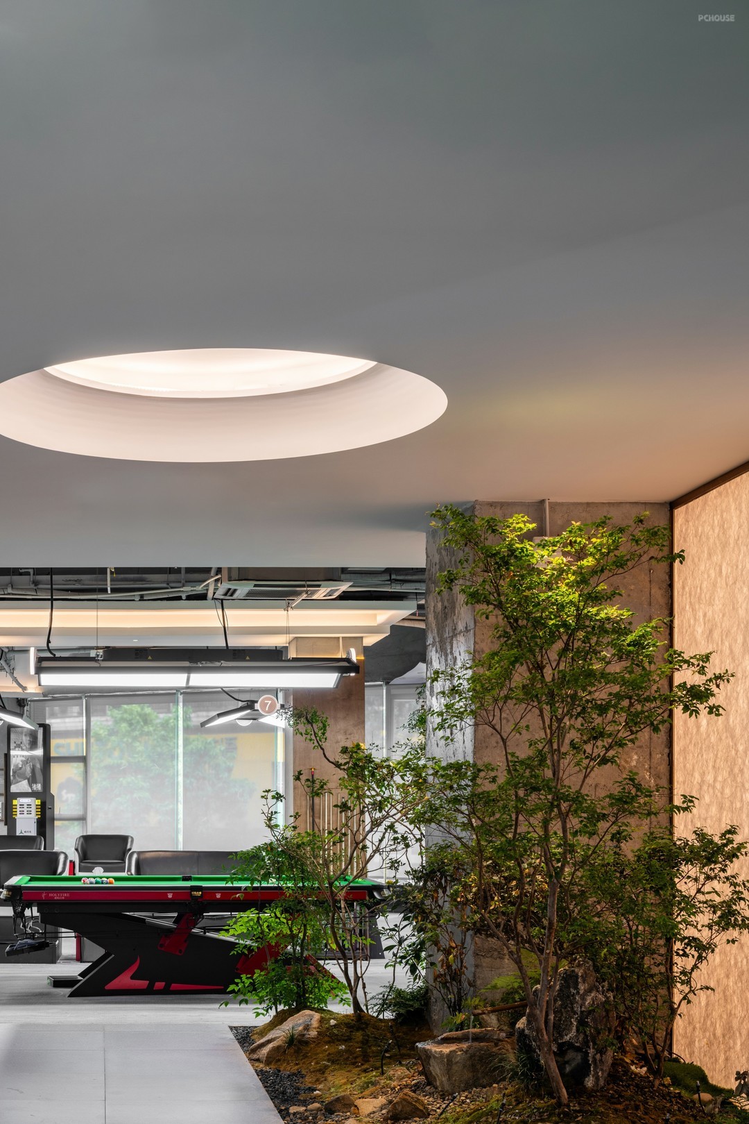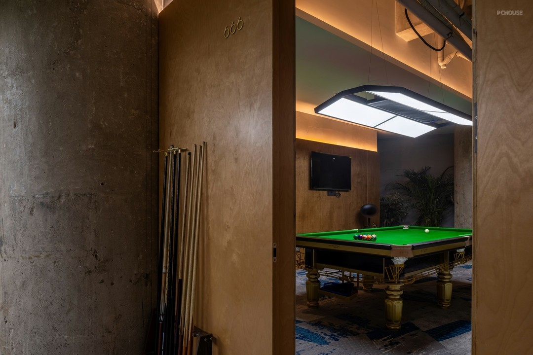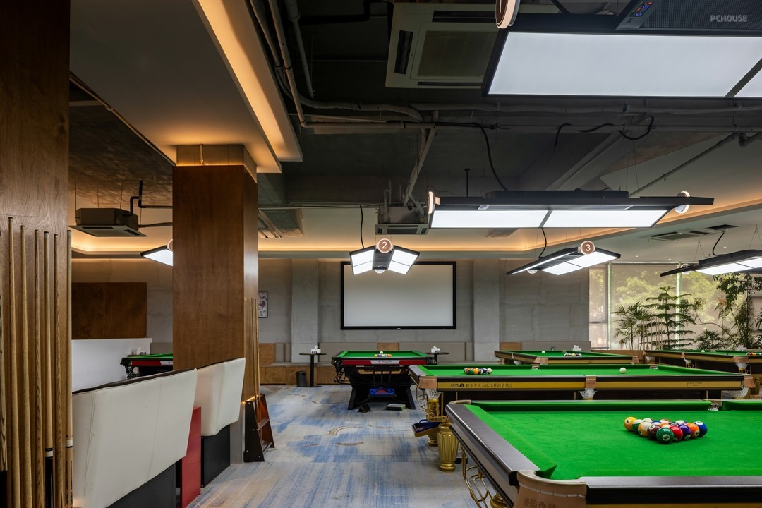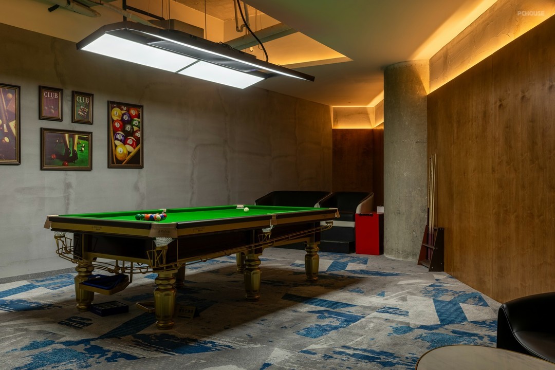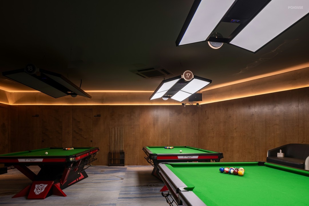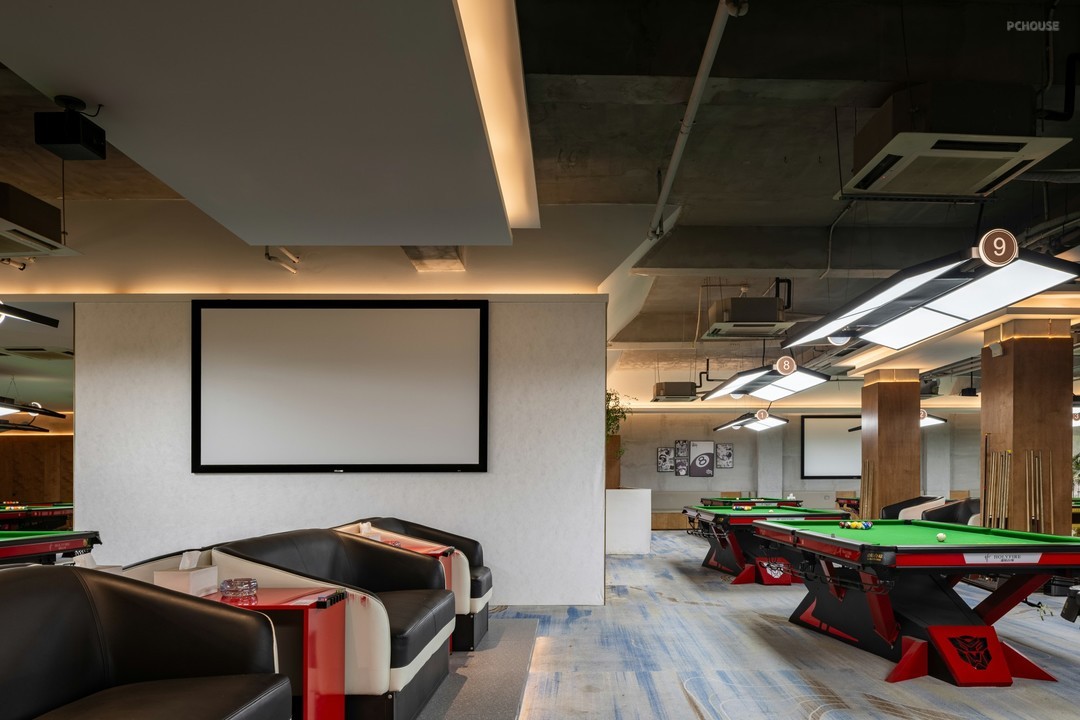 在开放式的格局中,丰富细节刻画,打造具有高级感和设计感的空间氛围。排布一定数量的球桌,球桌上的每一片“绿”都是对自然主义的回响。红色,附着形态各异的结构,把绿色平衡,让休息区与竞技场景产生跨域联系。