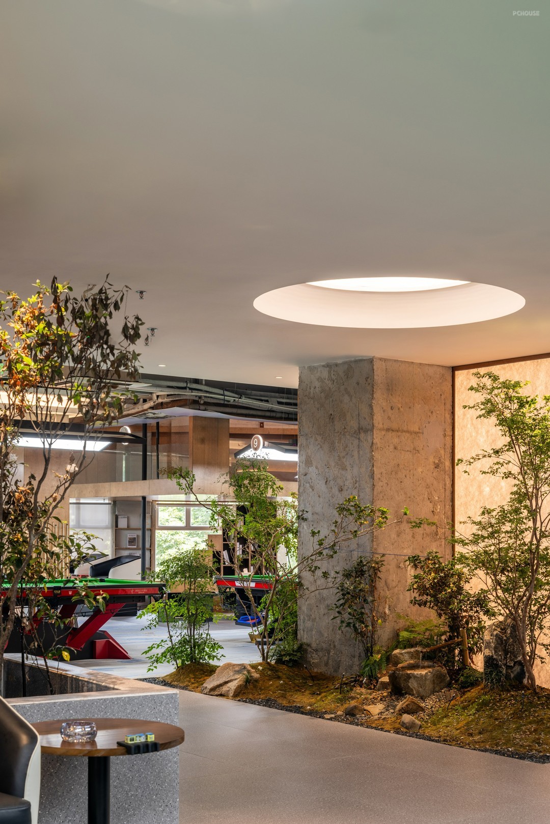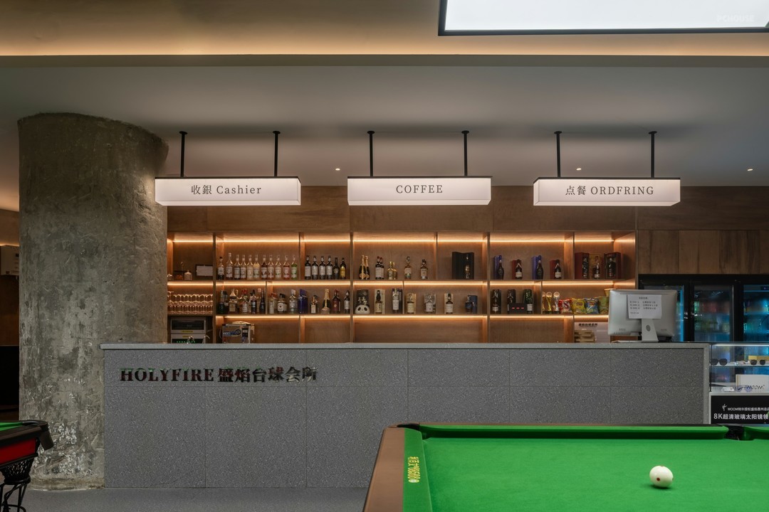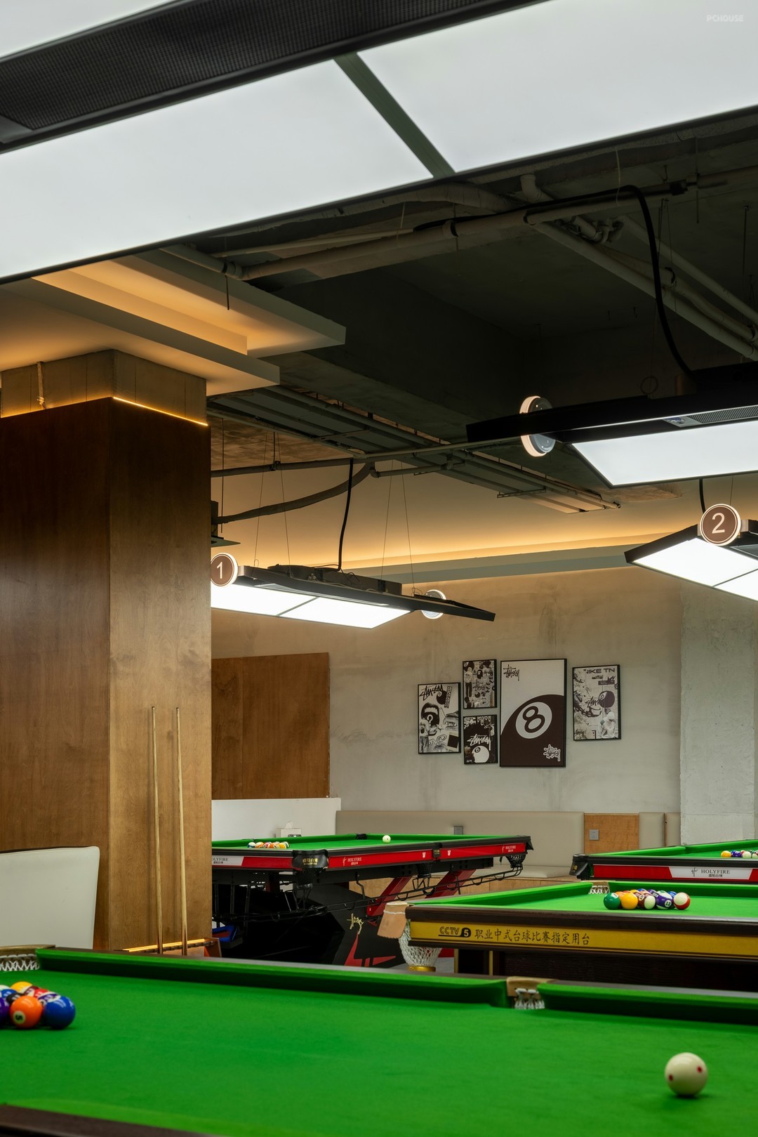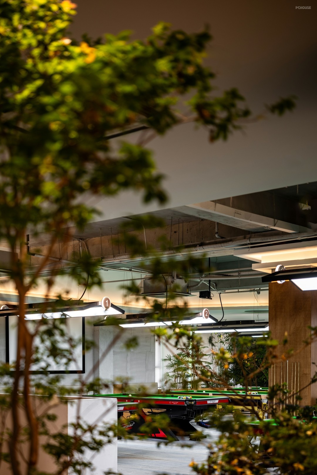 在开放式的格局中,丰富细节刻画,打造具有高级感和设计感的空间氛围。排布一定数量的球桌,球桌上的每一片“绿”都是对自然主义的回响。红色,附着形态各异的结构,把绿色平衡,让休息区与竞技场景产生跨域联系。