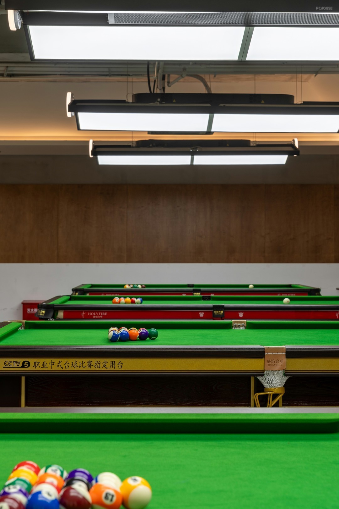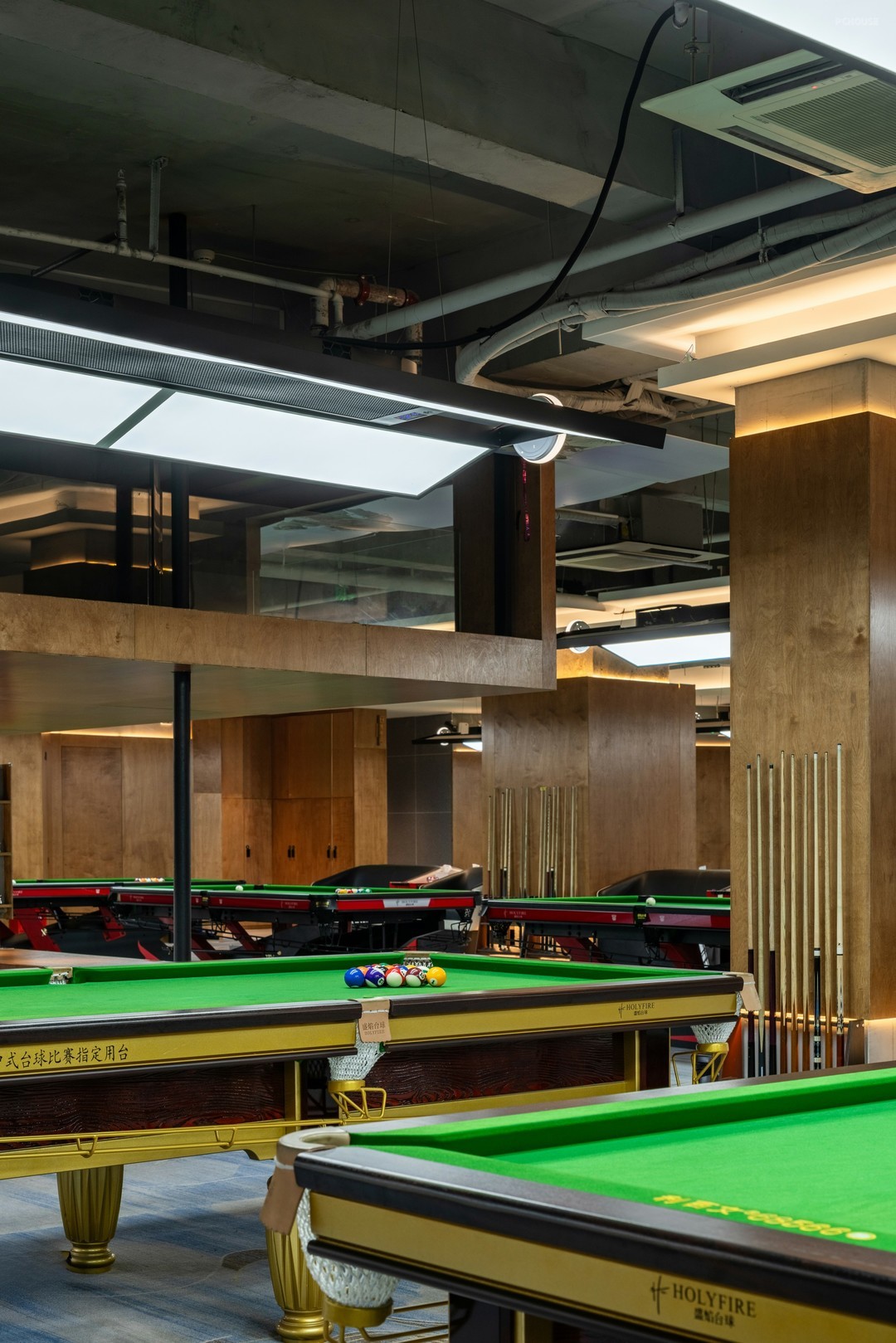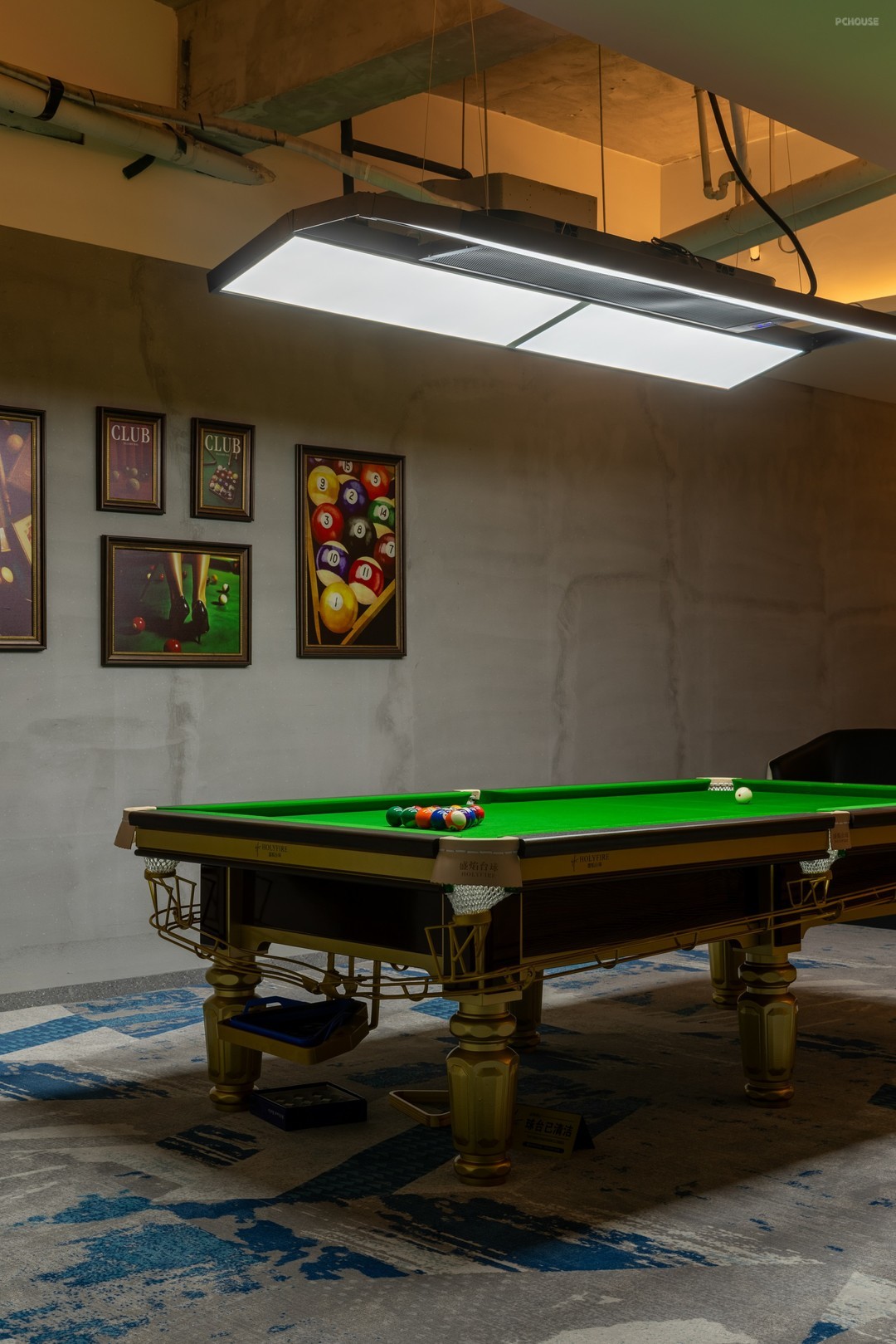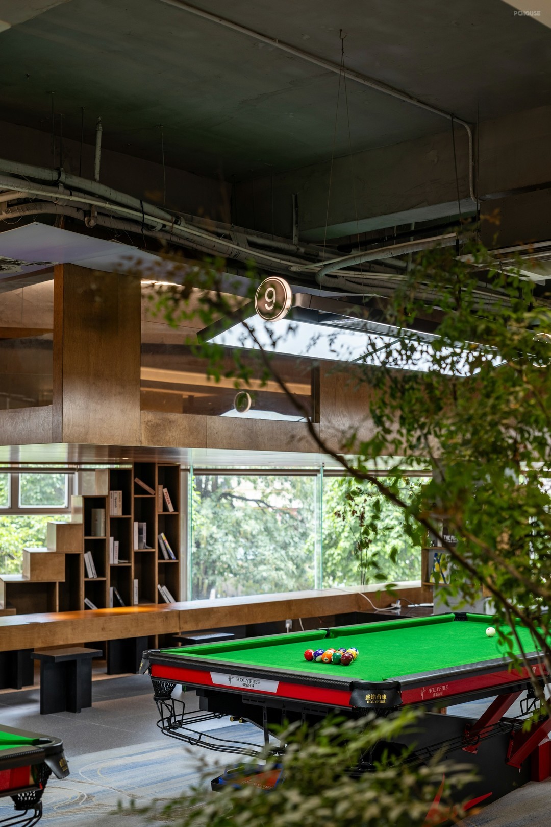 在开放式的格局中,丰富细节刻画,打造具有高级感和设计感的空间氛围。排布一定数量的球桌,球桌上的每一片“绿”都是对自然主义的回响。红色,附着形态各异的结构,把绿色平衡,让休息区与竞技场景产生跨域联系。
