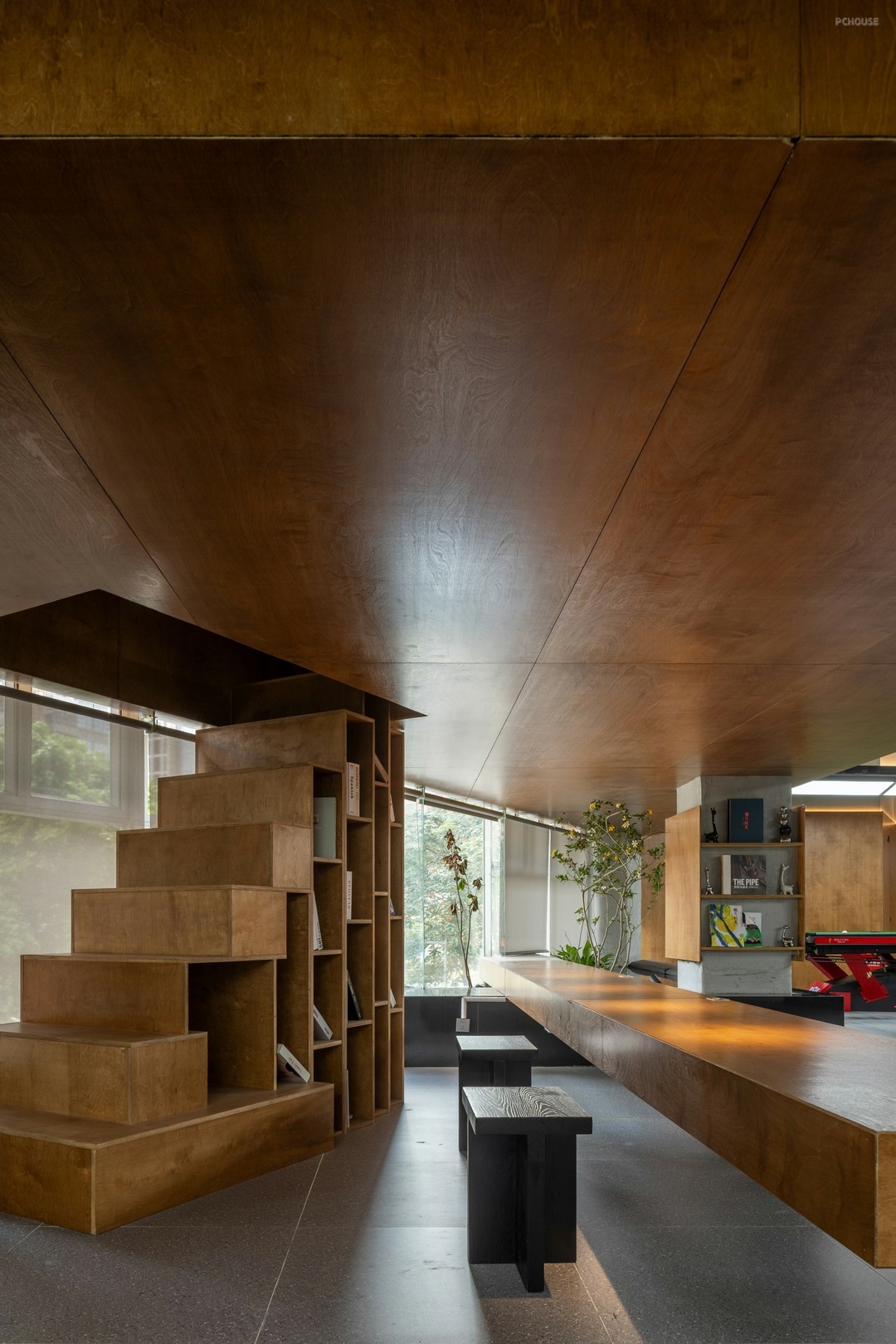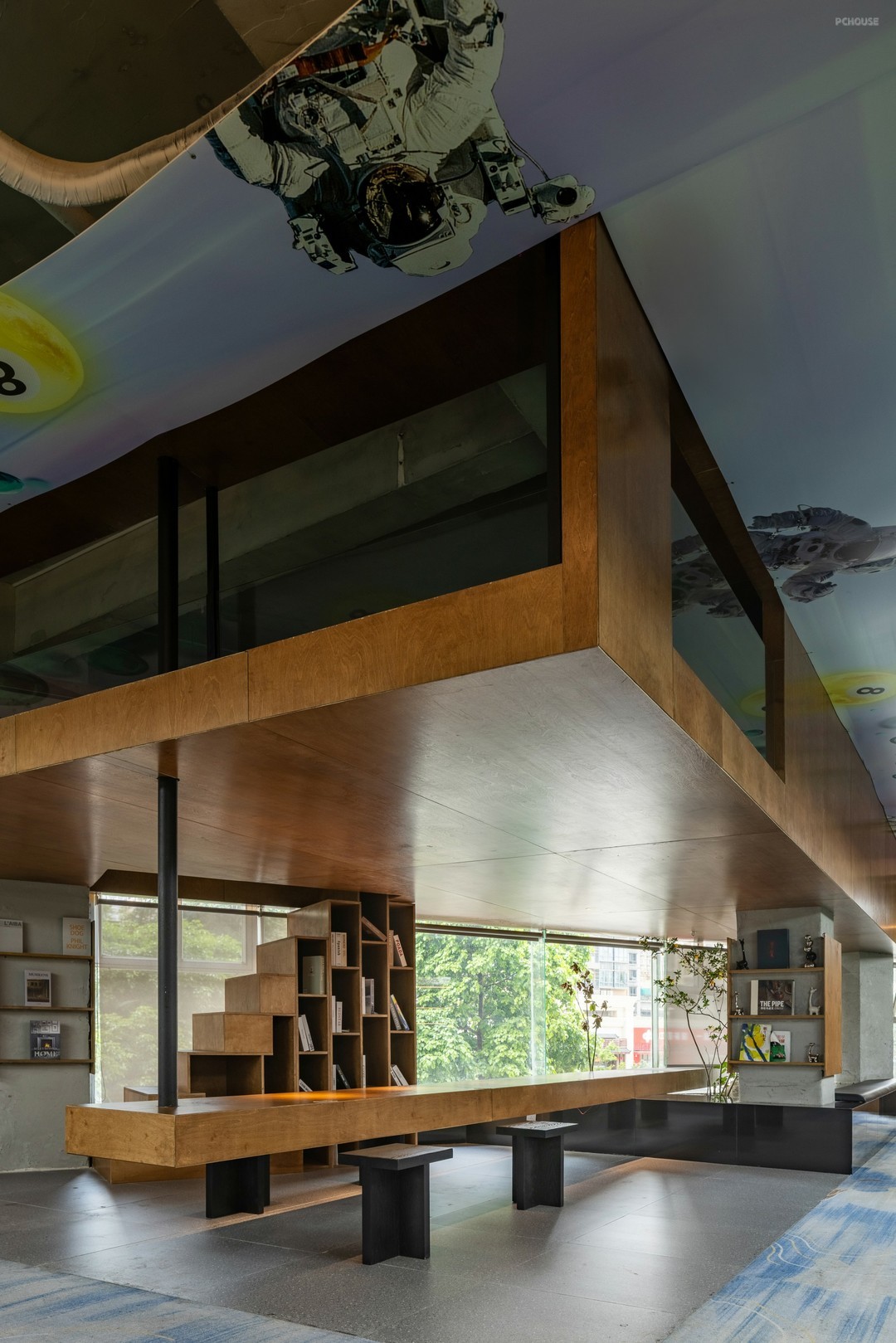根据前期设定好的功能占比,规划等候区的方位与面积。对齐地面色块的界限,构筑半层空间,通向半层空间的楼梯也是书柜,呼应另一端以水泥柱为载体的书架,超长桌形穿于两者之间,在木元素的酝酿下,室外绿意更显生动。