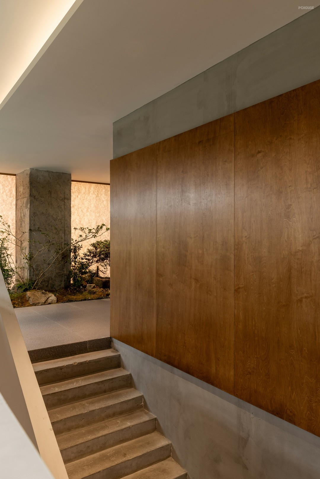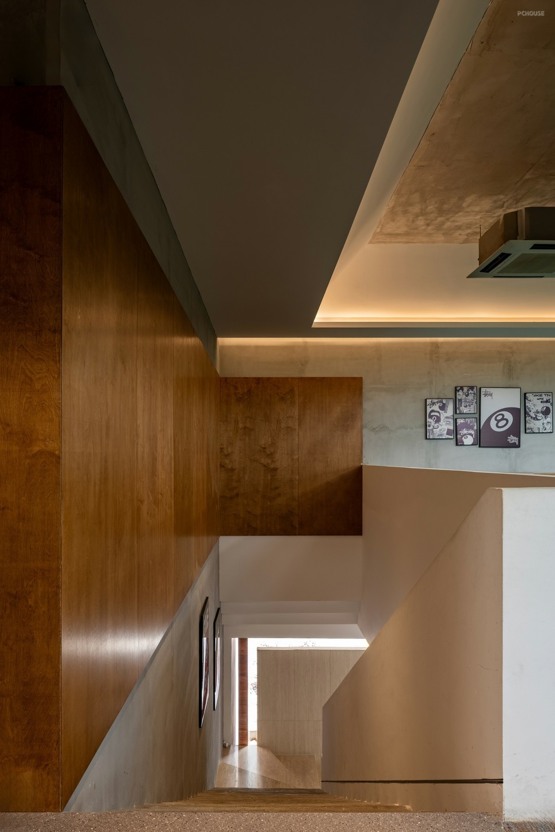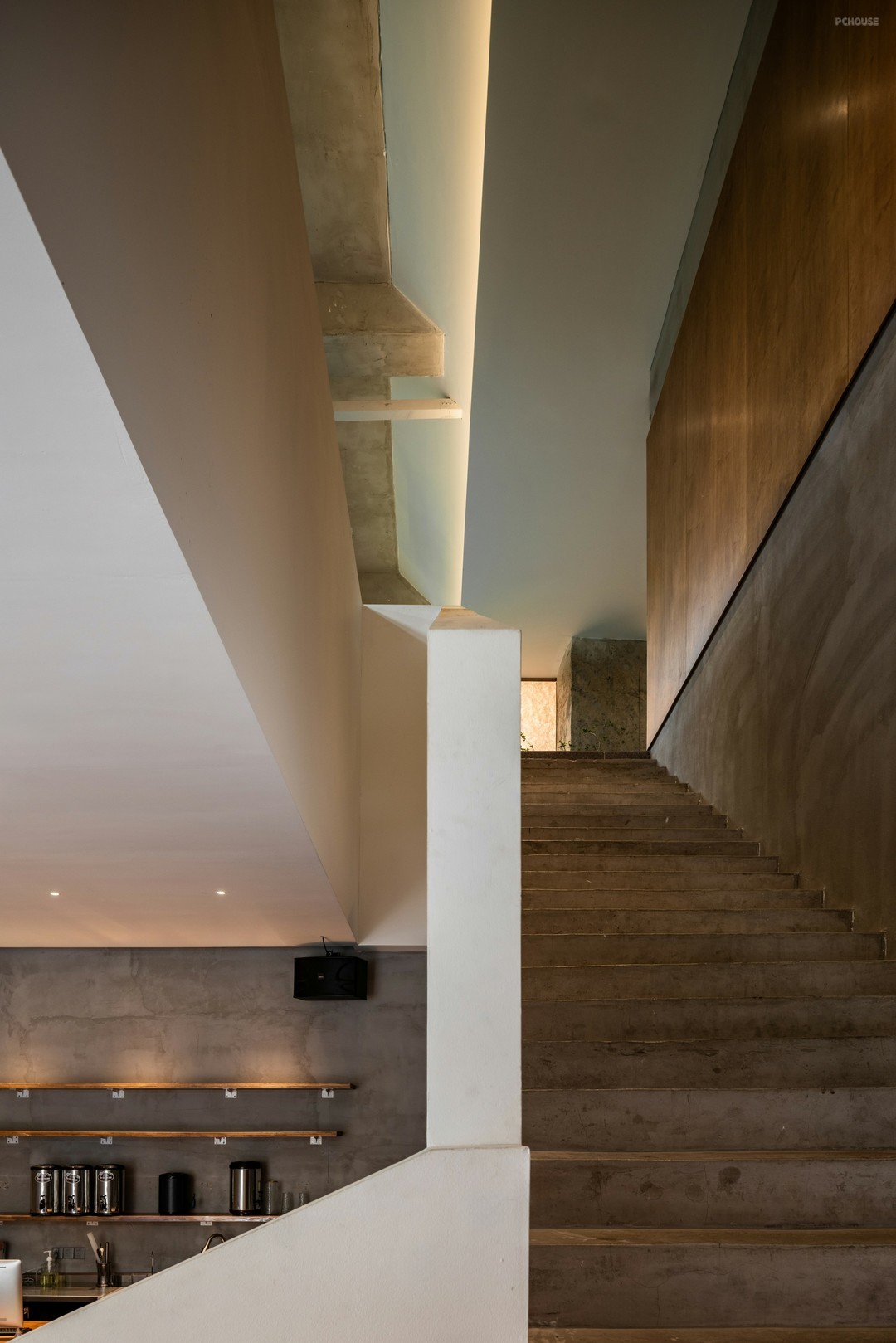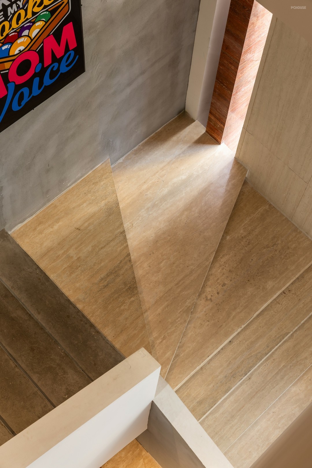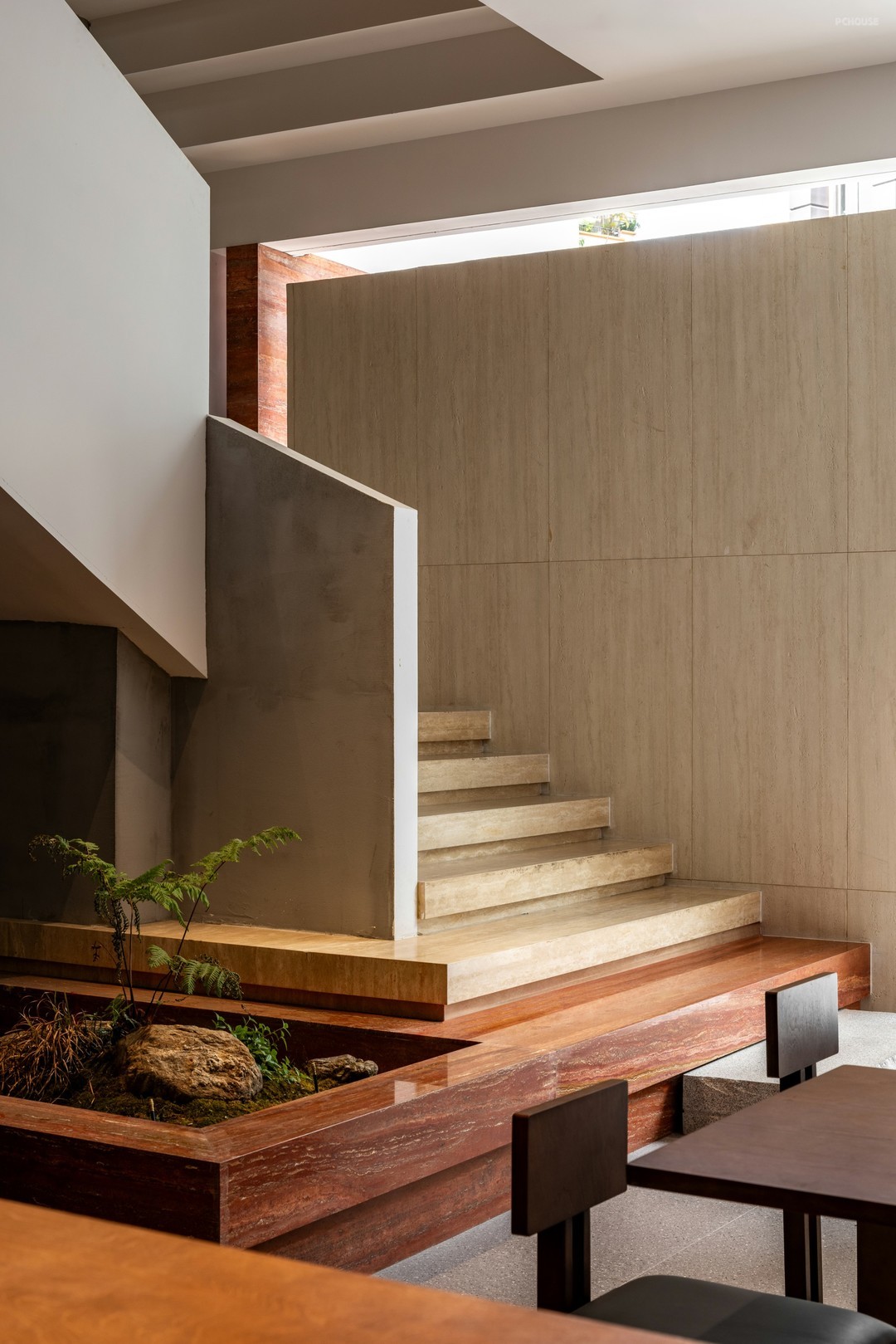 石,是楼梯的起始,也是优雅步调的序曲。线性镂空,将自然光透进室内,美化空间架构,跃动多重光影。顶角部分,做韵律均衡的叠级造型,仿佛把楼梯搬到了顶空,形成异时空对话,致敬意大利建筑师卡洛·斯卡帕的妙想与哲思。
