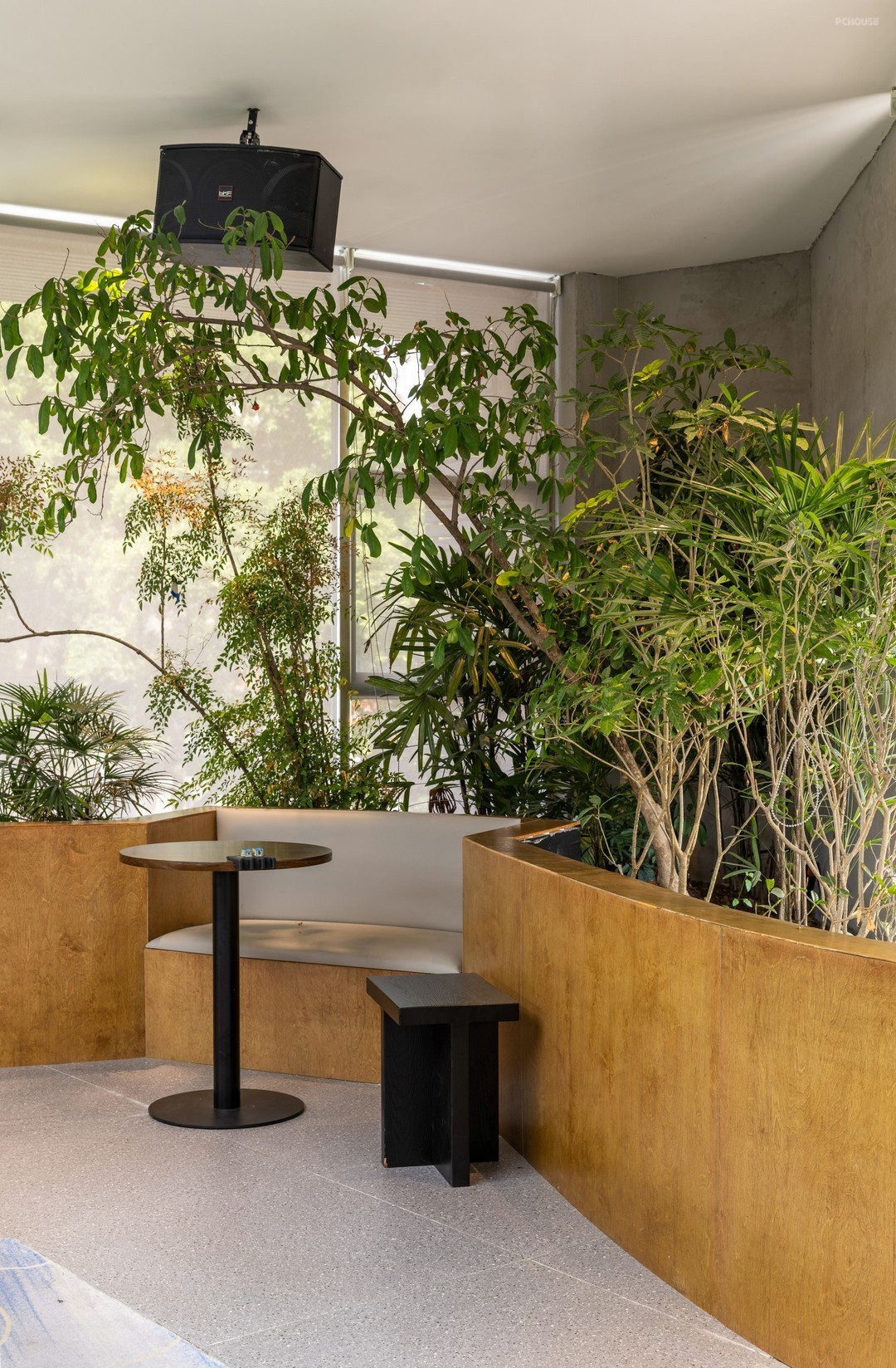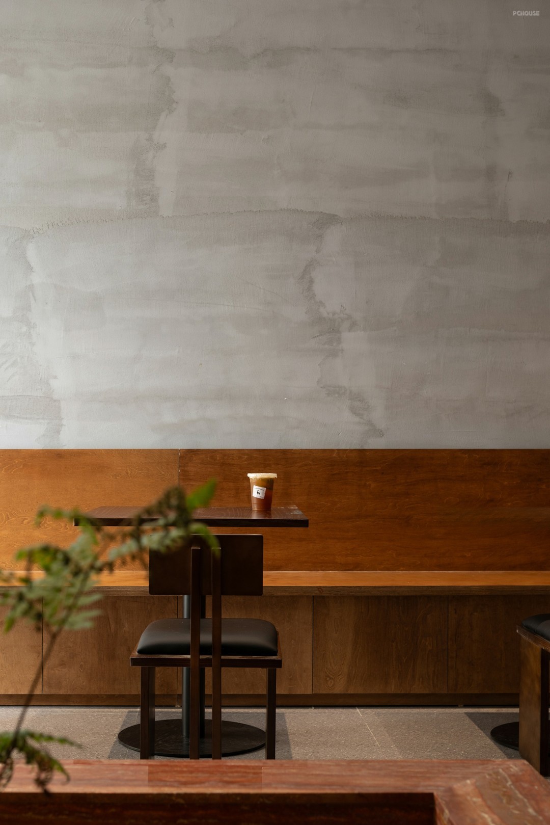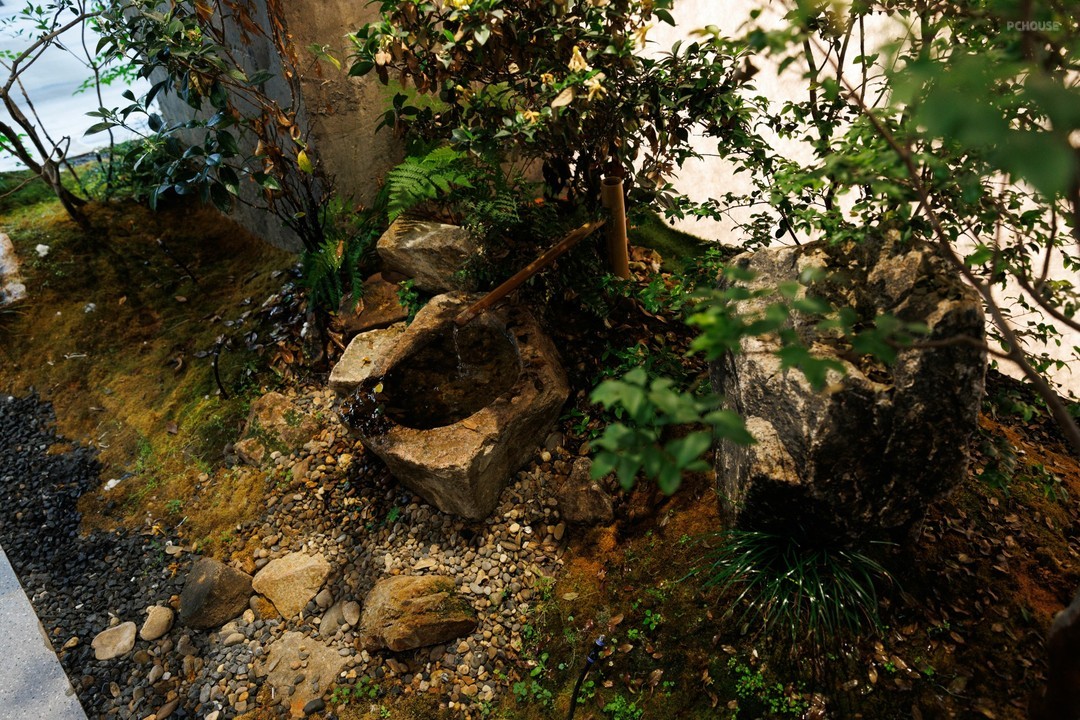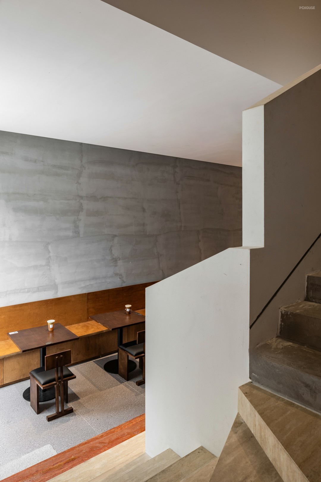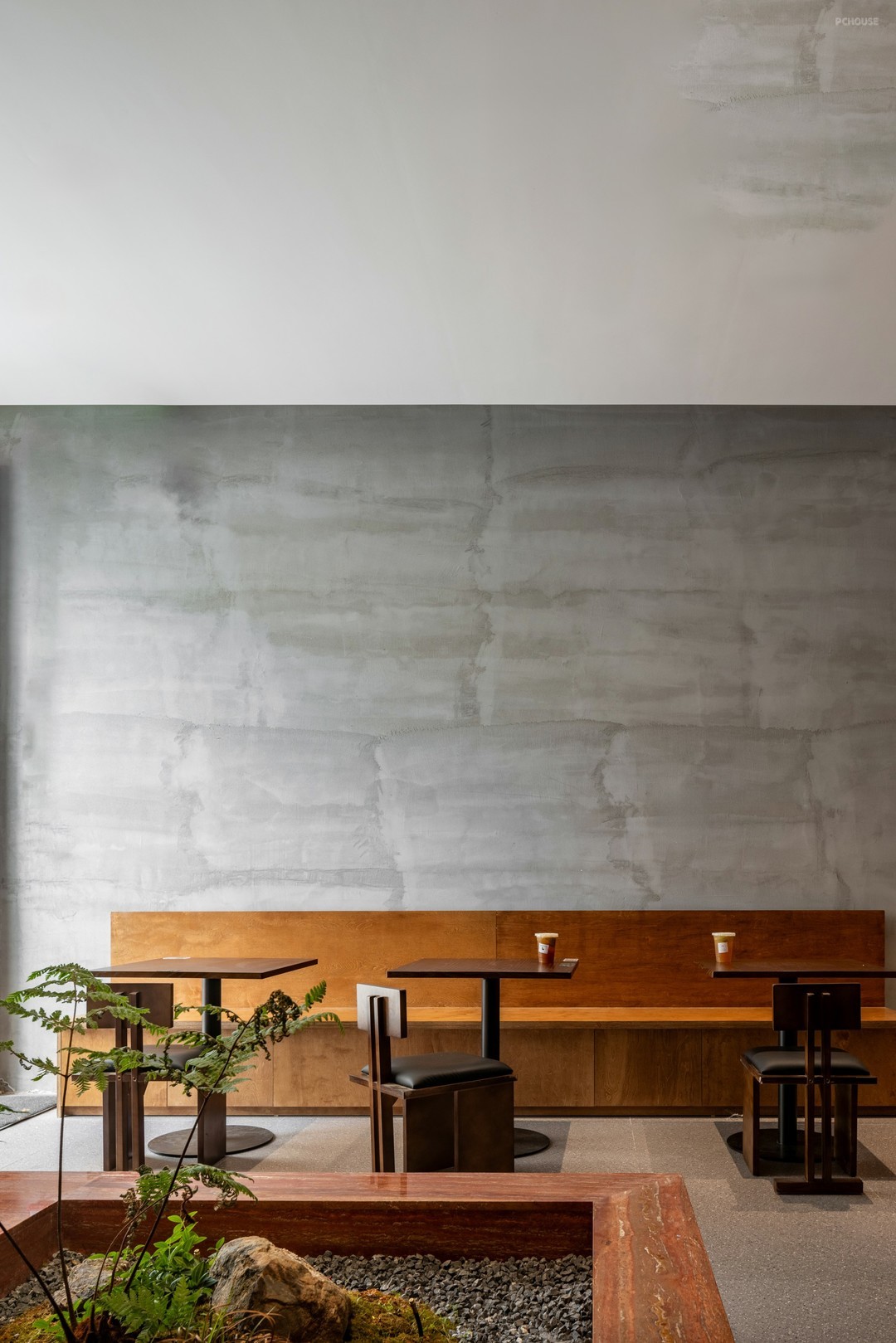 静谧的灰,创造出富有肌理感的壁面,衔接周围的留白意蕴,展演自然语素的可塑性。打造卡座,排布桌椅,在拉伸空间纵深的同时,造就依人而动的连续节奏。景观池,虽位于楼梯一隅,但因其色温与卡座相近,便衍生出了旷远与自由。