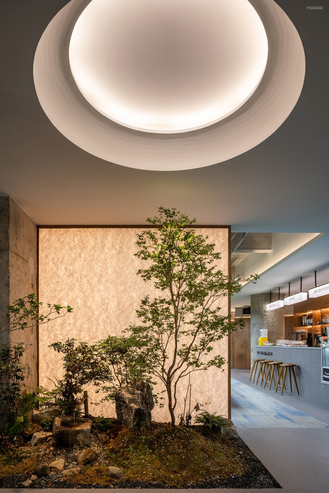 内凹圆形,在光的浸染下打破平顶的沉默,一边滋养,一边唤醒植物、土壤、野石的生命力,诠释自然主义应用在商业空间的意义。能映出自然纹理的发光背景,弥补了此间采光较弱的问题,中和天花直射光与侧旁水泥柱的特点,烘托画境。