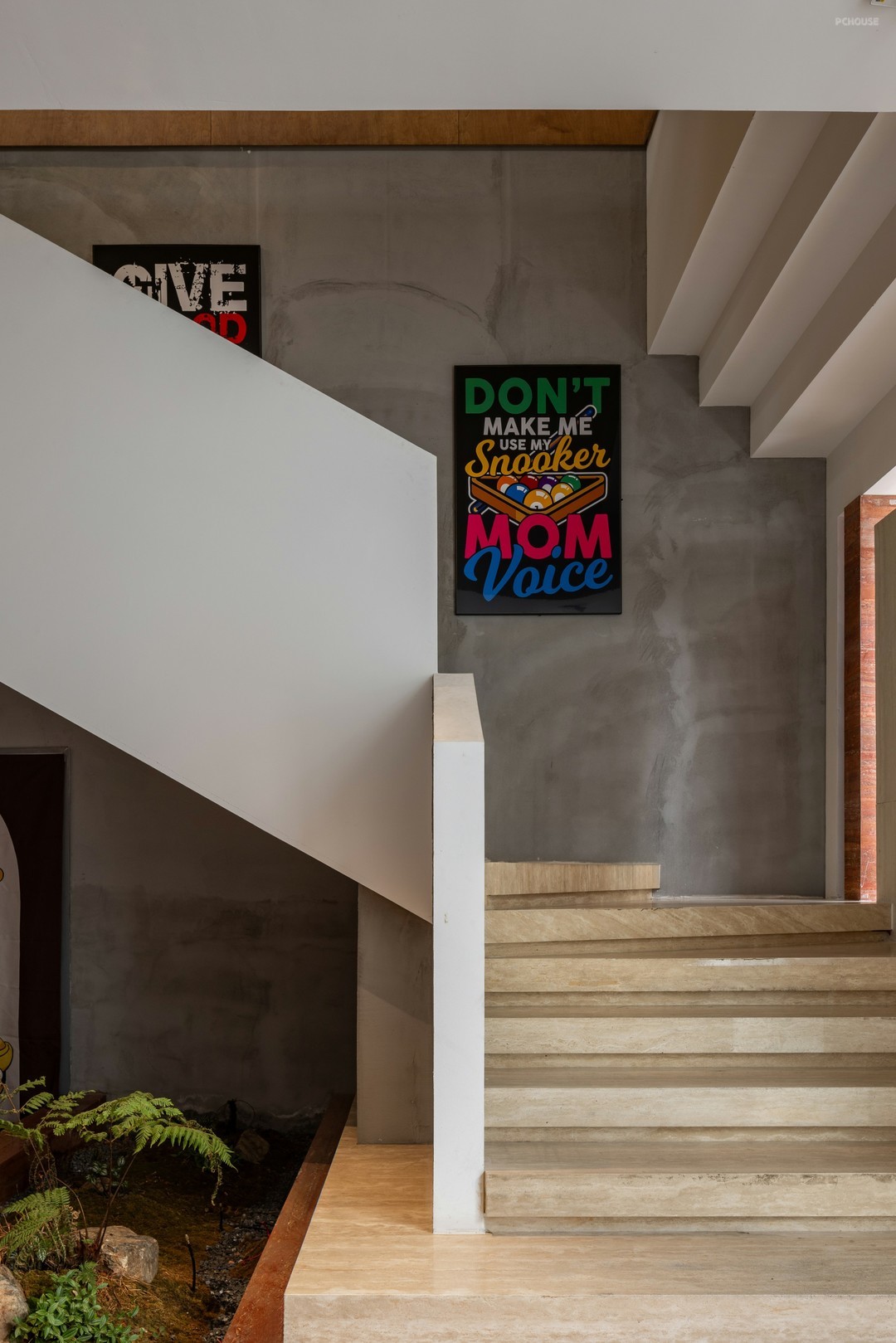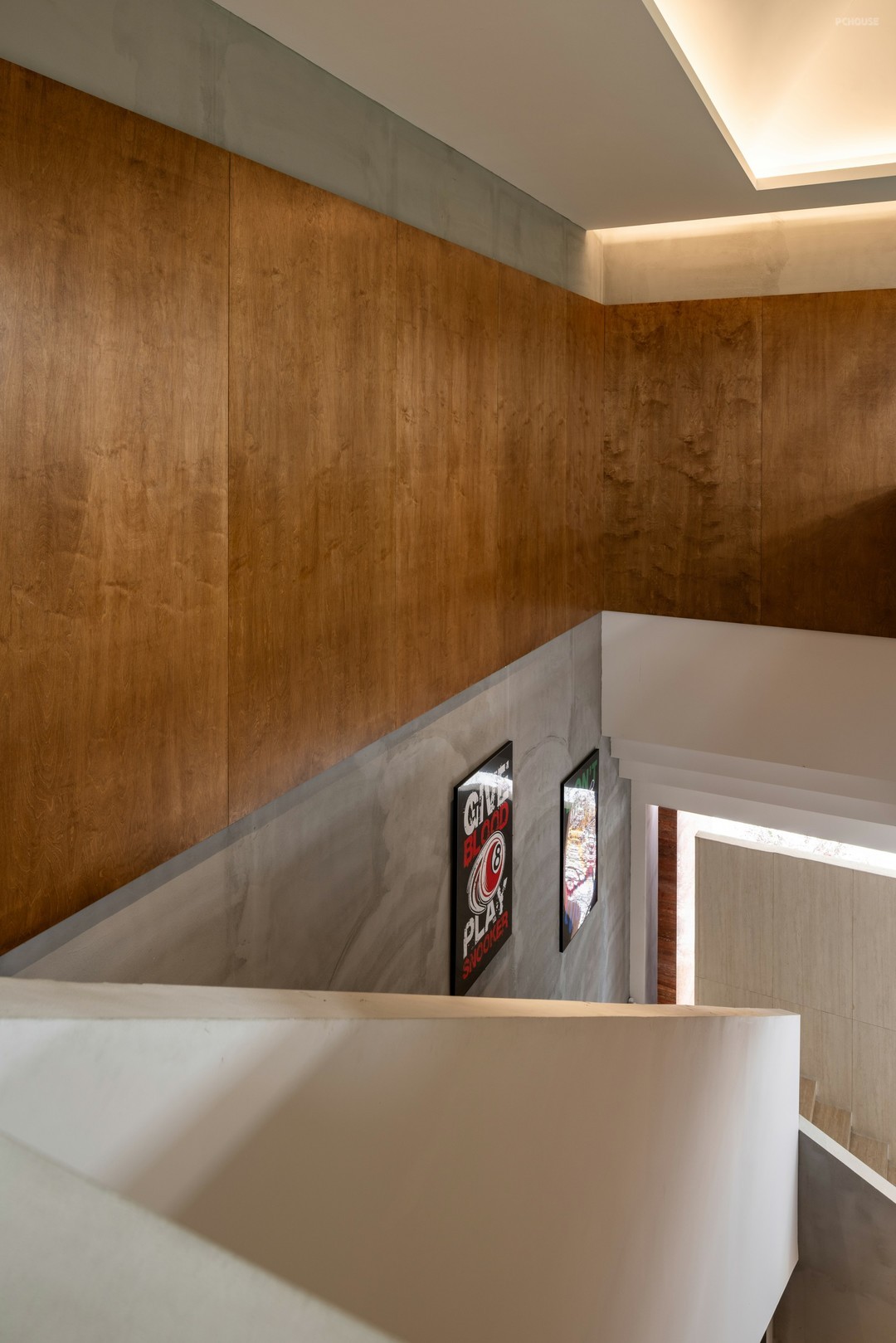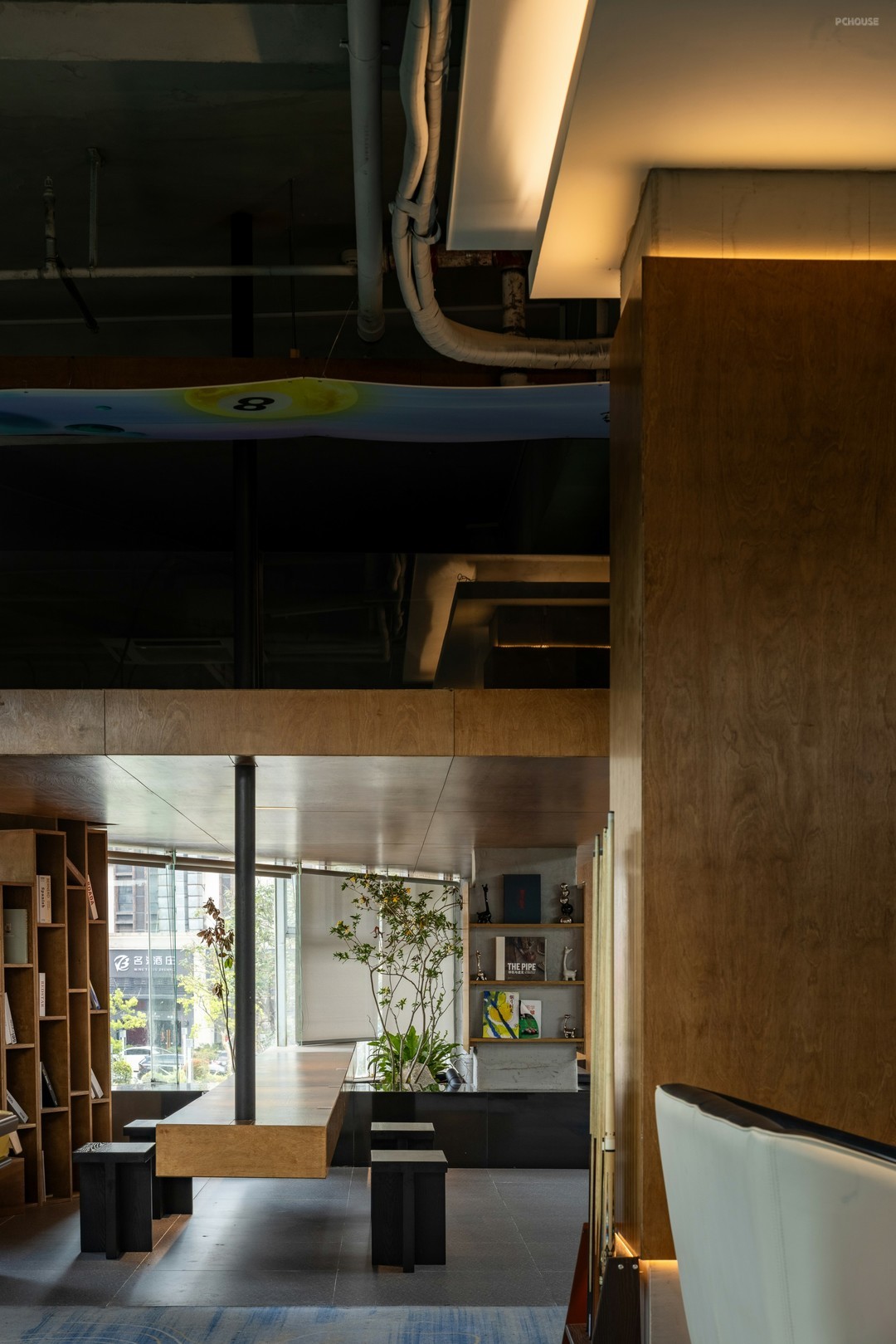 海报,在一众大地色系中彰显活力跳色与潮酷气质,链接桌球运动的挑战精神,行至二楼,可见组合挂画对海报的呼应。木饰面,沿楼梯间实墙铺展,让视觉重心往二楼空间转移。卡座与曲面相连,绿植交错成长,营造身临诗境的感觉。