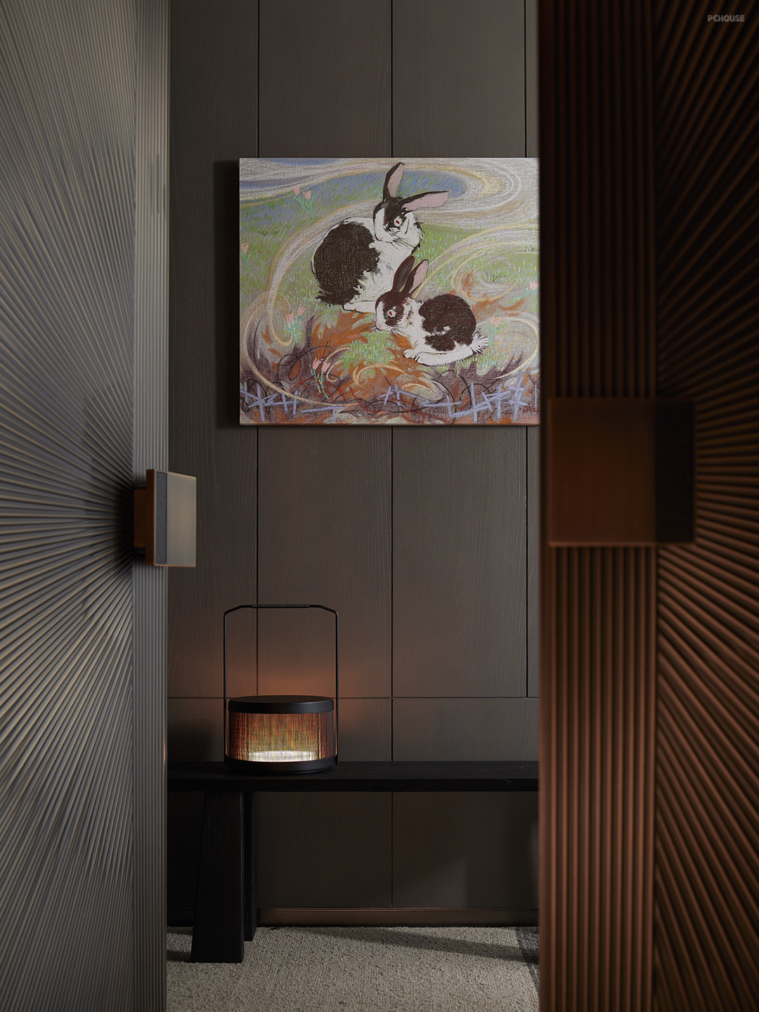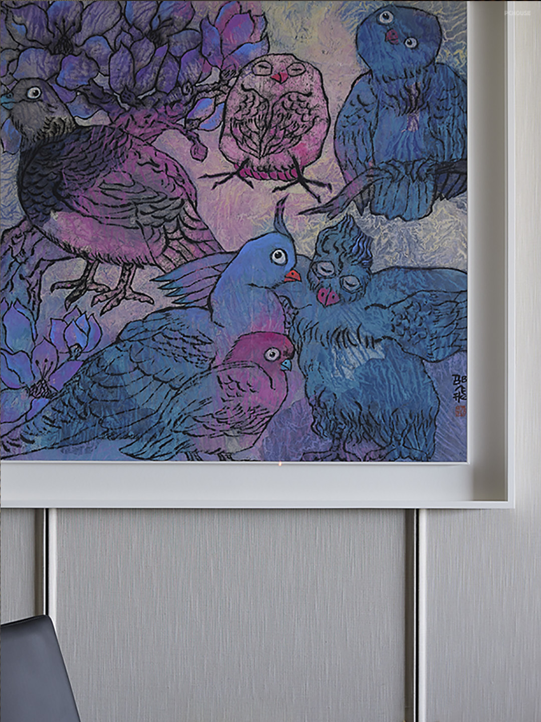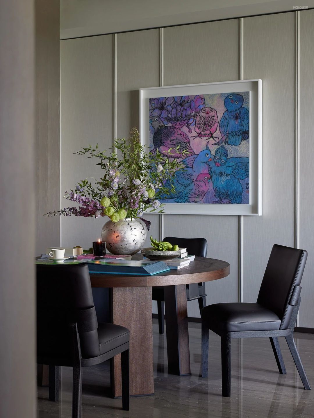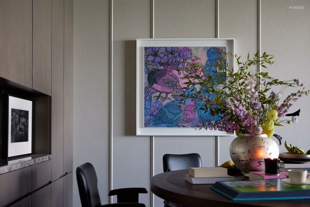 将艺术家邵飞的《春知道》作为精神基调停落在就餐区。鸟儿觅食题材自带欢愉,耳畔自然联想到啄食“咕咕咕咕”的声音,艺术家邵飞作品中有着东方民俗里的真诚质朴,又满载稚气与灵动、色彩明艳,点亮了整个就餐区。复古粉大飞燕配以点缀,与挂画相互呼应,共同营造出了一种春日氛围,将春天的明媚、生活的闲逸、自然地融入空间,让生活的每一刻都与自然紧密相连,每一次用餐都成为一场与美好邂逅的仪式。