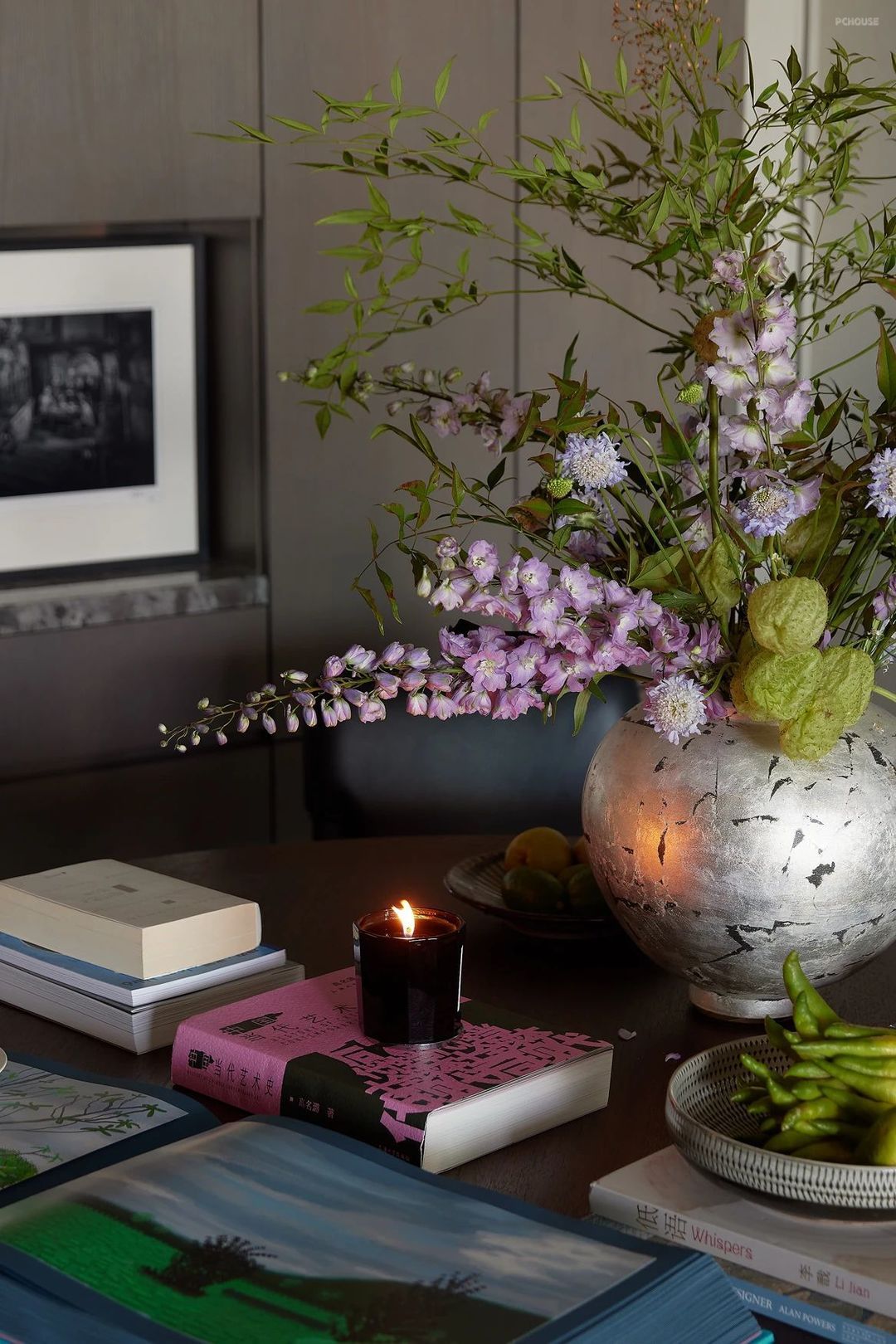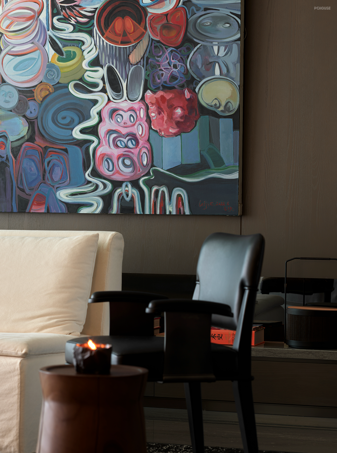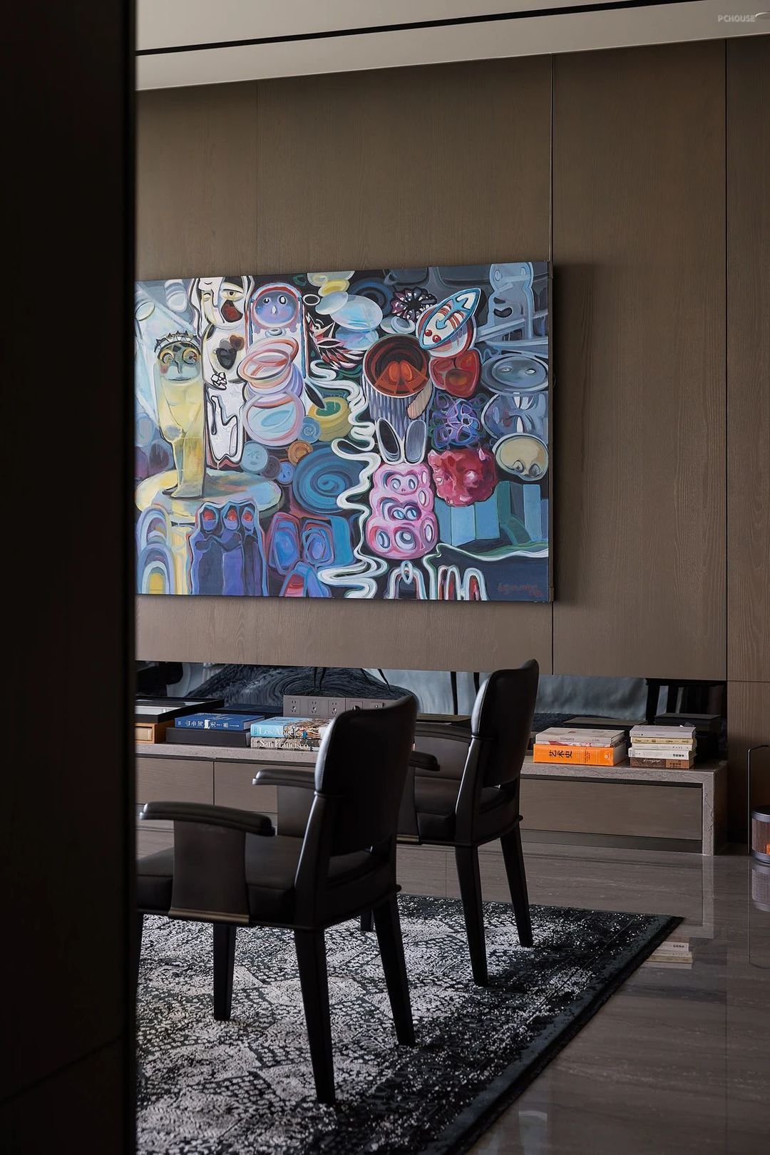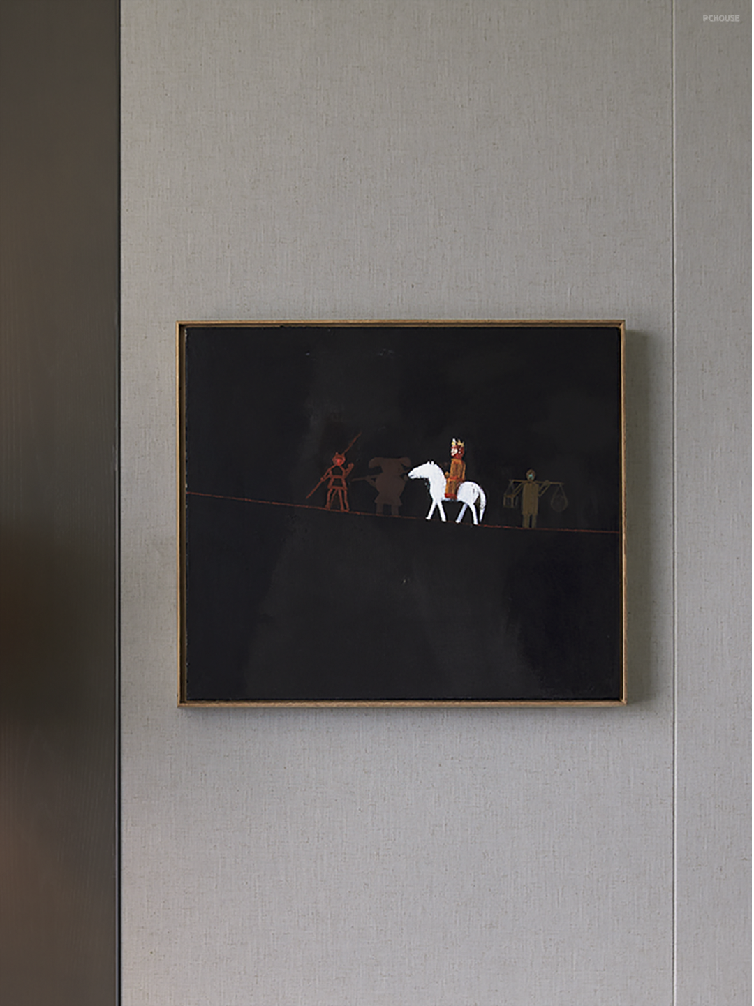 将艺术家邵飞的《春知道》作为精神基调停落在就餐区。鸟儿觅食题材自带欢愉,耳畔自然联想到啄食“咕咕咕咕”的声音,艺术家邵飞作品中有着东方民俗里的真诚质朴,又满载稚气与灵动、色彩明艳,点亮了整个就餐区。复古粉大飞燕配以点缀,与挂画相互呼应,共同营造出了一种春日氛围,将春天的明媚、生活的闲逸、自然地融入空间,让生活的每一刻都与自然紧密相连,每一次用餐都成为一场与美好邂逅的仪式。