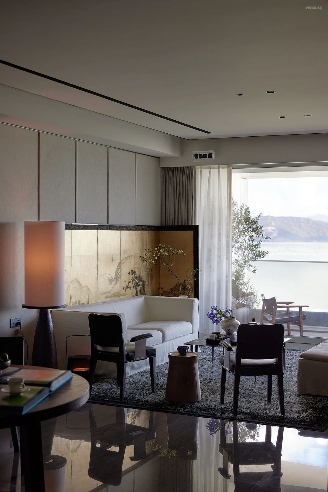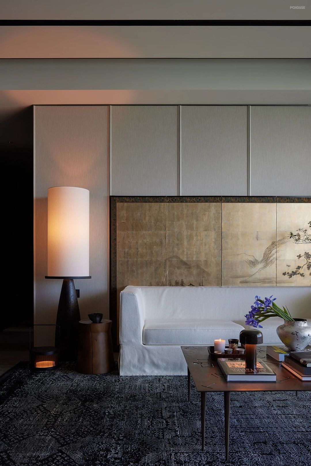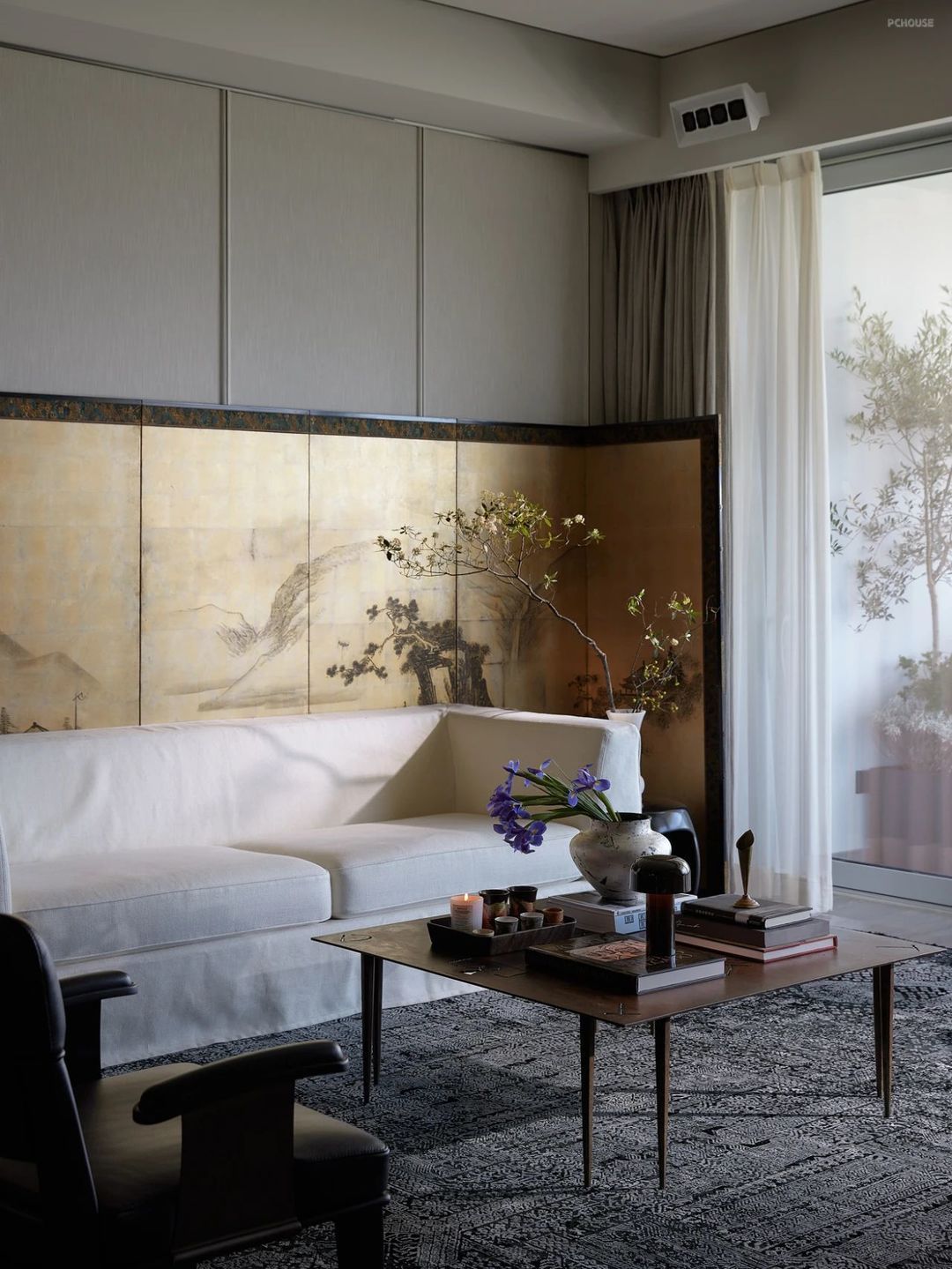 作为摄影爱好者,Alplus常年游走不同国度,掌控镜头的眼睛,对东西方的美拥有着敏锐的感知力。在系统梳理了Alplus的审美偏好,我们在会客区选品,关键词定调:凝练东方意蕴、克制的优雅、故事与沉淀感。日本回流的中古金箔屏风,与窗外海平面傍晚的落日余晖相互映衬。来自LIAIGRE 的 ROCCO沙发,硬朗的框架线条,勾勒出明确的体量。但当接触人身体的部分,松弛的线条又变得柔软起来。