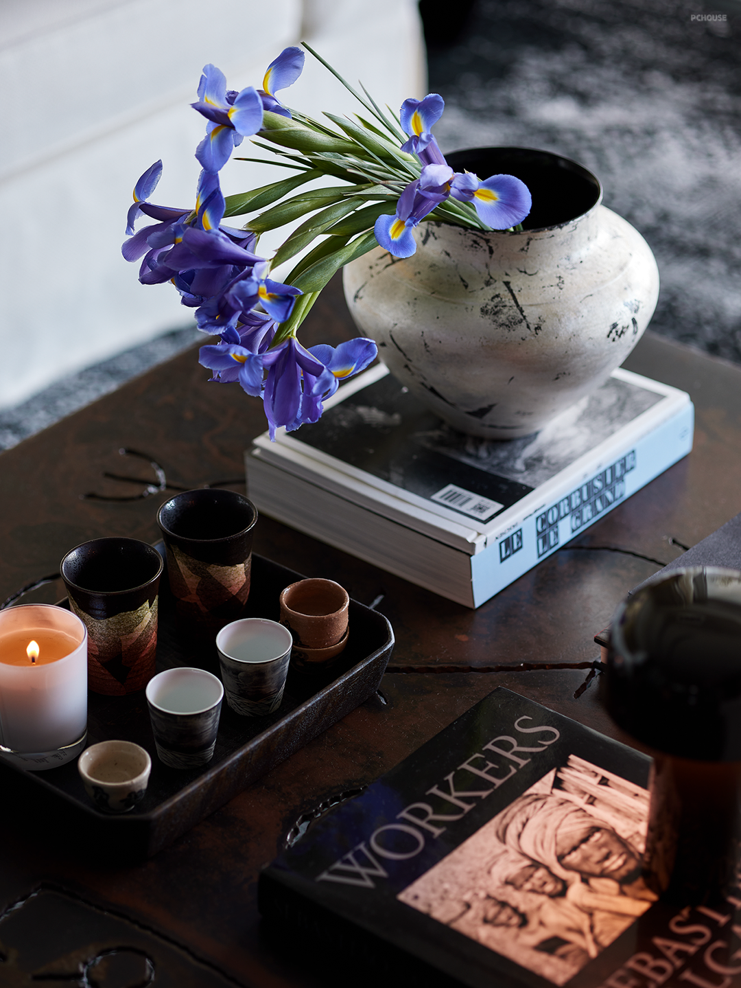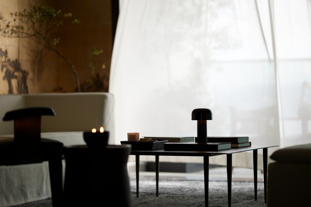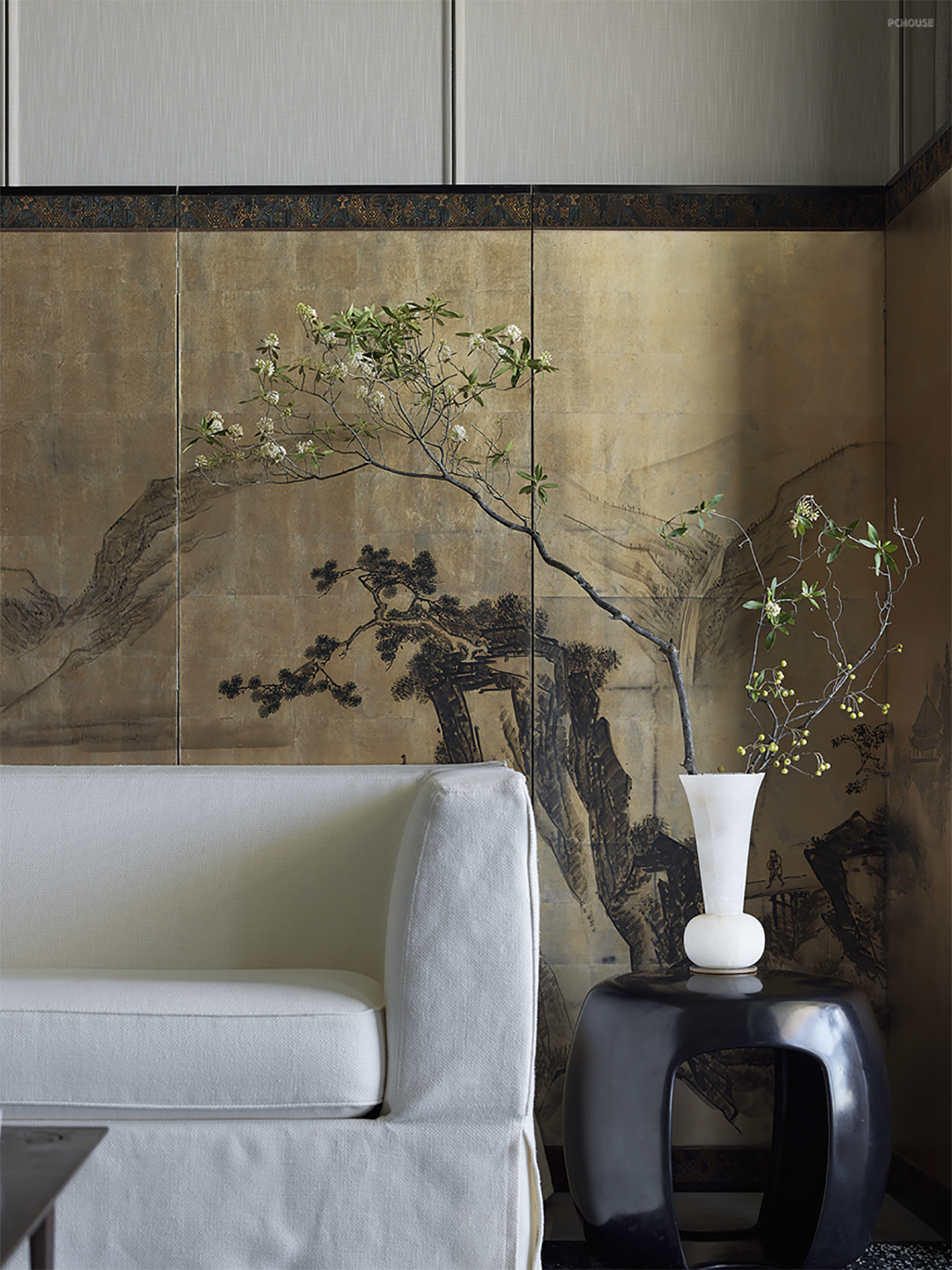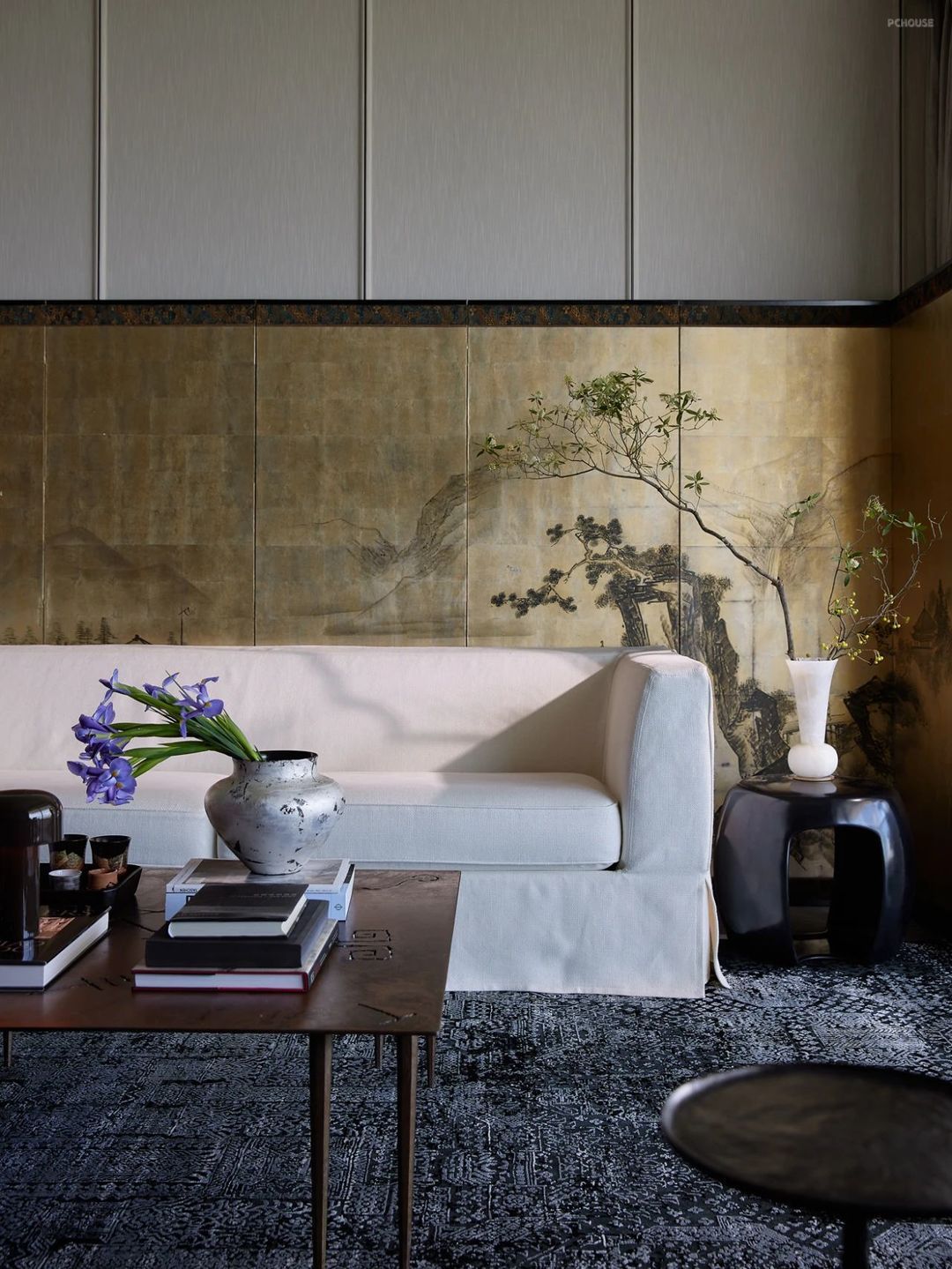 作为摄影爱好者,Alplus常年游走不同国度,掌控镜头的眼睛,对东西方的美拥有着敏锐的感知力。在系统梳理了Alplus的审美偏好,我们在会客区选品,关键词定调:凝练东方意蕴、克制的优雅、故事与沉淀感。日本回流的中古金箔屏风,与窗外海平面傍晚的落日余晖相互映衬。来自LIAIGRE 的 ROCCO沙发,硬朗的框架线条,勾勒出明确的体量。但当接触人身体的部分,松弛的线条又变得柔软起来。