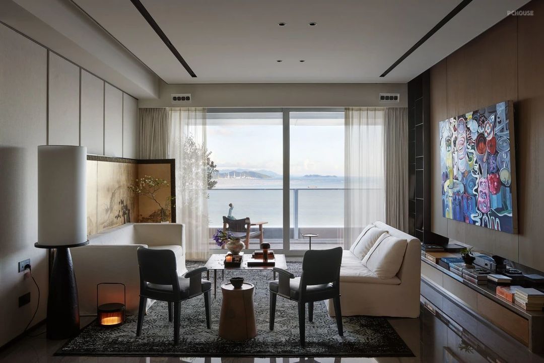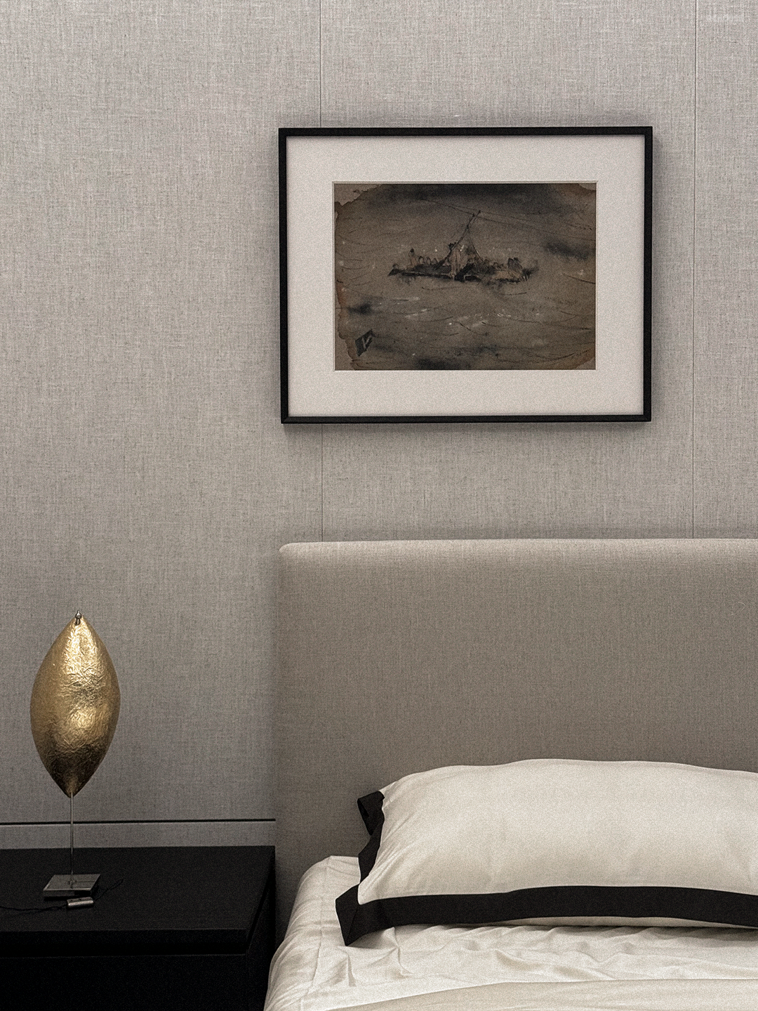 这是懒猫在项目中遇到的最有化学反应的客人之一,虽然房子是精装,满墙包裹,一脸严肃,当下主流,但每个窗外的海平面干净的正如杉本博司清晰的水平线,万里无云的天空,安静的海平面,室内该用什么来与这海面对话,成为我们思考的原点,自然与人对美的想象载体必然是“艺术”,在方案之前,感受先行,像一次意识流设计实践,感受对了才把它完善到设计构想里,每一件艺术品、家具都是从各处契机里寻来,在过程中不断深入,正如马轲的西游,过程就是取经的意义。