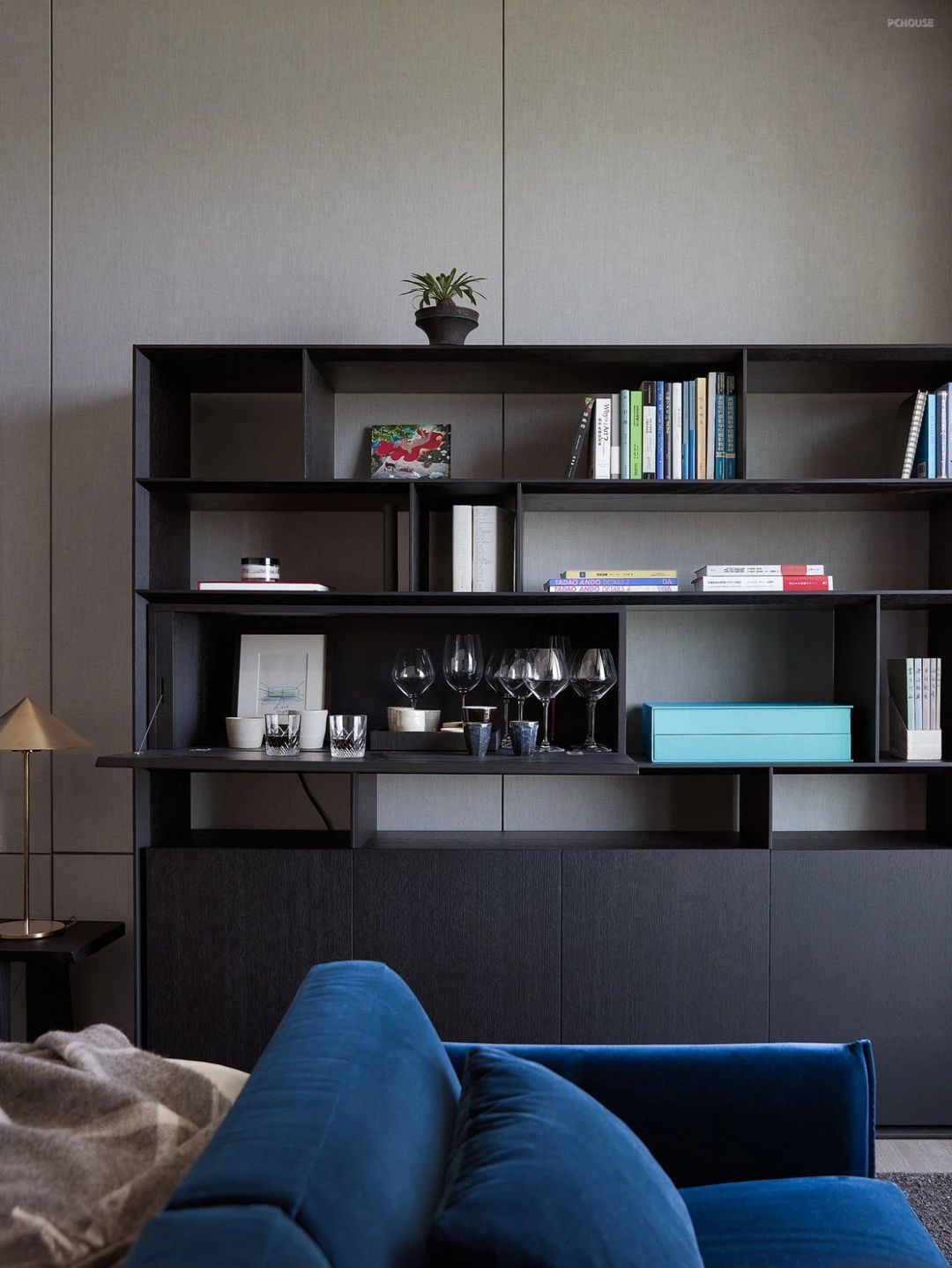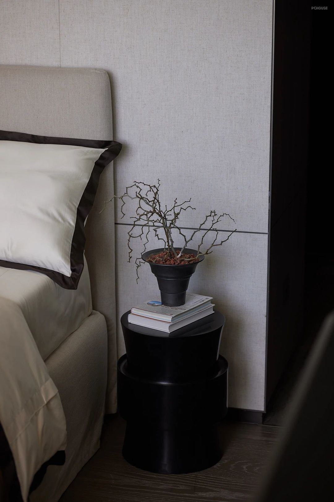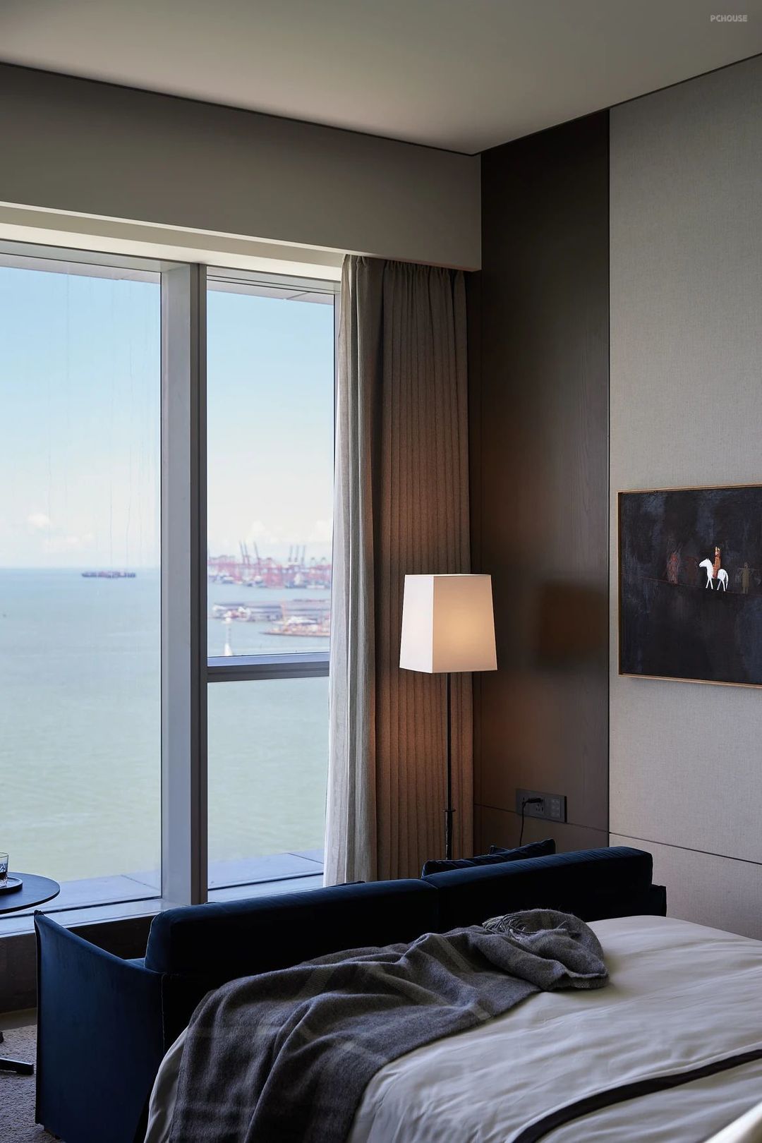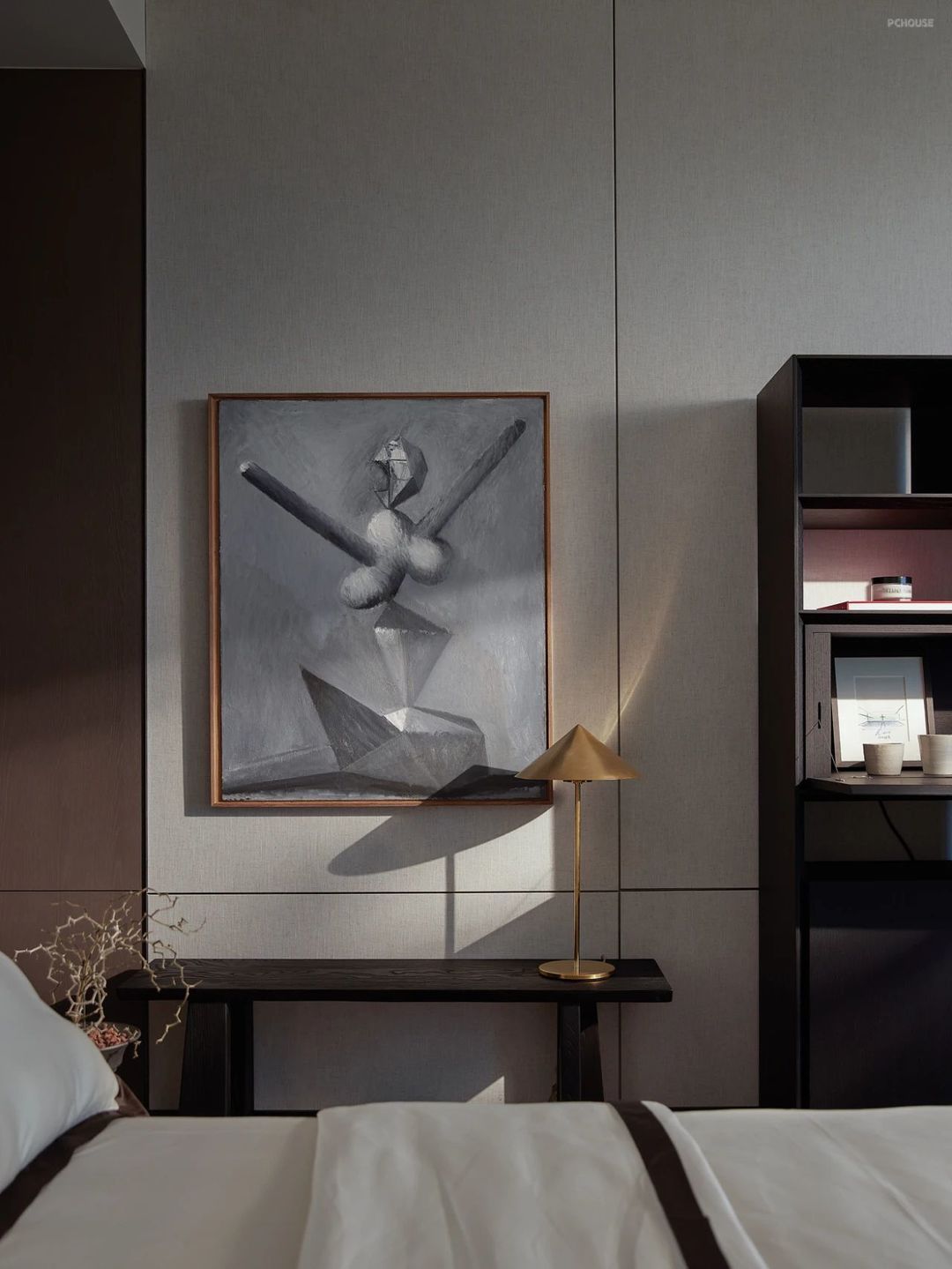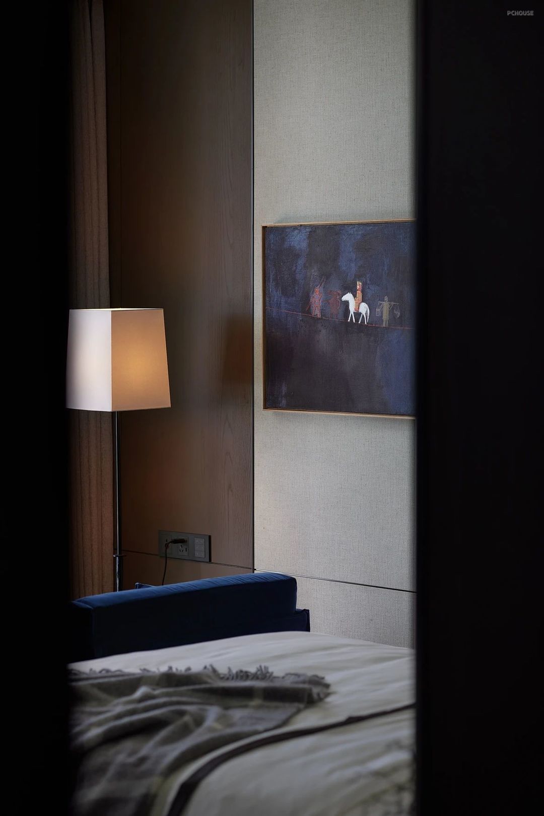 比起互动性较强的客厅区,睡眠空间氛围营造的重点更多在自我的对话。重新调整了床头方向,躺靠在床上视角自然望向窗外,视线无限延展,而床尾则可以更灵动的设置成休闲区,深蓝色的Cassina沙发、简洁流畅的Trepied落地灯、艺术家马轲的《西游记系列之出走(四)》让卧室氛围瞬间回到儿童时代,回到母胎的安宁。