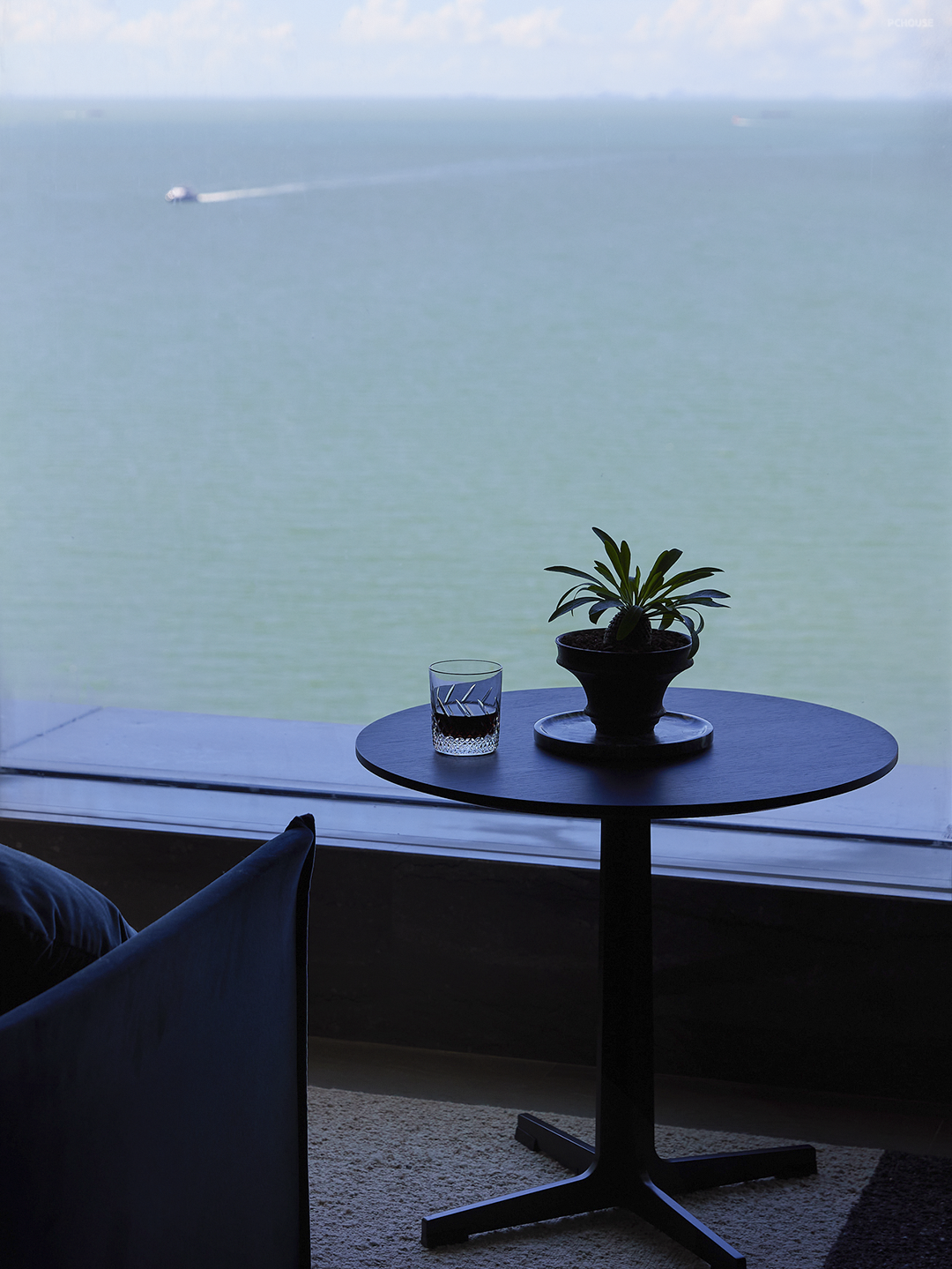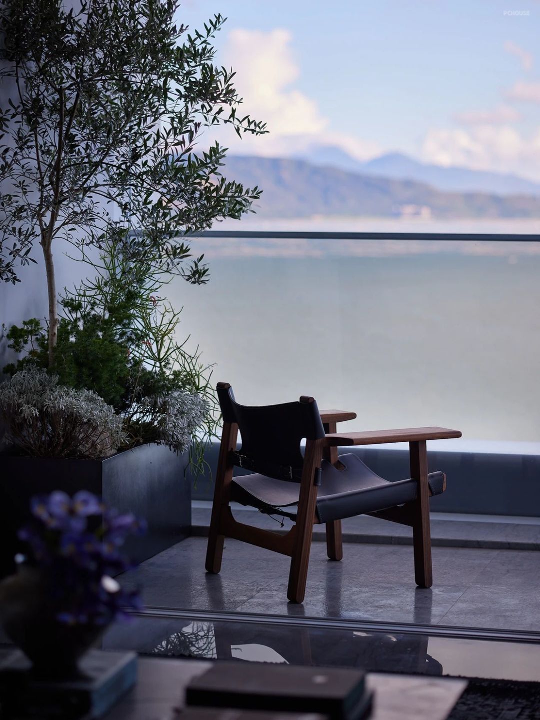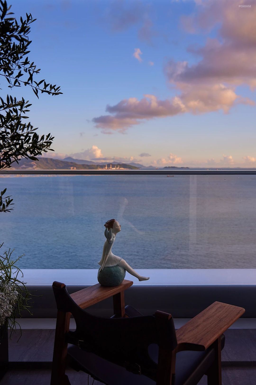 露台区域设置休憩小品,油橄榄与经典西班牙椅互为映衬,便将热带海岛度假氛围营造出来。没有被窗框束缚,留住了这一方与户外相连的自在天地。抬眼便是无垠大海,视野毫无遮拦,海面波光粼粼,像是无数细碎的钻石在日光下闪烁。海风裹挟着淡淡的咸湿气息,轻柔地抚过脸颊,撩动发丝,吹走所有的疲惫与纷扰。