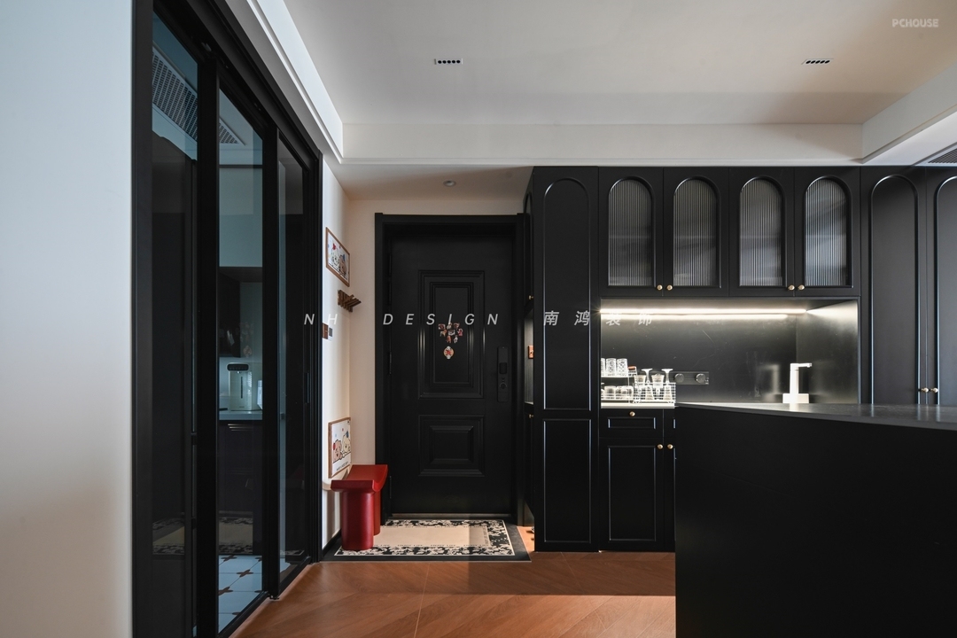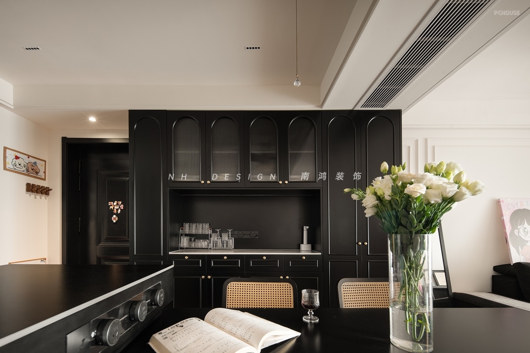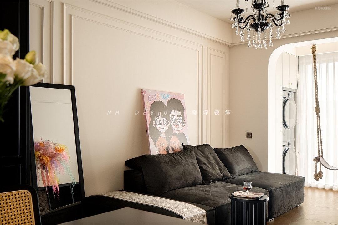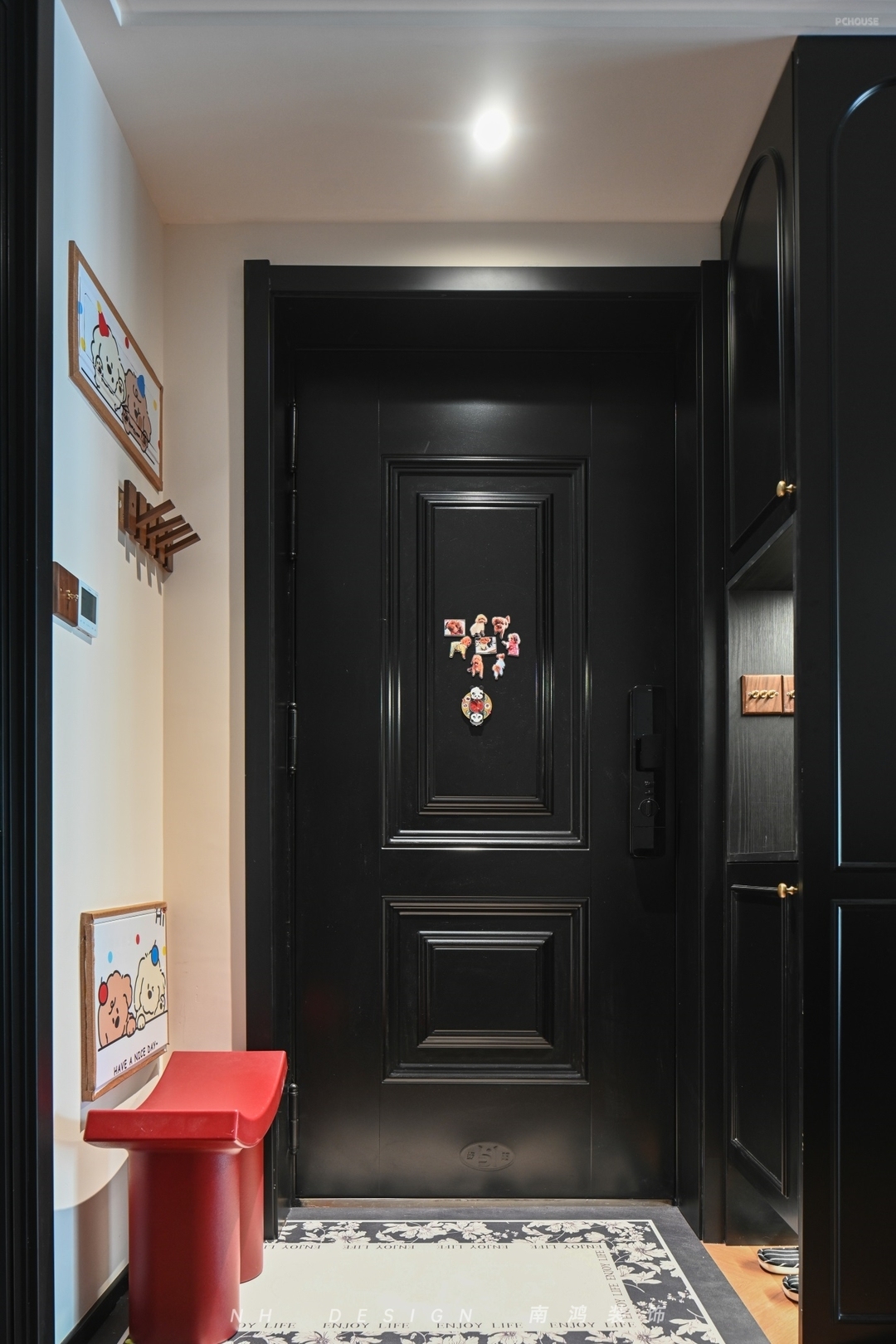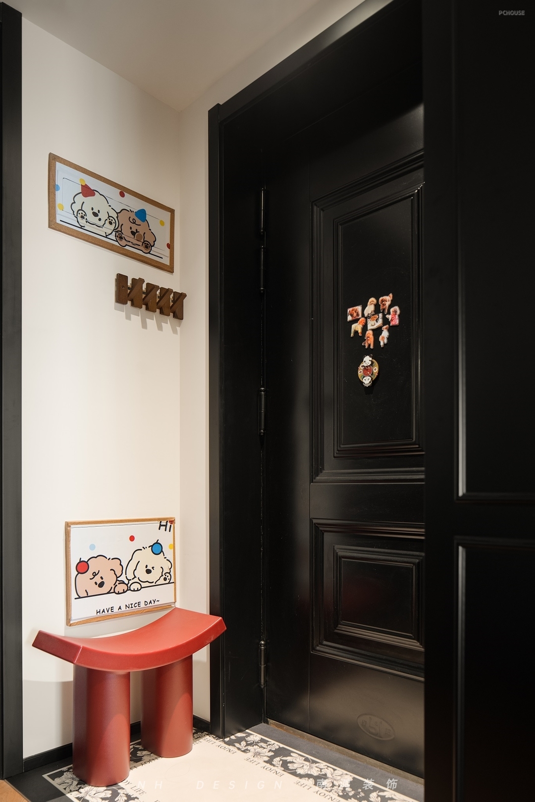 前言: 本案是一套女业主购置的预备婚房,小姐姐钟情于深邃的黑色以及复古元素,家中还有两只可爱活泼的泰迪犬。在设计需求上,她希望这所空间既能表达复古美学的高级感,又能为毛孩子留出专属生活区。