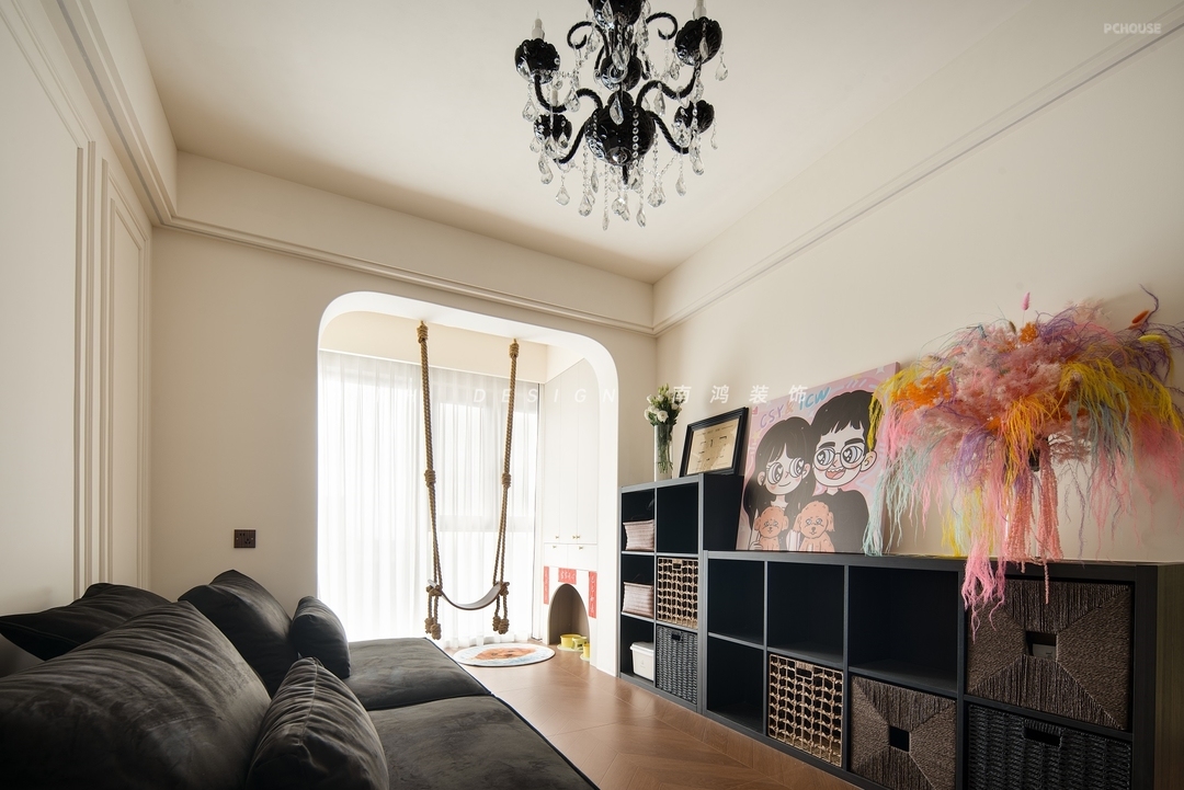 客厅舍弃了传统电视机的模式,取而代之的是一排黑色中古矮柜,既方便日常收纳,又散发出经久不衰的摩登质感。墙面留白,佐以线条勾勒,顶面配水晶吊灯,浓郁了一室复古氛围。