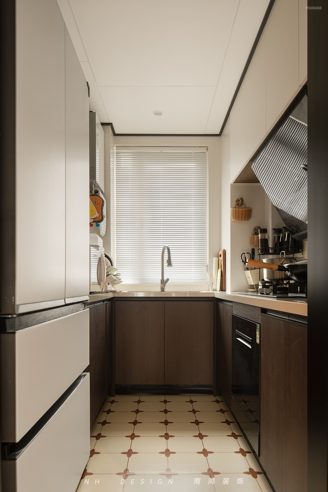 厨房地面选用复古咖色小花砖,与暖调木纹地柜形成细腻的色彩呼应,营造温馨而不失格调的烹饪空间。整体通过U型布局流畅了下厨动线,嵌入式厨电与柜体严丝合缝,保证空间的极致清爽。