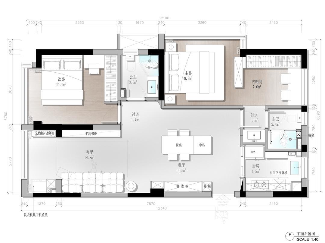 ④原主卧及主卫改为次卧与公卫,解决次卧去卫生间较远的问题。