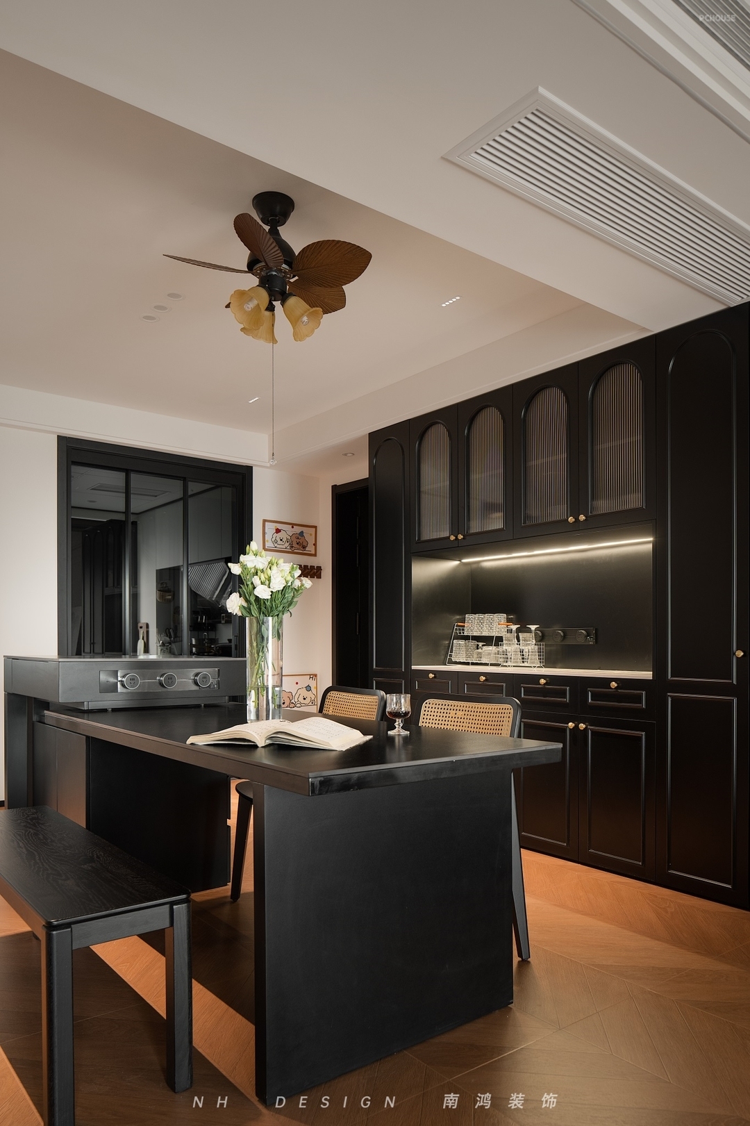 餐厅配备岩板岛台并安装插座,满足多人火锅宴聚需求。侘寂风原木餐桌搭配长凳与藤编餐椅,通体的黑色维持视觉的高度统一。顶面选配风扇灯,扇叶转动间,流转出独特的工业复古情调。