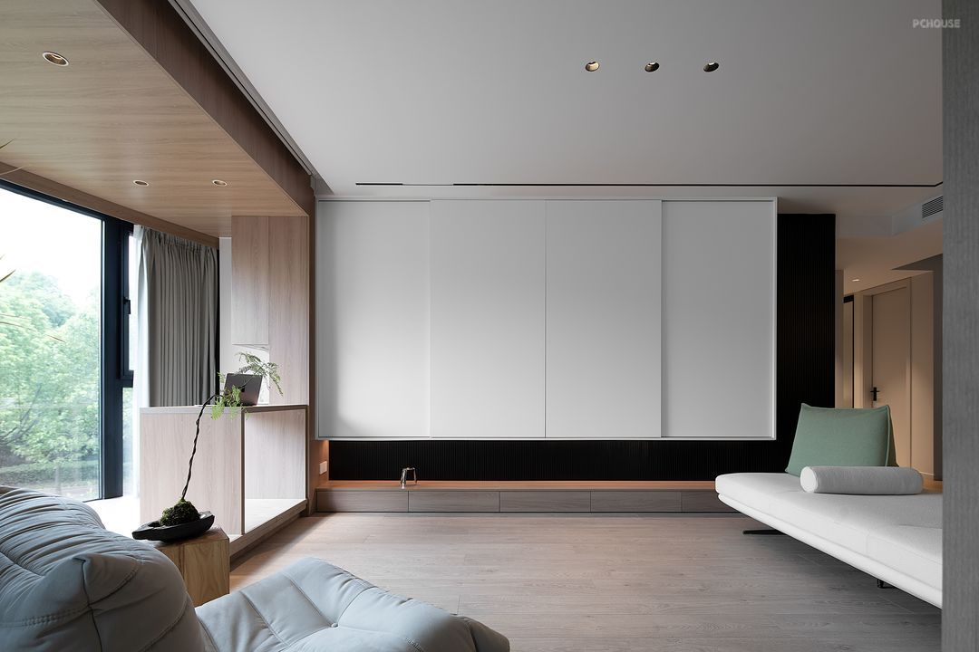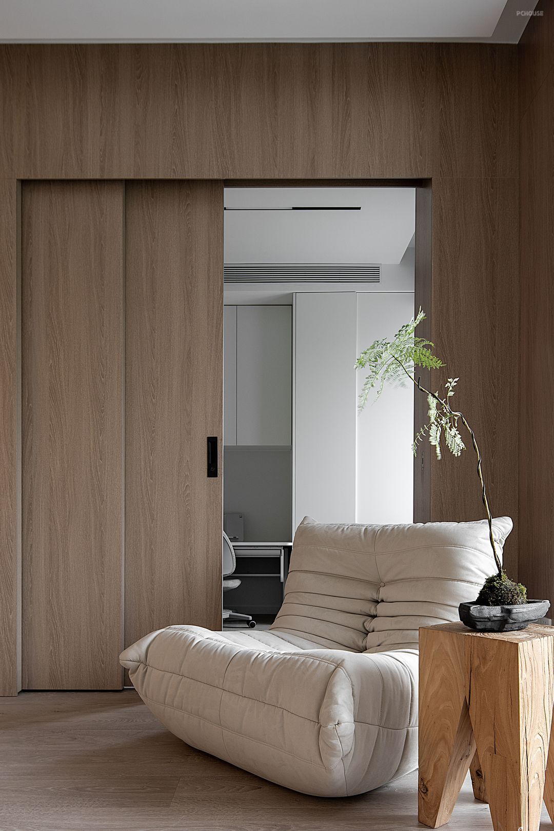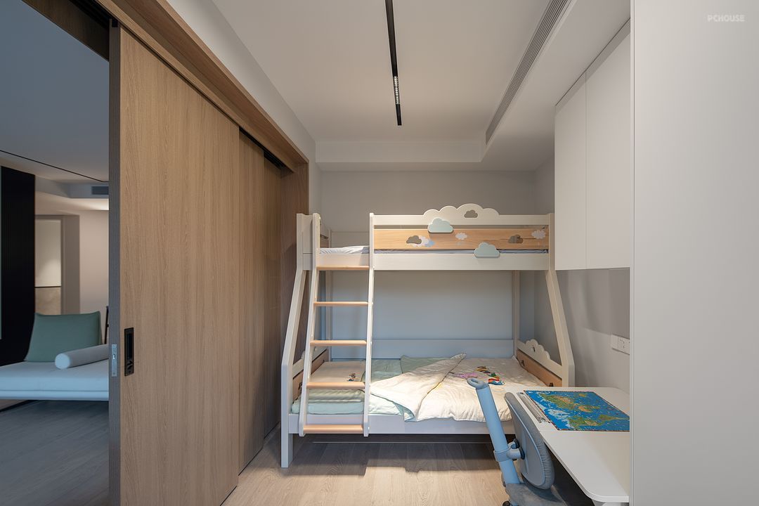 1. 为了增加整体的空间通透感,儿童房可以与客厅有更多的互动,我们拆除了儿童房的隔墙,采用木制移门进行隔断,在移门推开时,就能与客厅空间连为一体,使得整个客厅区域的活动空间都得到极大的扩充,空间感得到提升,同时也扩大儿童房的尺度感形成良好的交互。
