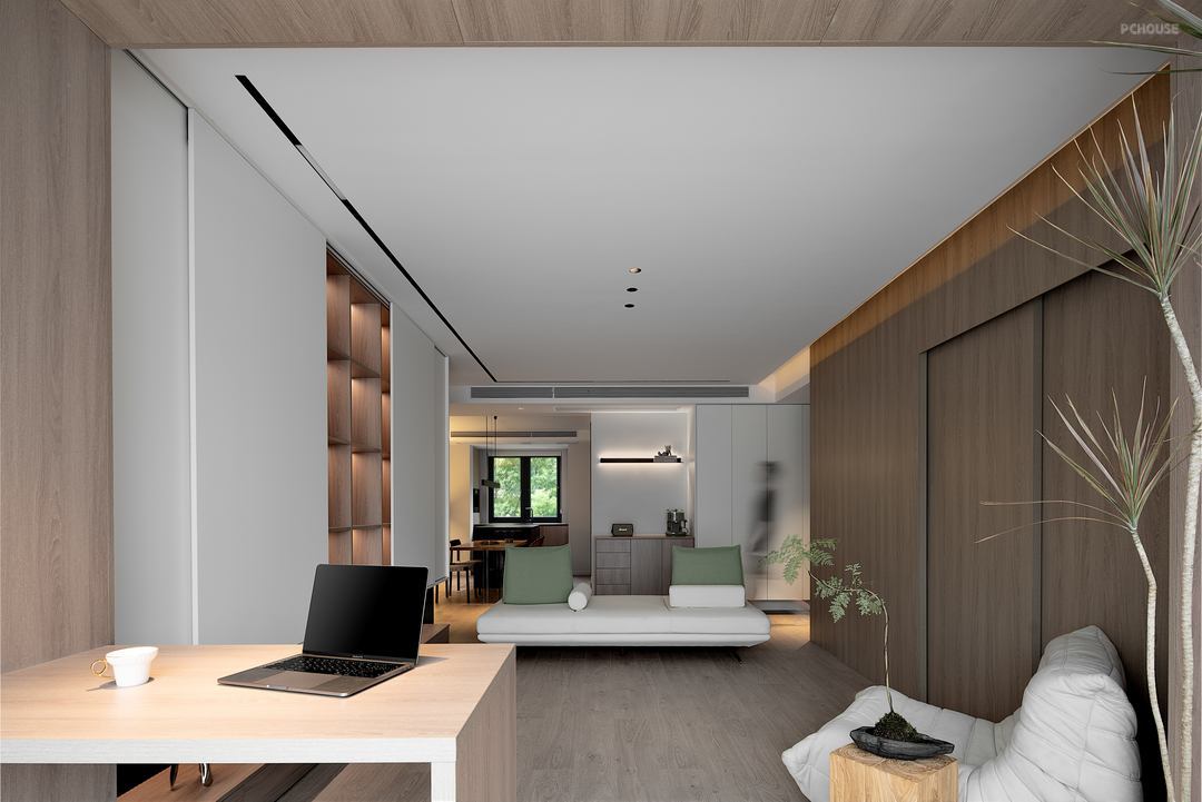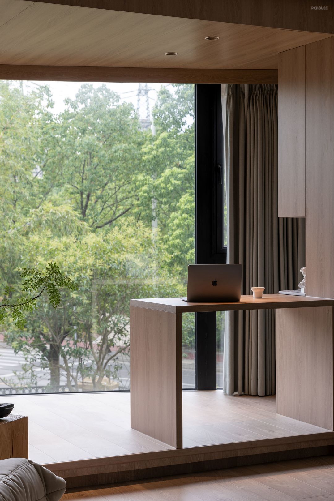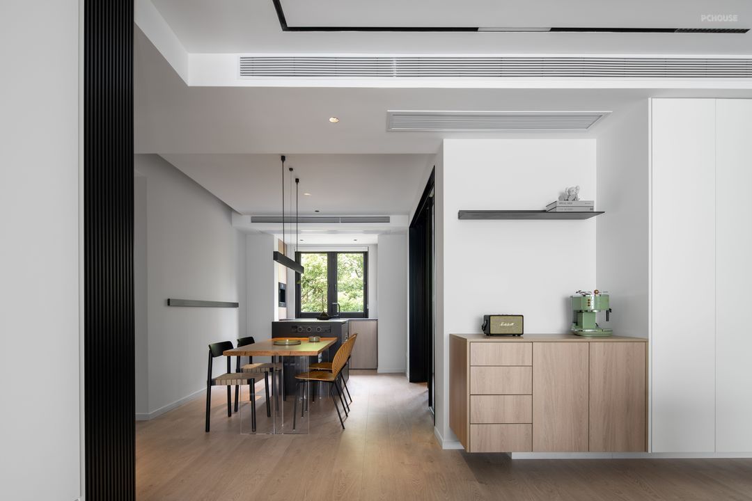 温润自然的实木悬浮桌,酷感硬朗的线条灯光,平衡了这个空间的阴与阳,硬与柔的平衡美感。