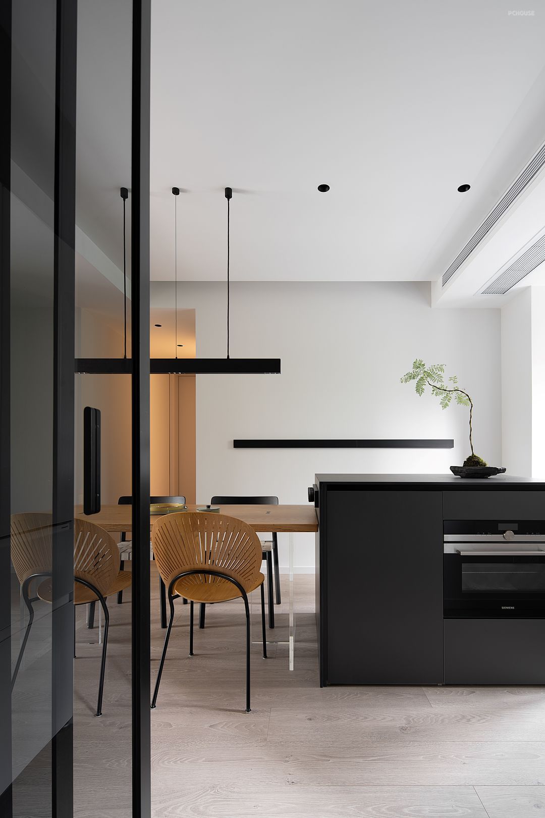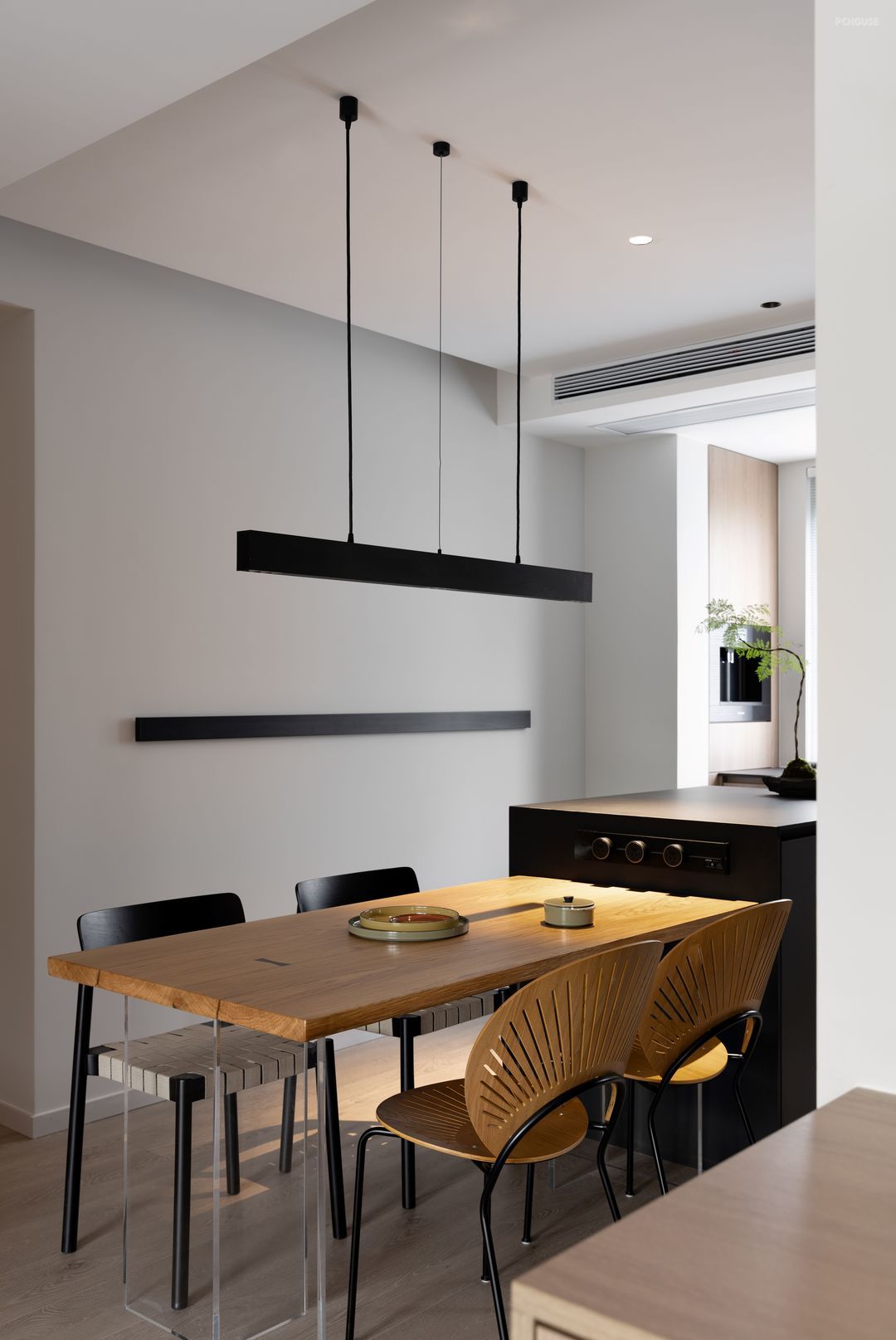 为了增加餐厅的实用功能,设计成为岛台+餐桌的形式,岛台和餐桌总长为3米,满足不同操作形态下不同的高度,且相互成就增加延伸感,原木材质的餐桌和黑色的岩板岛台,与室内的材质相互呼应。