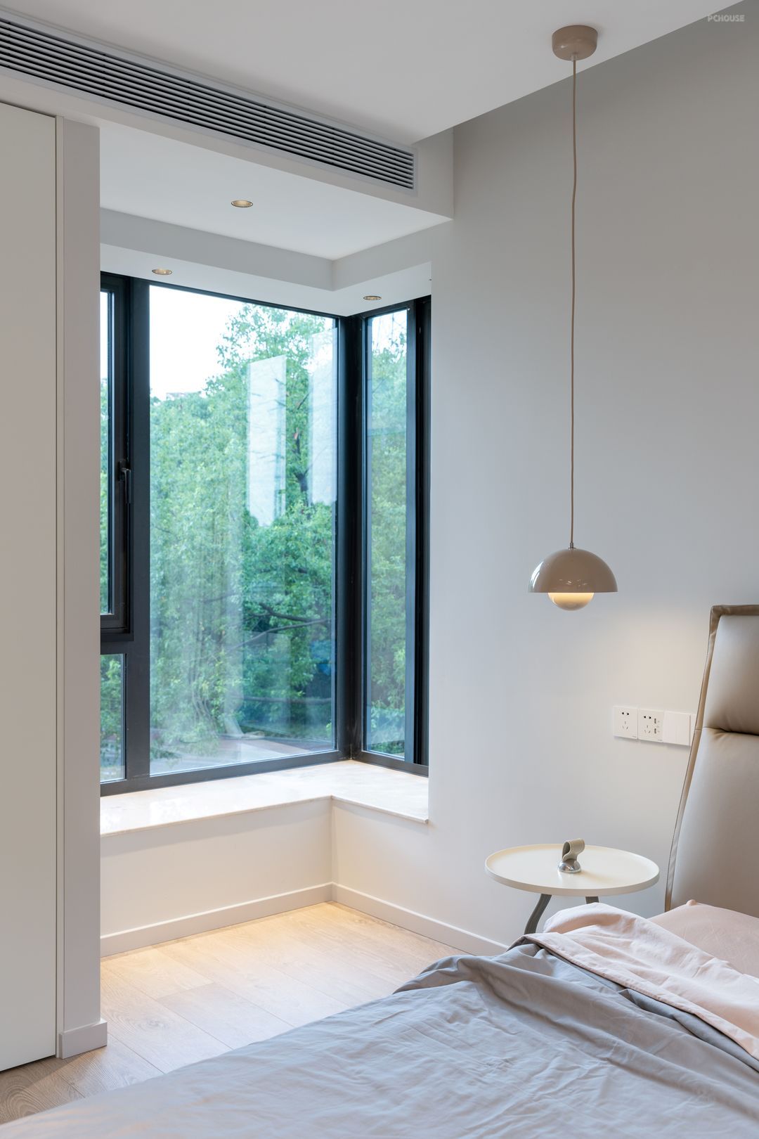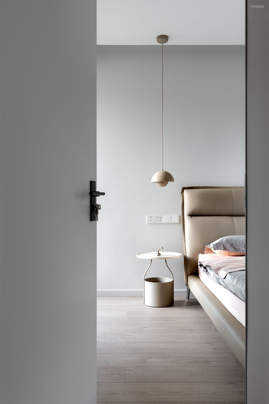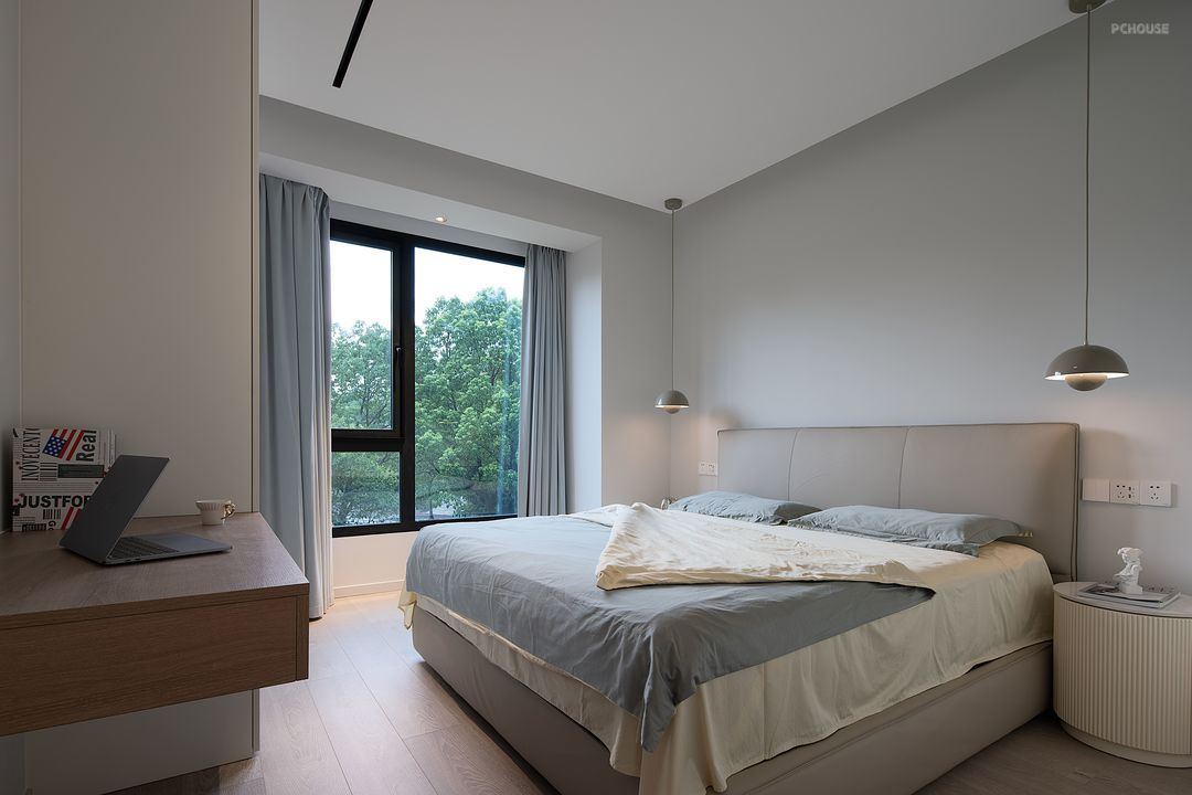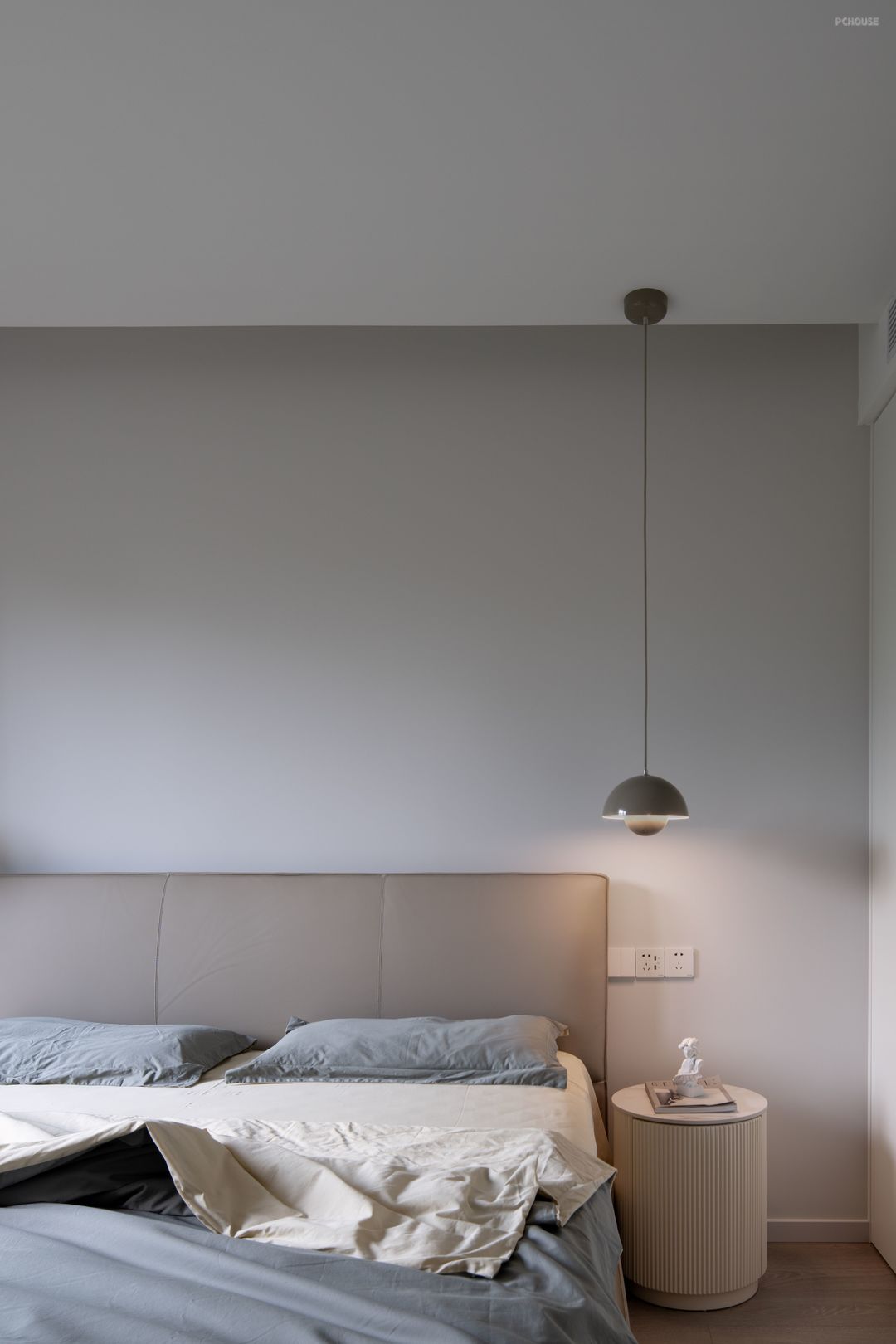 主卧室的空间保持舒适的宁静感,悬浮顶与磁吸灯的设计避免躺在床上灯光直射眼睛,对称小吊灯的设计为阅读带来更柔和的光感。