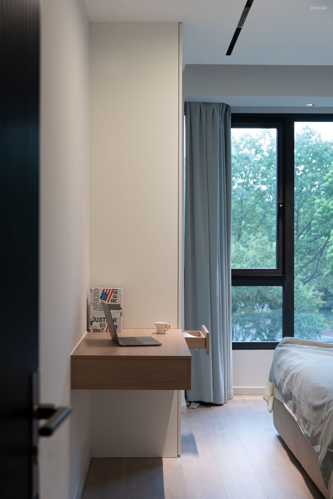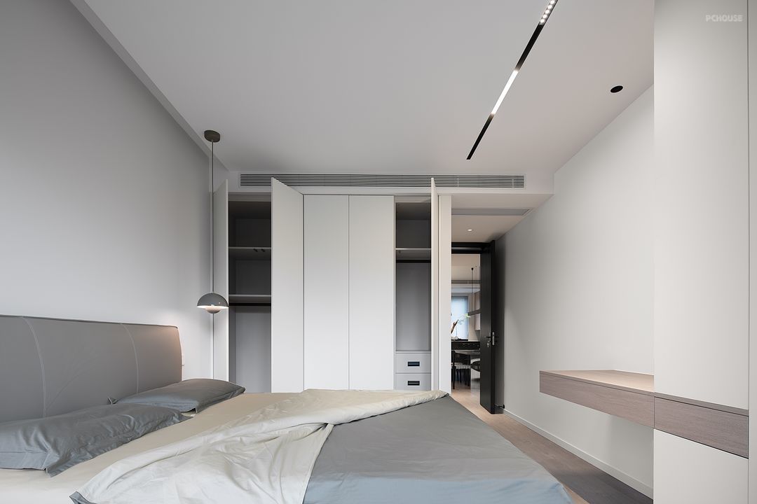 为了保证空间有足够的收纳,在床侧和床尾分别设计了通顶的衣柜, 考虑到梳妆台的需求,床尾的采用了衣柜+悬空梳妆台的组合,这样的形式,即解决必需的使用功能而不影响过道的闭塞感。