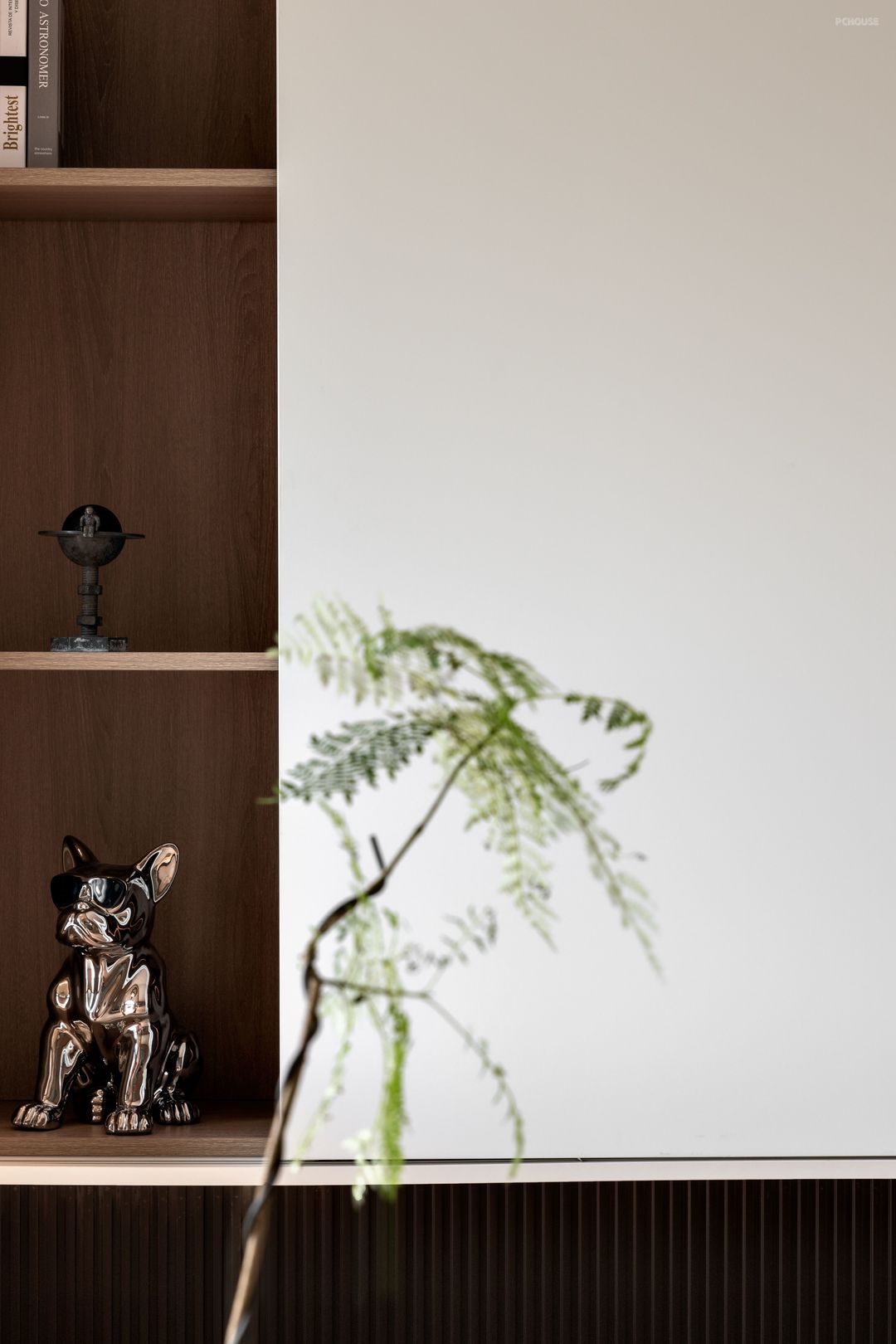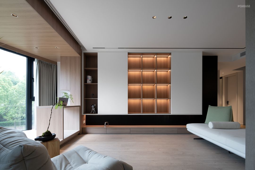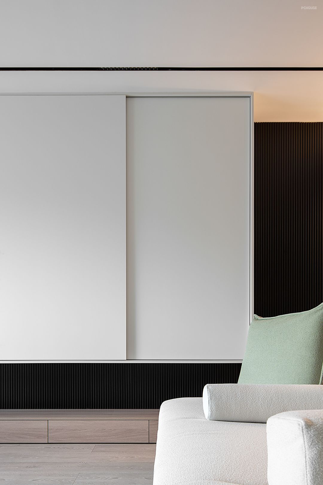 在与屋主夫妻沟通时,当时就明确提出家中不需要电视机,不过有大量的书籍需要收纳和展示,因此原始的电视背景墙被设计成书柜样式,不但解决了书籍收纳的需求,并且把书柜布置在客厅区域,也与亲子互动区形成了功能结合,同时在阳台吊顶处设计了隐藏投影幕布,实现家庭影院兼书墙自由
