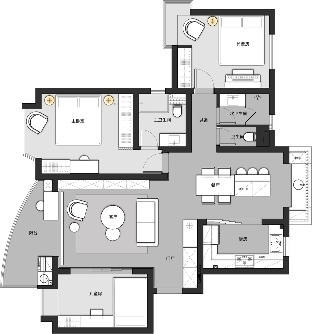 前言: 家,是每个孩子成长的摇篮,是每个孩子栖息的港湾。如何在满足孩子与大人的需求前提下,营造出舒适而又质感的空间氛围,是设计师对有娃家庭的首要考虑因素。本案围绕这幸福的三代同堂之家展开,屋主夫妻都是企业高管,有一位6岁的萌娃,因为夫妻俩工作繁忙,工作日都是爷爷奶奶照顾萌娃。在与设计师沟通时,屋主表示,希望这个家能给孩子带来舒适的成长环境,将主要活动区域都集中到公共空间,不仅需要有一家人互动沟通的区域,也要有学习工作的空间,能在此与孩子共同成长。