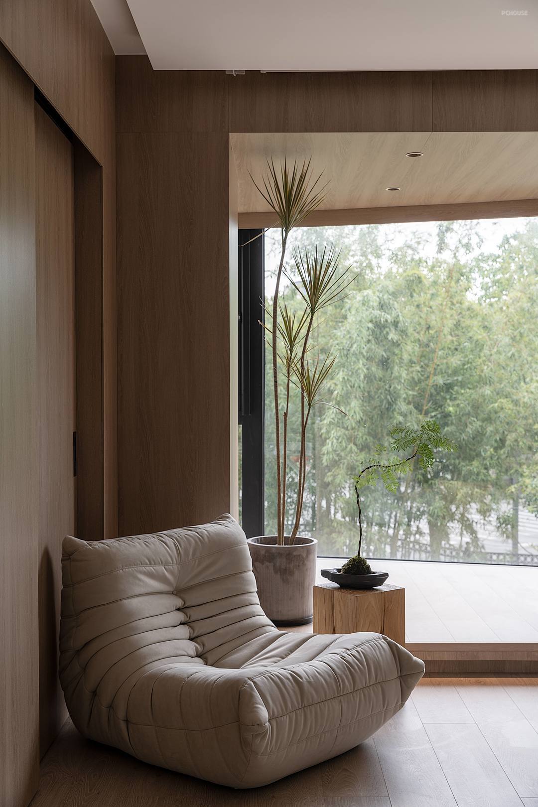 4. 原阳台宽度比客厅的整体宽度更大,北阳台做为西厨之后南阳台承担了功能阳台与休闲阳台的重任,新风解决通风问题,阳台大落地玻璃把窗影最大化的映入室内,在客厅的视觉盲区位置解决洗烘的功能,设置隐藏式晾衣架