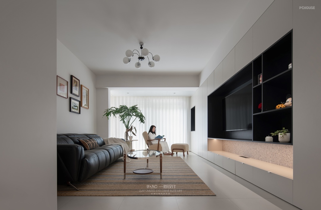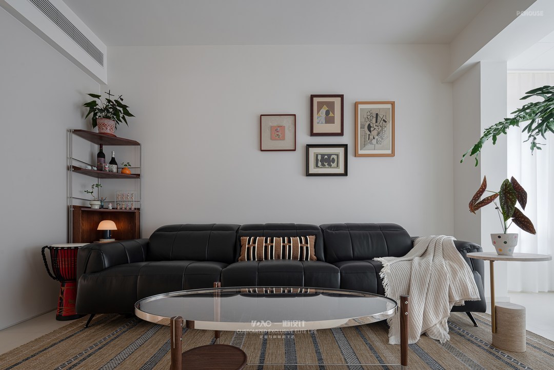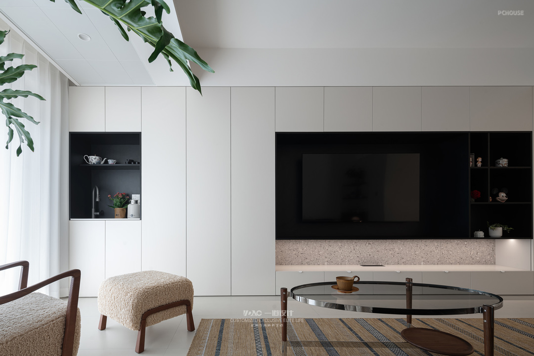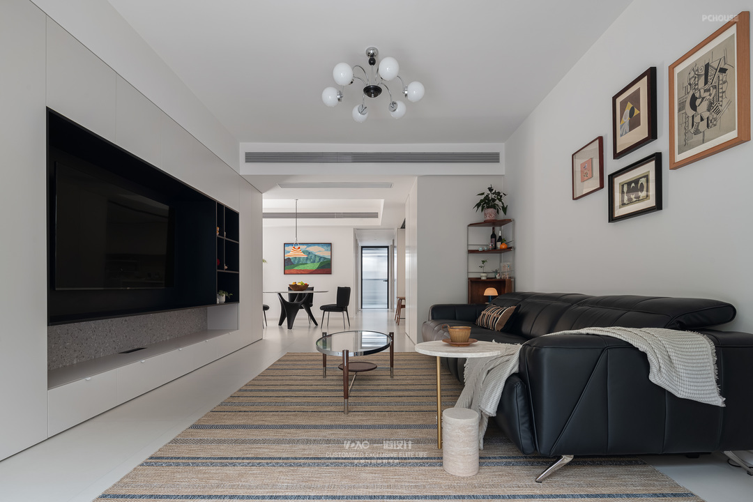 电视背景墙与门口台盆一体化设计,实现美观与实用的完美融合。客厅沙发区域铺设竹编毯,其易清洁特性契合日常需求,同时增强空间整体连贯性,营造和谐统一的视觉效果。