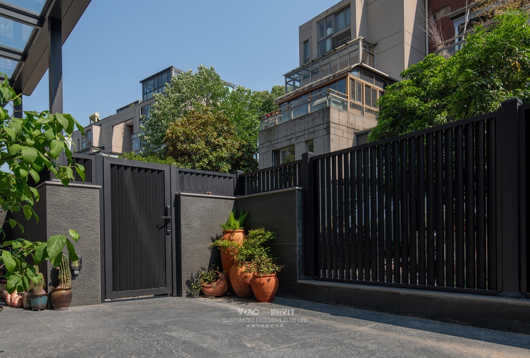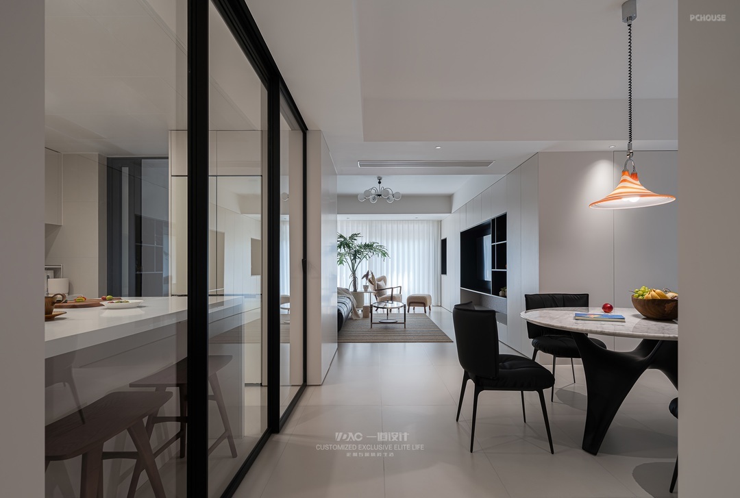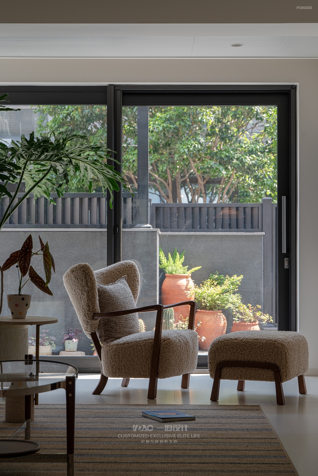 餐桌一侧,刚好是采光天井,以玻璃构筑通透阳光房,将自然光最大限度引入室内。搭配休闲椅与边几,自然生成惬意舒适的休憩角落。