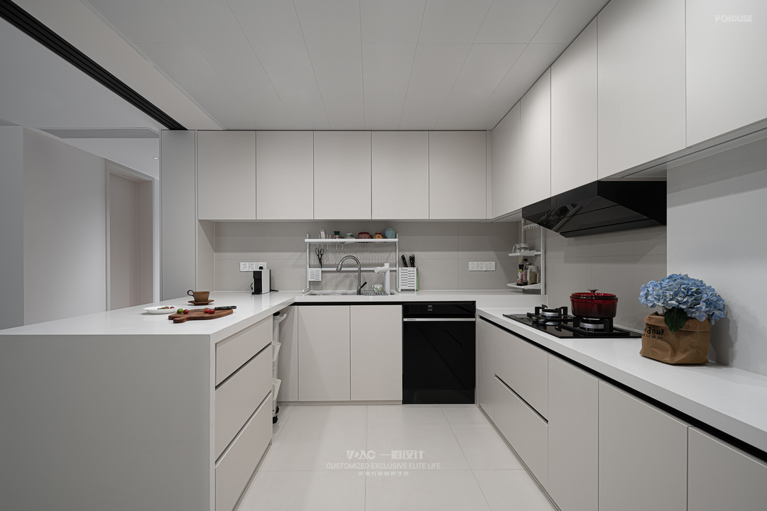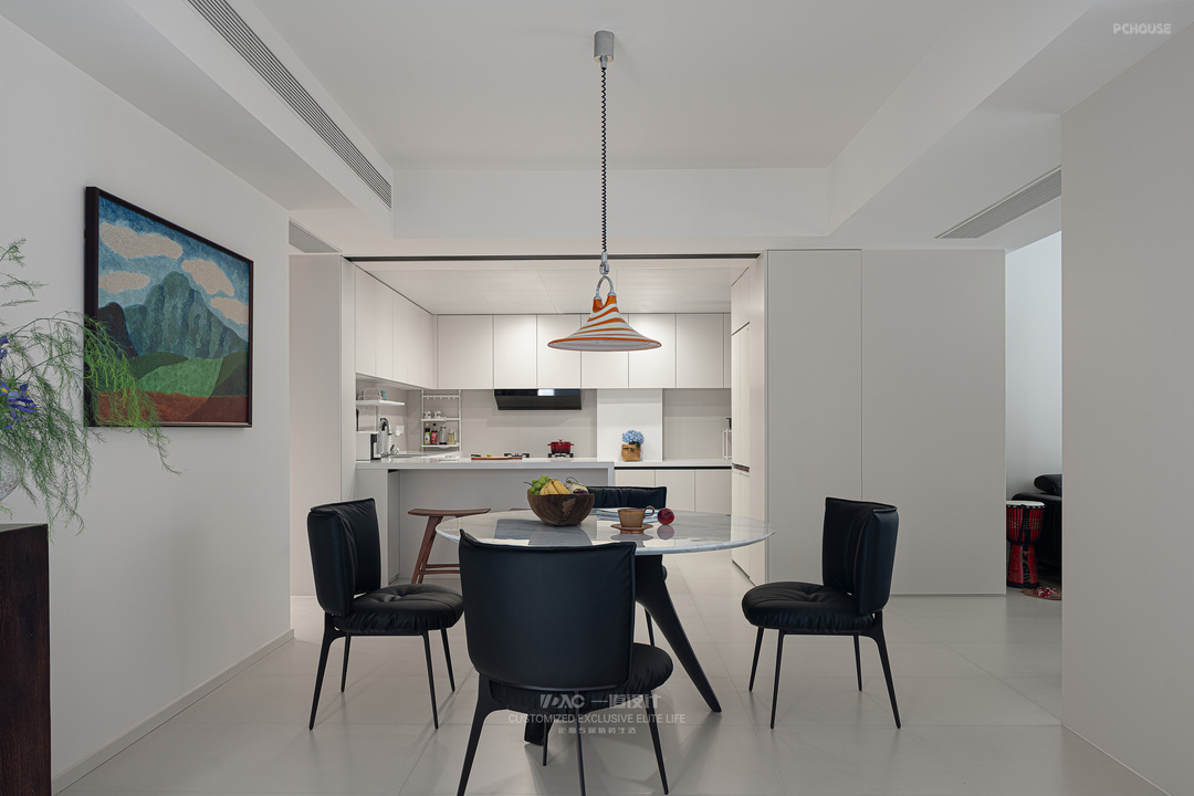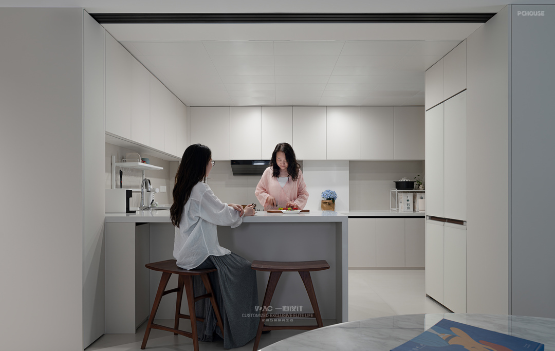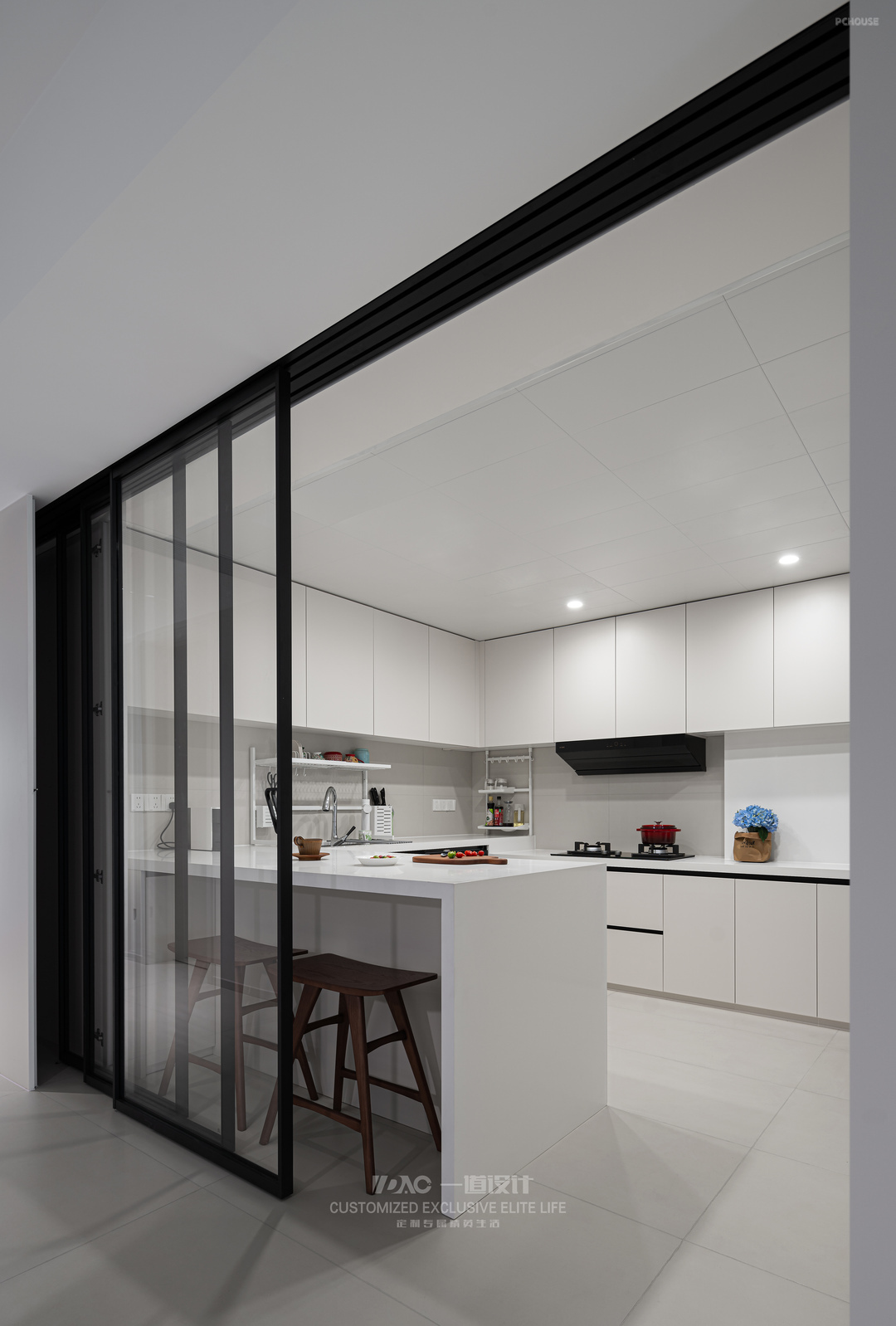 原本封闭的厨房空间,做成了开放式空间。把移门藏进了墙体里,也解决了油烟的问题。将台面延伸增设出吧台的位置,吧台既可以是操作台面又是厨房的中转区,也可以在这边品茶喝咖。